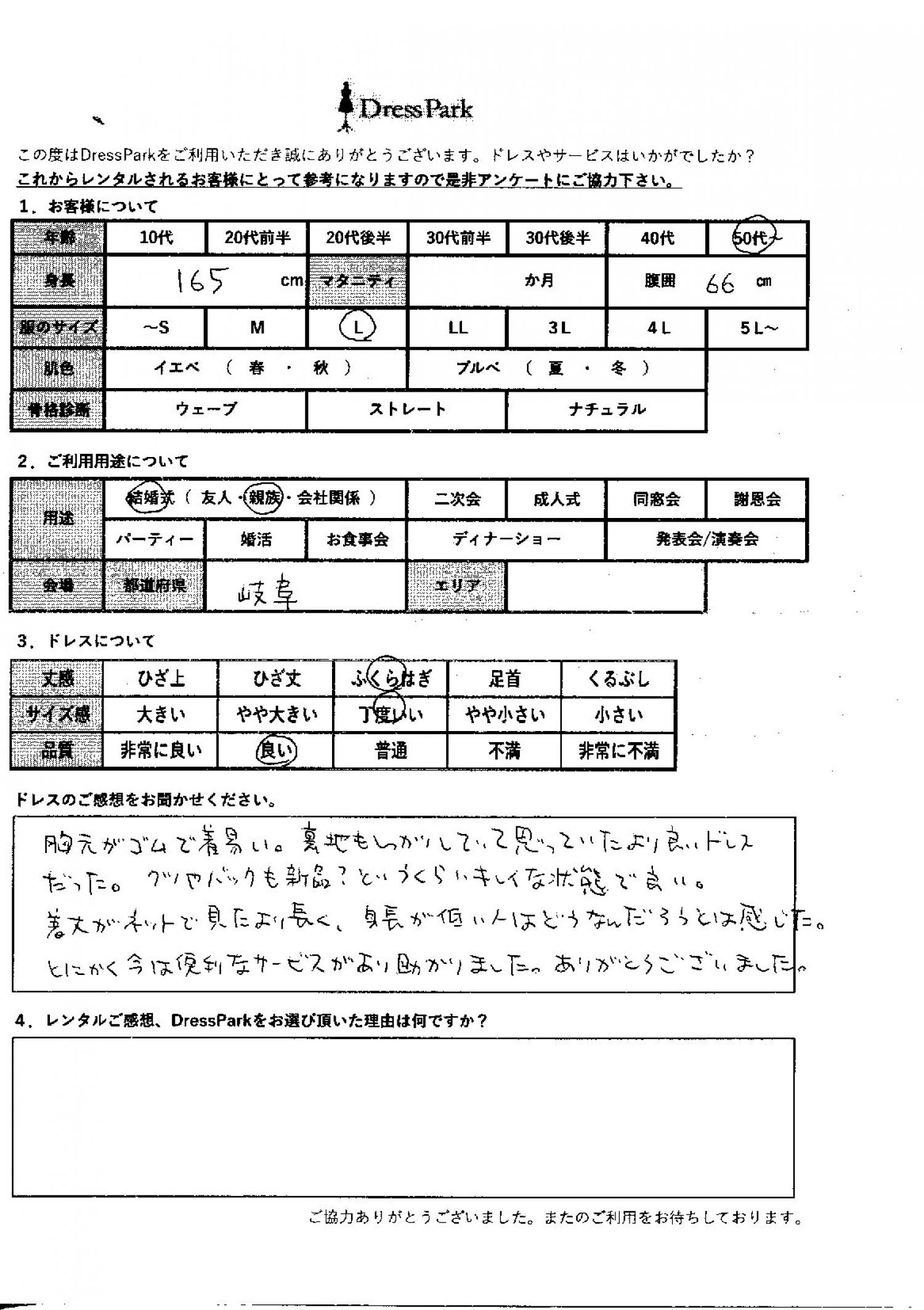 岐阜県 M.K様165㎝ Lサイズ #50代~#M/L#165~169㎝#結婚式(親族)#岐阜県 ◆レンタルしたドレスはこちら ◆レンタルしたサイズは:L ◆レンタルした日付:2025/11/29 ドレスの着用感 ◆点数: (4点) ◆丈感:ふくらはぎ ◆サイズ感:丁度いい ◆品質:良い ドレスの感想 胸元がゴムで着やすい。裏地もしっかりしていて思っていたより良いドレスだった。靴やバッグも新品?と言う位きれいな状態で良い。着丈がネットで見たより長く、身長が低い人はどうなんだろうとは感じた。とにかく今は便利なサービスがあり助かりました。ありがとうございました。 CUSTOMER REVIEWS お客様の声 気になるカテゴリー別にご利用の感想をチェック! ◆AGE 年代で見る 10代 20代 30代 40代 50代~ ◆SIZE サイズで見る SS/S M/L 大きいサイズLL~ ◆HIGHT 身長で見る 140~149㎝ 150~154㎝ 155~159㎝ 160~164㎝ 165~169㎝ 170㎝以上 ◆マタニティ ~3か月 4~6か月 7~8か月 9~10か月 ◆肌色 イエベ ブルべ ◆骨格診断 ウェーブ ストレート ナチュラル ◆利用シーン 結婚式(友人) 結婚式(親族) 結婚式(会社関係) 二次会 成人式 謝恩会 パーティー その他 CUSTOMER REVIEWS都道府県別お客様の声 都道府県別にのお客様の声をチェック! 北海道 青森県 岩手県 宮城県 秋田県 山形県 福島県 茨城県 栃木県 群馬県 埼玉県 千葉県 東京都 神奈川県 新潟県 富山県 石川県 福井県 山梨県 長野県 岐阜県 静岡県 愛知県 三重県 滋賀県 京都府 大阪府 兵庫県 奈良県 和歌山県 鳥取県 島根県 岡山県 広島県 山口県 徳島県 香川県 愛媛県 高知県 福岡県 佐賀県 長崎県 熊本県 大分県 宮崎県 鹿児島県 沖縄県 CUSTOMER REVIEWSエリア別お客様の声 都道府県別にのお客様の声をチェック! 札幌 仙台 名古屋 軽井沢 金沢 神戸・芦屋 博多 那覇 梅田・新大阪 難波・心斎橋 鎌倉・湘南 横浜・みなとみらい 舞浜・浦安・幕張 大宮・浦和 青山・表参道 六本木・麻布 渋谷・恵比寿 新宿 池袋 銀座・丸の内 お台場・汐留 鹿児島市 郡山市 福島市 東予 甲府・石和 LINEでお問い合わせ このサイトではJavaScriptを使用しています