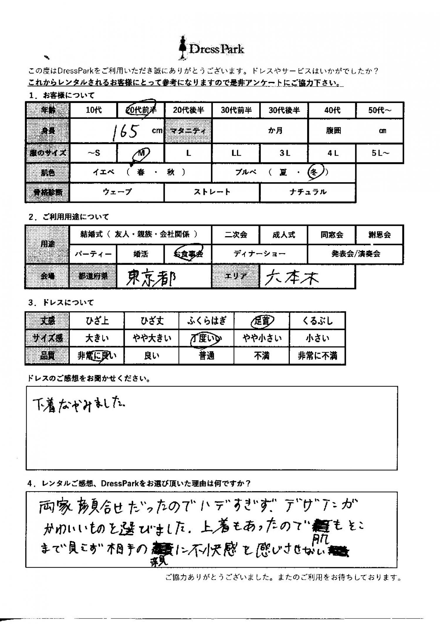 東京都 M.M様165㎝ Mサイズ六本木・麻布 #20代#M/L#165~169㎝#その他#東京都#六本木・麻布 ◆レンタルしたドレスはこちら ◆レンタルしたサイズは:M ◆レンタルした日付:2025/11/30 ドレスの着用感 ◆点数: (5点) ◆丈感:足首 ◆サイズ感:丁度いい ◆品質:非常に良い ◆肌色:ブルべ ドレスの感想 下着悩みました。 両家顔合わせだったので、派手すぎずデザインが可愛いものを選びました。上着もあったので、肌もそこまで見えず、相手の親に不快感を感じさせない。 CUSTOMER REVIEWS お客様の声 気になるカテゴリー別にご利用の感想をチェック! ◆AGE 年代で見る 10代 20代 30代 40代 50代~ ◆SIZE サイズで見る SS/S M/L 大きいサイズLL~ ◆HIGHT 身長で見る 140~149㎝ 150~154㎝ 155~159㎝ 160~164㎝ 165~169㎝ 170㎝以上 ◆マタニティ ~3か月 4~6か月 7~8か月 9~10か月 ◆肌色 イエベ ブルべ ◆骨格診断 ウェーブ ストレート ナチュラル ◆利用シーン 結婚式(友人) 結婚式(親族) 結婚式(会社関係) 二次会 成人式 謝恩会 パーティー その他 CUSTOMER REVIEWS都道府県別お客様の声 都道府県別にのお客様の声をチェック! 北海道 青森県 岩手県 宮城県 秋田県 山形県 福島県 茨城県 栃木県 群馬県 埼玉県 千葉県 東京都 神奈川県 新潟県 富山県 石川県 福井県 山梨県 長野県 岐阜県 静岡県 愛知県 三重県 滋賀県 京都府 大阪府 兵庫県 奈良県 和歌山県 鳥取県 島根県 岡山県 広島県 山口県 徳島県 香川県 愛媛県 高知県 福岡県 佐賀県 長崎県 熊本県 大分県 宮崎県 鹿児島県 沖縄県 CUSTOMER REVIEWSエリア別お客様の声 都道府県別にのお客様の声をチェック! 札幌 仙台 名古屋 軽井沢 金沢 神戸・芦屋 博多 那覇 梅田・新大阪 難波・心斎橋 鎌倉・湘南 横浜・みなとみらい 舞浜・浦安・幕張 大宮・浦和 青山・表参道 六本木・麻布 渋谷・恵比寿 新宿 池袋 銀座・丸の内 お台場・汐留 鹿児島市 郡山市 福島市 東予 甲府・石和 LINEでお問い合わせ このサイトではJavaScriptを使用しています