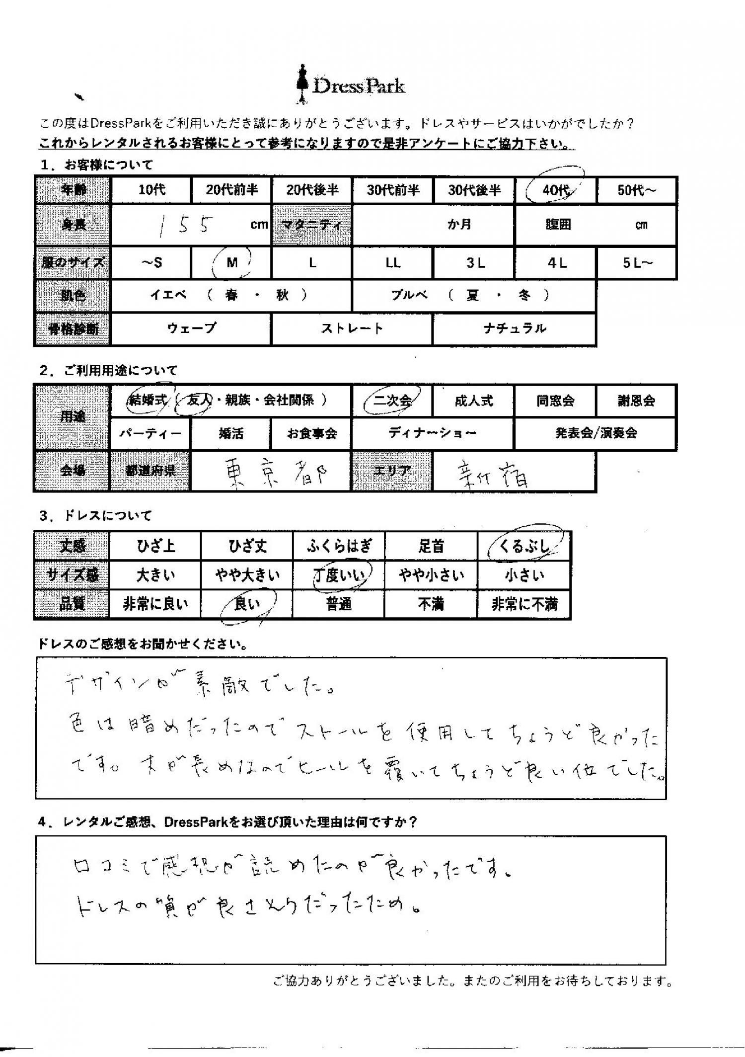 東京都 M.N様155㎝ Mサイズ新宿 #40代#M/L#155~159㎝#結婚式(友人)#東京都#新宿 ◆レンタルしたドレスはこちら ◆レンタルしたサイズは:M ◆レンタルした日付:2025/11/29 ドレスの着用感 ◆点数: (4点) ◆丈感:くるぶし ◆サイズ感:丁度いい ◆品質:良い ドレスの感想 デザインが素敵でした。色は暗めだったので、ストールを使用してちょうど良かったです。丈が長めなので、ヒールを履いてちょうど良い位でした。 レンタルのご感想、DressParkをお選び頂いた理由 口コミで感想が読めたのが良かったです。ドレスの質が良さそうだったため。 CUSTOMER REVIEWS お客様の声 気になるカテゴリー別にご利用の感想をチェック! ◆AGE 年代で見る 10代 20代 30代 40代 50代~ ◆SIZE サイズで見る SS/S M/L 大きいサイズLL~ ◆HIGHT 身長で見る 140~149㎝ 150~154㎝ 155~159㎝ 160~164㎝ 165~169㎝ 170㎝以上 ◆マタニティ ~3か月 4~6か月 7~8か月 9~10か月 ◆肌色 イエベ ブルべ ◆骨格診断 ウェーブ ストレート ナチュラル ◆利用シーン 結婚式(友人) 結婚式(親族) 結婚式(会社関係) 二次会 成人式 謝恩会 パーティー その他 CUSTOMER REVIEWS都道府県別お客様の声 都道府県別にのお客様の声をチェック! 北海道 青森県 岩手県 宮城県 秋田県 山形県 福島県 茨城県 栃木県 群馬県 埼玉県 千葉県 東京都 神奈川県 新潟県 富山県 石川県 福井県 山梨県 長野県 岐阜県 静岡県 愛知県 三重県 滋賀県 京都府 大阪府 兵庫県 奈良県 和歌山県 鳥取県 島根県 岡山県 広島県 山口県 徳島県 香川県 愛媛県 高知県 福岡県 佐賀県 長崎県 熊本県 大分県 宮崎県 鹿児島県 沖縄県 CUSTOMER REVIEWSエリア別お客様の声 都道府県別にのお客様の声をチェック! 札幌 仙台 名古屋 軽井沢 金沢 神戸・芦屋 博多 那覇 梅田・新大阪 難波・心斎橋 鎌倉・湘南 横浜・みなとみらい 舞浜・浦安・幕張 大宮・浦和 青山・表参道 六本木・麻布 渋谷・恵比寿 新宿 池袋 銀座・丸の内 お台場・汐留 鹿児島市 郡山市 福島市 東予 甲府・石和 LINEでお問い合わせ このサイトではJavaScriptを使用しています