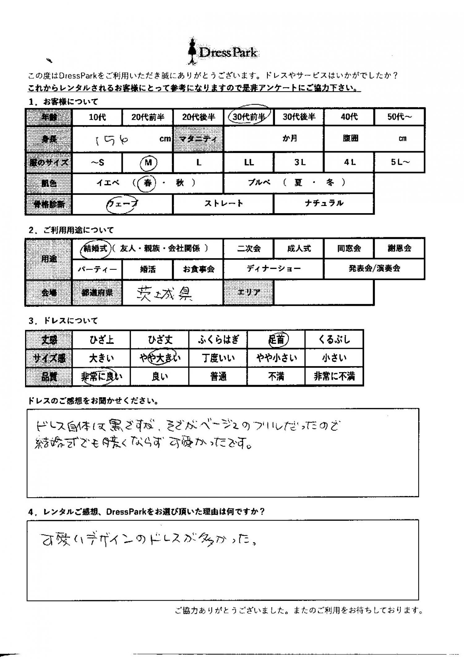茨城県 H.H様156㎝ Mサイズ #30代#M/L#155~159㎝#結婚式(友人)#茨城県 ◆レンタルしたドレスはこちら ◆レンタルしたサイズは:M ◆レンタルした日付:2025/11/29 ドレスの着用感 ◆点数: (5点) ◆丈感:足首 ◆サイズ感:やや大きい ◆品質:非常に良い ◆肌色:イエベ ◆骨格診断:ウェーブ ドレスの感想 ドレス自体は黒ですが、袖がベージュのフリルだったので、結婚式でも暗くならず可愛かったです。 レンタルのご感想、DressParkをお選び頂いた理由 かわいいデザインのドレスが多かった。 CUSTOMER REVIEWS お客様の声 気になるカテゴリー別にご利用の感想をチェック! ◆AGE 年代で見る 10代 20代 30代 40代 50代~ ◆SIZE サイズで見る SS/S M/L 大きいサイズLL~ ◆HIGHT 身長で見る 140~149㎝ 150~154㎝ 155~159㎝ 160~164㎝ 165~169㎝ 170㎝以上 ◆マタニティ ~3か月 4~6か月 7~8か月 9~10か月 ◆肌色 イエベ ブルべ ◆骨格診断 ウェーブ ストレート ナチュラル ◆利用シーン 結婚式(友人) 結婚式(親族) 結婚式(会社関係) 二次会 成人式 謝恩会 パーティー その他 CUSTOMER REVIEWS都道府県別お客様の声 都道府県別にのお客様の声をチェック! 北海道 青森県 岩手県 宮城県 秋田県 山形県 福島県 茨城県 栃木県 群馬県 埼玉県 千葉県 東京都 神奈川県 新潟県 富山県 石川県 福井県 山梨県 長野県 岐阜県 静岡県 愛知県 三重県 滋賀県 京都府 大阪府 兵庫県 奈良県 和歌山県 鳥取県 島根県 岡山県 広島県 山口県 徳島県 香川県 愛媛県 高知県 福岡県 佐賀県 長崎県 熊本県 大分県 宮崎県 鹿児島県 沖縄県 CUSTOMER REVIEWSエリア別お客様の声 都道府県別にのお客様の声をチェック! 札幌 仙台 名古屋 軽井沢 金沢 神戸・芦屋 博多 那覇 梅田・新大阪 難波・心斎橋 鎌倉・湘南 横浜・みなとみらい 舞浜・浦安・幕張 大宮・浦和 青山・表参道 六本木・麻布 渋谷・恵比寿 新宿 池袋 銀座・丸の内 お台場・汐留 鹿児島市 郡山市 福島市 東予 甲府・石和 LINEでお問い合わせ このサイトではJavaScriptを使用しています