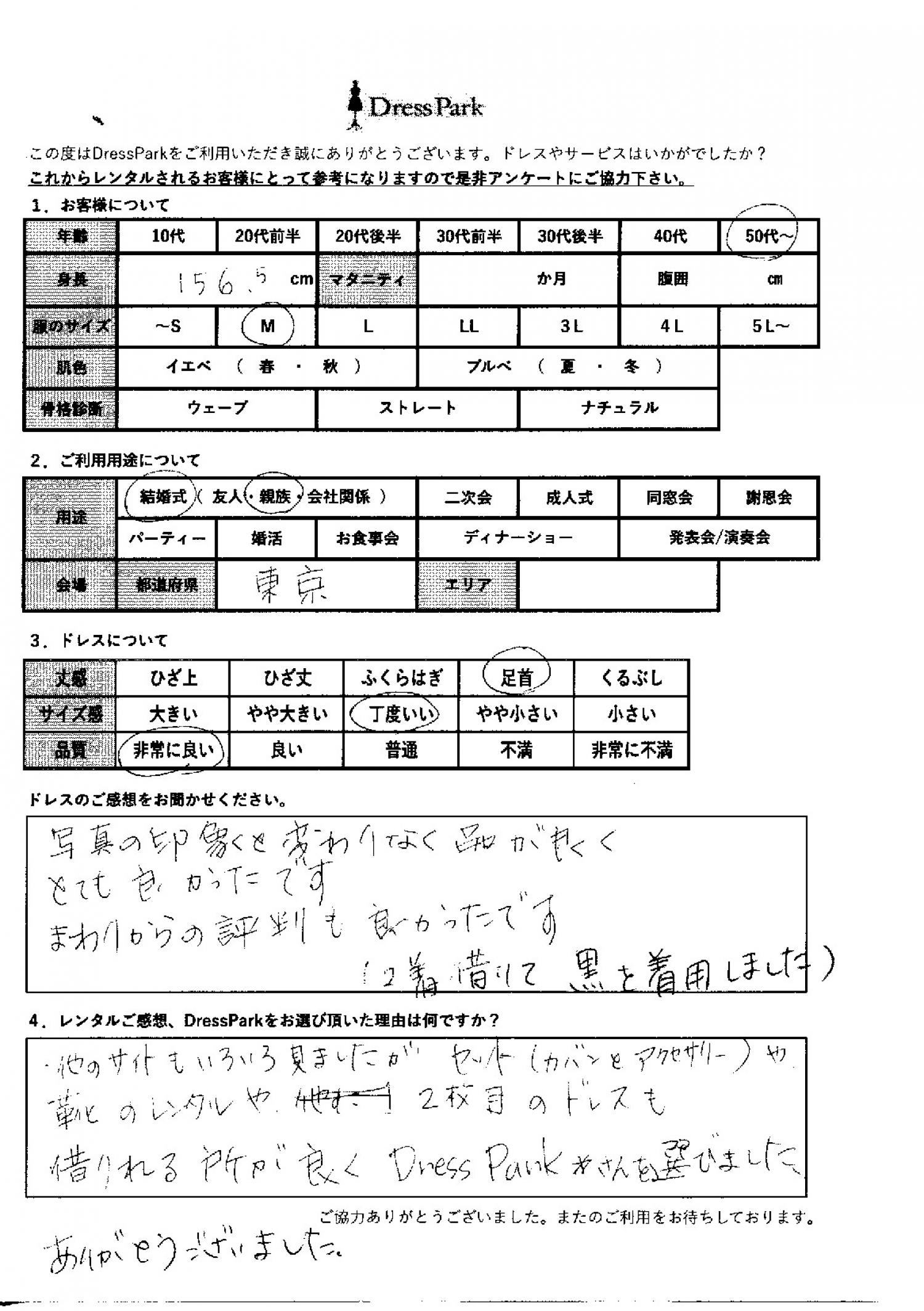 東京都 C.S様156㎝ Mサイズ #50代~#M/L#155~159㎝#結婚式(親族)#東京都 ◆レンタルしたドレスはこちら ◆レンタルしたサイズは:M ◆レンタルした日付:2025/11/29 ドレスの着用感 ◆点数: (5点) ◆丈感:足首 ◆サイズ感:丁度いい ◆品質:非常に良い ドレスの感想 写真の印象と変わりなく、品が良くとても良かったです。周りからの評判も良かったです。(2着借りて黒を着用しました) レンタルのご感想、DressParkをお選び頂いた理由 他のサイトもいろいろ見ましたが、セット(カバンとアクセサリー)や、靴とのレンタルや、2枚目のドレスも借りられるところが良く、ドレスパークさんを選びました。ありがとうございました。 CUSTOMER REVIEWS お客様の声 気になるカテゴリー別にご利用の感想をチェック! ◆AGE 年代で見る 10代 20代 30代 40代 50代~ ◆SIZE サイズで見る SS/S M/L 大きいサイズLL~ ◆HIGHT 身長で見る 140~149㎝ 150~154㎝ 155~159㎝ 160~164㎝ 165~169㎝ 170㎝以上 ◆マタニティ ~3か月 4~6か月 7~8か月 9~10か月 ◆肌色 イエベ ブルべ ◆骨格診断 ウェーブ ストレート ナチュラル ◆利用シーン 結婚式(友人) 結婚式(親族) 結婚式(会社関係) 二次会 成人式 謝恩会 パーティー その他 CUSTOMER REVIEWS都道府県別お客様の声 都道府県別にのお客様の声をチェック! 北海道 青森県 岩手県 宮城県 秋田県 山形県 福島県 茨城県 栃木県 群馬県 埼玉県 千葉県 東京都 神奈川県 新潟県 富山県 石川県 福井県 山梨県 長野県 岐阜県 静岡県 愛知県 三重県 滋賀県 京都府 大阪府 兵庫県 奈良県 和歌山県 鳥取県 島根県 岡山県 広島県 山口県 徳島県 香川県 愛媛県 高知県 福岡県 佐賀県 長崎県 熊本県 大分県 宮崎県 鹿児島県 沖縄県 CUSTOMER REVIEWSエリア別お客様の声 都道府県別にのお客様の声をチェック! 札幌 仙台 名古屋 軽井沢 金沢 神戸・芦屋 博多 那覇 梅田・新大阪 難波・心斎橋 鎌倉・湘南 横浜・みなとみらい 舞浜・浦安・幕張 大宮・浦和 青山・表参道 六本木・麻布 渋谷・恵比寿 新宿 池袋 銀座・丸の内 お台場・汐留 鹿児島市 郡山市 福島市 東予 甲府・石和 LINEでお問い合わせ このサイトではJavaScriptを使用しています