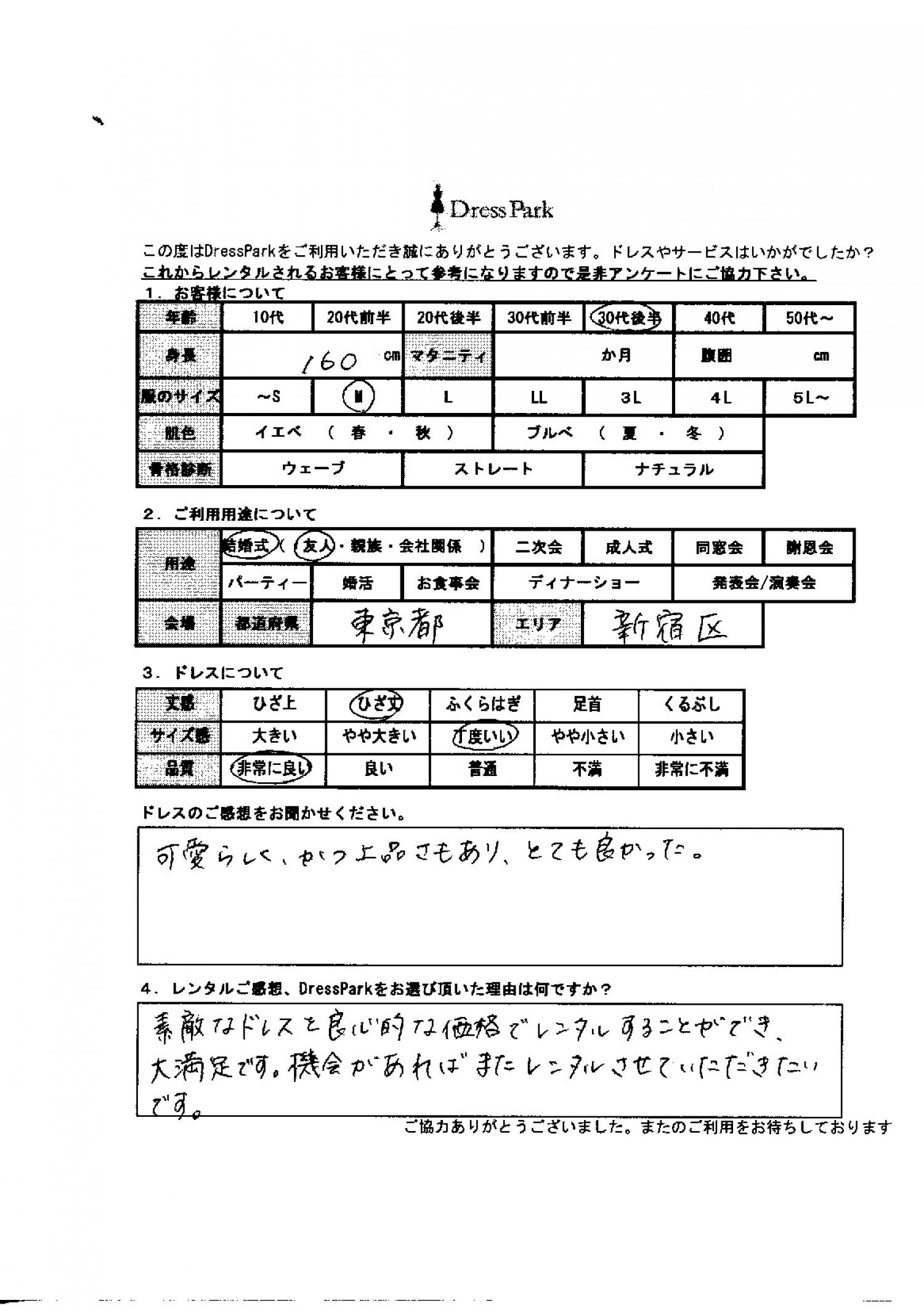 東京都 M.A様160㎝ Mサイズ新宿 #30代#M/L#160~164㎝#結婚式(友人)#東京都#新宿 ◆レンタルしたドレスはこちら ◆レンタルしたサイズは:M ◆レンタルした日付:2025/11/30 ドレスの着用感 ◆点数: (5点) ◆丈感:ひざ丈 ◆サイズ感:丁度いい ◆品質:非常に良い ドレスの感想 可愛らしく、かつ上品さもありとても良かった。 レンタルのご感想、DressParkをお選び頂いた理由 素敵なドレスを良心的な価格でレンタルすることができ、大満足です。機会があればまたレンタルさせていただきたいです。 CUSTOMER REVIEWS お客様の声 気になるカテゴリー別にご利用の感想をチェック! ◆AGE 年代で見る 10代 20代 30代 40代 50代~ ◆SIZE サイズで見る SS/S M/L 大きいサイズLL~ ◆HIGHT 身長で見る 140~149㎝ 150~154㎝ 155~159㎝ 160~164㎝ 165~169㎝ 170㎝以上 ◆マタニティ ~3か月 4~6か月 7~8か月 9~10か月 ◆肌色 イエベ ブルべ ◆骨格診断 ウェーブ ストレート ナチュラル ◆利用シーン 結婚式(友人) 結婚式(親族) 結婚式(会社関係) 二次会 成人式 謝恩会 パーティー その他 CUSTOMER REVIEWS都道府県別お客様の声 都道府県別にのお客様の声をチェック! 北海道 青森県 岩手県 宮城県 秋田県 山形県 福島県 茨城県 栃木県 群馬県 埼玉県 千葉県 東京都 神奈川県 新潟県 富山県 石川県 福井県 山梨県 長野県 岐阜県 静岡県 愛知県 三重県 滋賀県 京都府 大阪府 兵庫県 奈良県 和歌山県 鳥取県 島根県 岡山県 広島県 山口県 徳島県 香川県 愛媛県 高知県 福岡県 佐賀県 長崎県 熊本県 大分県 宮崎県 鹿児島県 沖縄県 CUSTOMER REVIEWSエリア別お客様の声 都道府県別にのお客様の声をチェック! 札幌 仙台 名古屋 軽井沢 金沢 神戸・芦屋 博多 那覇 梅田・新大阪 難波・心斎橋 鎌倉・湘南 横浜・みなとみらい 舞浜・浦安・幕張 大宮・浦和 青山・表参道 六本木・麻布 渋谷・恵比寿 新宿 池袋 銀座・丸の内 お台場・汐留 鹿児島市 郡山市 福島市 東予 甲府・石和 LINEでお問い合わせ このサイトではJavaScriptを使用しています