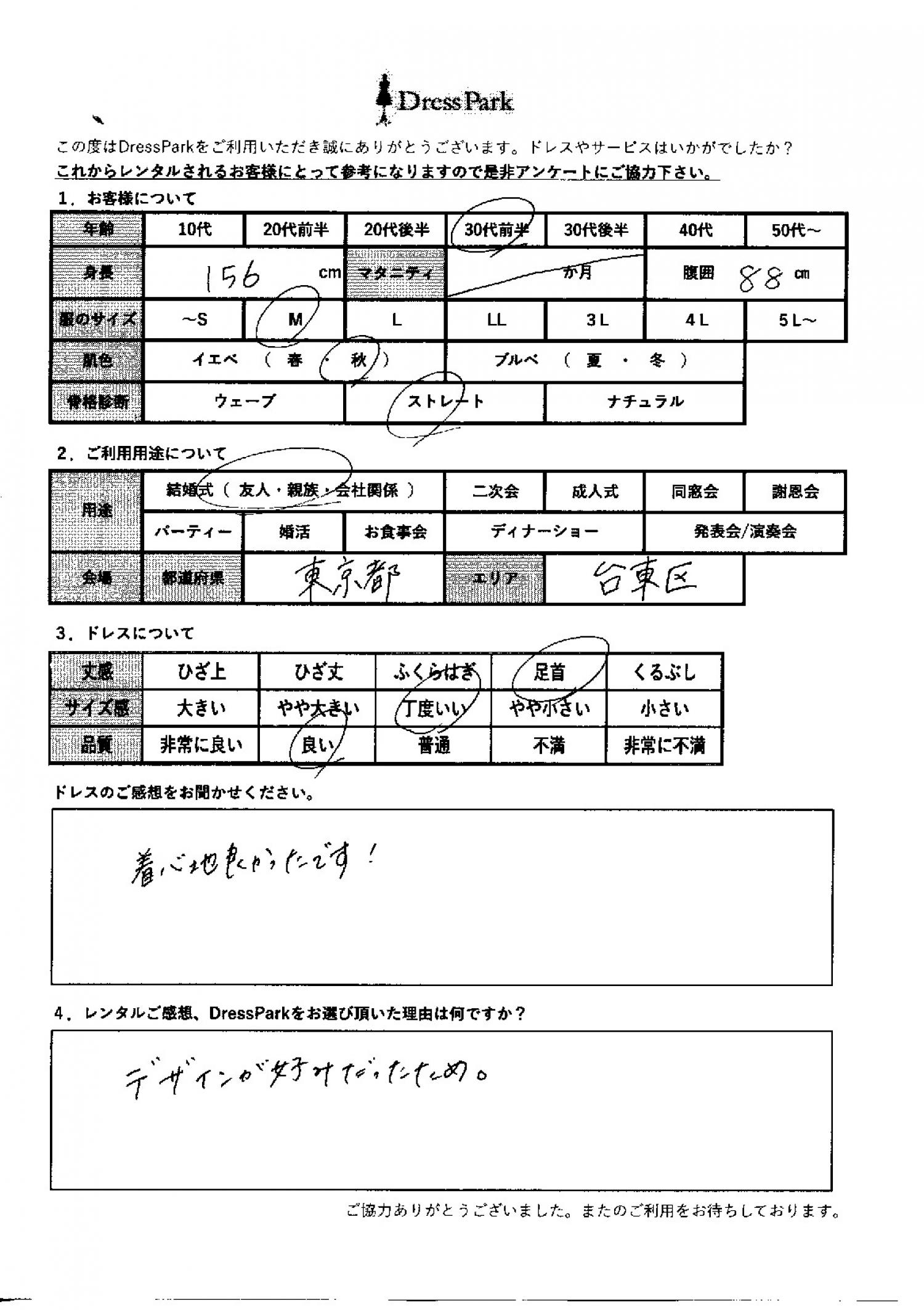 東京都 M.S様156㎝ Mサイズ #30代#M/L#155~159㎝#結婚式(親族)#東京都 ◆レンタルしたドレスはこちら ◆レンタルしたサイズは:M ◆レンタルした日付:2025/11/30 ドレスの着用感 ◆点数: (4点) ◆丈感:足首 ◆サイズ感:丁度いい ◆品質:良い ◆肌色:イエベ ◆骨格診断:ストレート ドレスの感想 着心地よかったです! レンタルのご感想、DressParkをお選び頂いた理由 デザインが好みだったため。 CUSTOMER REVIEWS お客様の声 気になるカテゴリー別にご利用の感想をチェック! ◆AGE 年代で見る 10代 20代 30代 40代 50代~ ◆SIZE サイズで見る SS/S M/L 大きいサイズLL~ ◆HIGHT 身長で見る 140~149㎝ 150~154㎝ 155~159㎝ 160~164㎝ 165~169㎝ 170㎝以上 ◆マタニティ ~3か月 4~6か月 7~8か月 9~10か月 ◆肌色 イエベ ブルべ ◆骨格診断 ウェーブ ストレート ナチュラル ◆利用シーン 結婚式(友人) 結婚式(親族) 結婚式(会社関係) 二次会 成人式 謝恩会 パーティー その他 CUSTOMER REVIEWS都道府県別お客様の声 都道府県別にのお客様の声をチェック! 北海道 青森県 岩手県 宮城県 秋田県 山形県 福島県 茨城県 栃木県 群馬県 埼玉県 千葉県 東京都 神奈川県 新潟県 富山県 石川県 福井県 山梨県 長野県 岐阜県 静岡県 愛知県 三重県 滋賀県 京都府 大阪府 兵庫県 奈良県 和歌山県 鳥取県 島根県 岡山県 広島県 山口県 徳島県 香川県 愛媛県 高知県 福岡県 佐賀県 長崎県 熊本県 大分県 宮崎県 鹿児島県 沖縄県 CUSTOMER REVIEWSエリア別お客様の声 都道府県別にのお客様の声をチェック! 札幌 仙台 名古屋 軽井沢 金沢 神戸・芦屋 博多 那覇 梅田・新大阪 難波・心斎橋 鎌倉・湘南 横浜・みなとみらい 舞浜・浦安・幕張 大宮・浦和 青山・表参道 六本木・麻布 渋谷・恵比寿 新宿 池袋 銀座・丸の内 お台場・汐留 鹿児島市 郡山市 福島市 東予 甲府・石和 LINEでお問い合わせ このサイトではJavaScriptを使用しています