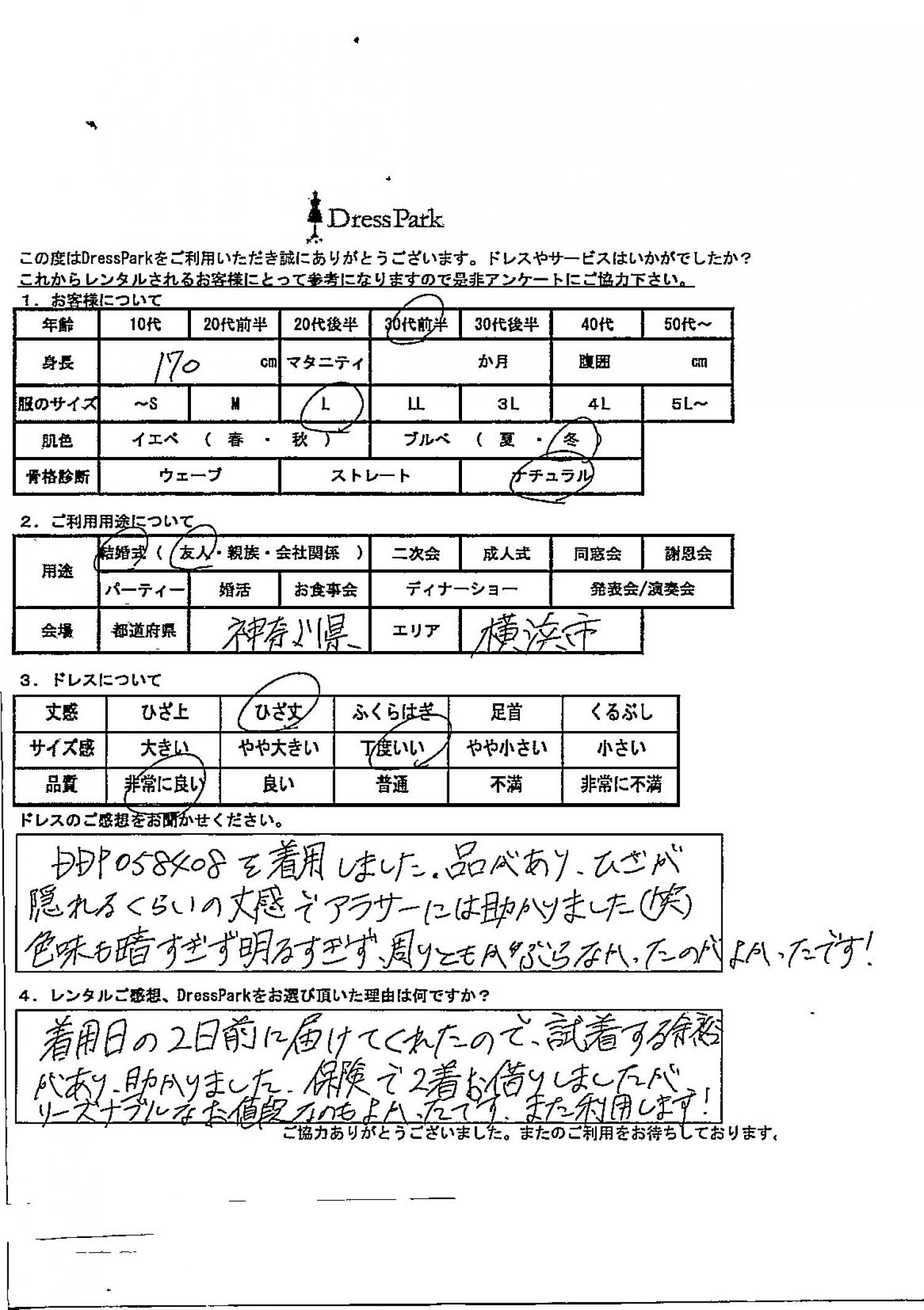 DDP058408を着用しました。品があり、ひざが隠れるくらいの丈感でアラサーには助かりました