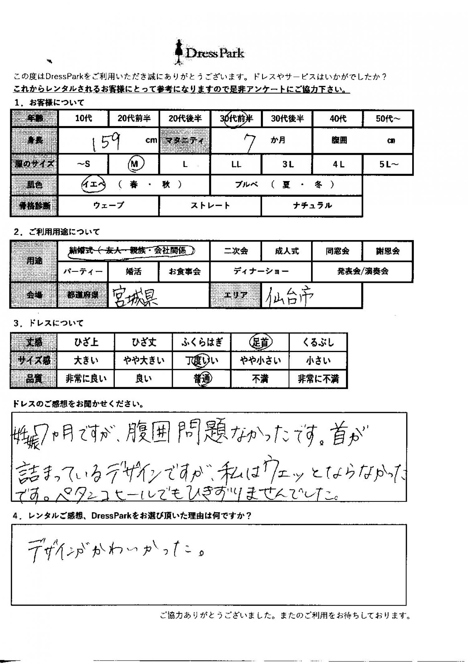 宮城県 N.F様159㎝ Mサイズ仙台 マタニティ #30代#M/L#155~159㎝#結婚式(友人)#宮城県#仙台 ◆レンタルしたドレスはこちら ◆レンタルしたサイズは:M ◆レンタルした日付:2025/11/23 ドレスの着用感 ◆点数: (4点) ◆丈感:足首 ◆サイズ感:丁度いい ◆品質:普通 ◆マタニティ: ◆肌色:イエベ ドレスの感想 妊娠7ヶ月ですが、腹囲問題なかったです。首が詰まっているデザインですが、私はウェッとならなかったです。ぺたんこヒールでも引きずりませんでした。 レンタルのご感想、DressParkをお選び頂いた理由 デザインが可愛かったから。 CUSTOMER REVIEWS お客様の声 気になるカテゴリー別にご利用の感想をチェック! ◆AGE 年代で見る 10代 20代 30代 40代 50代~ ◆SIZE サイズで見る SS/S M/L 大きいサイズLL~ ◆HIGHT 身長で見る 140~149㎝ 150~154㎝ 155~159㎝ 160~164㎝ 165~169㎝ 170㎝以上 ◆マタニティ ~3か月 4~6か月 7~8か月 9~10か月 ◆肌色 イエベ ブルべ ◆骨格診断 ウェーブ ストレート ナチュラル ◆利用シーン 結婚式(友人) 結婚式(親族) 結婚式(会社関係) 二次会 成人式 謝恩会 パーティー その他 CUSTOMER REVIEWS都道府県別お客様の声 都道府県別にのお客様の声をチェック! 北海道 青森県 岩手県 宮城県 秋田県 山形県 福島県 茨城県 栃木県 群馬県 埼玉県 千葉県 東京都 神奈川県 新潟県 富山県 石川県 福井県 山梨県 長野県 岐阜県 静岡県 愛知県 三重県 滋賀県 京都府 大阪府 兵庫県 奈良県 和歌山県 鳥取県 島根県 岡山県 広島県 山口県 徳島県 香川県 愛媛県 高知県 福岡県 佐賀県 長崎県 熊本県 大分県 宮崎県 鹿児島県 沖縄県 CUSTOMER REVIEWSエリア別お客様の声 都道府県別にのお客様の声をチェック! 札幌 仙台 名古屋 軽井沢 金沢 神戸・芦屋 博多 那覇 梅田・新大阪 難波・心斎橋 鎌倉・湘南 横浜・みなとみらい 舞浜・浦安・幕張 大宮・浦和 青山・表参道 六本木・麻布 渋谷・恵比寿 新宿 池袋 銀座・丸の内 お台場・汐留 鹿児島市 郡山市 福島市 東予 甲府・石和 LINEでお問い合わせ このサイトではJavaScriptを使用しています