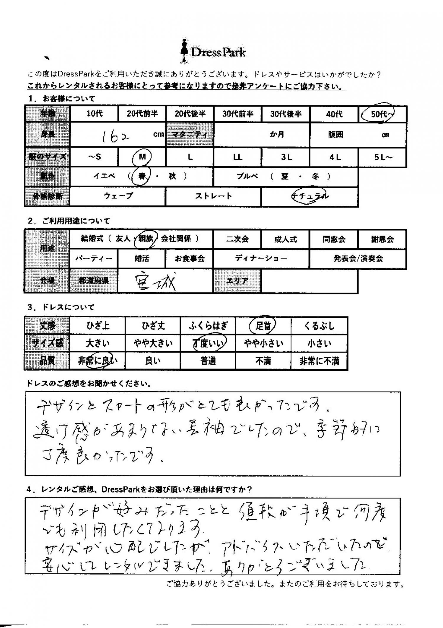 宮城県 O.N様162㎝ Mサイズ #50代~#M/L#160~164㎝#結婚式(親族)#宮城県 ◆レンタルしたドレスはこちら ◆レンタルしたサイズは:M ◆レンタルした日付:2025/11/23 ドレスの着用感 ◆点数: (5点) ◆丈感:足首 ◆サイズ感:丁度いい ◆品質:非常に良い ◆肌色:イエベ ◆骨格診断:ナチュラル ドレスの感想 デザインとスカートの形がとても良かったです。透け感があまりない長袖でしたので、季節的にちょうど良かったです。 レンタルのご感想、DressParkをお選び頂いた理由 デザインが好みだったことと、値段が手頃で何度でも利用したくなります。サイズが心配でしたが、アドバイスいただいたので、安心してレンタルできました。ありがとうございました。 CUSTOMER REVIEWS お客様の声 気になるカテゴリー別にご利用の感想をチェック! ◆AGE 年代で見る 10代 20代 30代 40代 50代~ ◆SIZE サイズで見る SS/S M/L 大きいサイズLL~ ◆HIGHT 身長で見る 140~149㎝ 150~154㎝ 155~159㎝ 160~164㎝ 165~169㎝ 170㎝以上 ◆マタニティ ~3か月 4~6か月 7~8か月 9~10か月 ◆肌色 イエベ ブルべ ◆骨格診断 ウェーブ ストレート ナチュラル ◆利用シーン 結婚式(友人) 結婚式(親族) 結婚式(会社関係) 二次会 成人式 謝恩会 パーティー その他 CUSTOMER REVIEWS都道府県別お客様の声 都道府県別にのお客様の声をチェック! 北海道 青森県 岩手県 宮城県 秋田県 山形県 福島県 茨城県 栃木県 群馬県 埼玉県 千葉県 東京都 神奈川県 新潟県 富山県 石川県 福井県 山梨県 長野県 岐阜県 静岡県 愛知県 三重県 滋賀県 京都府 大阪府 兵庫県 奈良県 和歌山県 鳥取県 島根県 岡山県 広島県 山口県 徳島県 香川県 愛媛県 高知県 福岡県 佐賀県 長崎県 熊本県 大分県 宮崎県 鹿児島県 沖縄県 CUSTOMER REVIEWSエリア別お客様の声 都道府県別にのお客様の声をチェック! 札幌 仙台 名古屋 軽井沢 金沢 神戸・芦屋 博多 那覇 梅田・新大阪 難波・心斎橋 鎌倉・湘南 横浜・みなとみらい 舞浜・浦安・幕張 大宮・浦和 青山・表参道 六本木・麻布 渋谷・恵比寿 新宿 池袋 銀座・丸の内 お台場・汐留 鹿児島市 郡山市 福島市 東予 甲府・石和 LINEでお問い合わせ このサイトではJavaScriptを使用しています