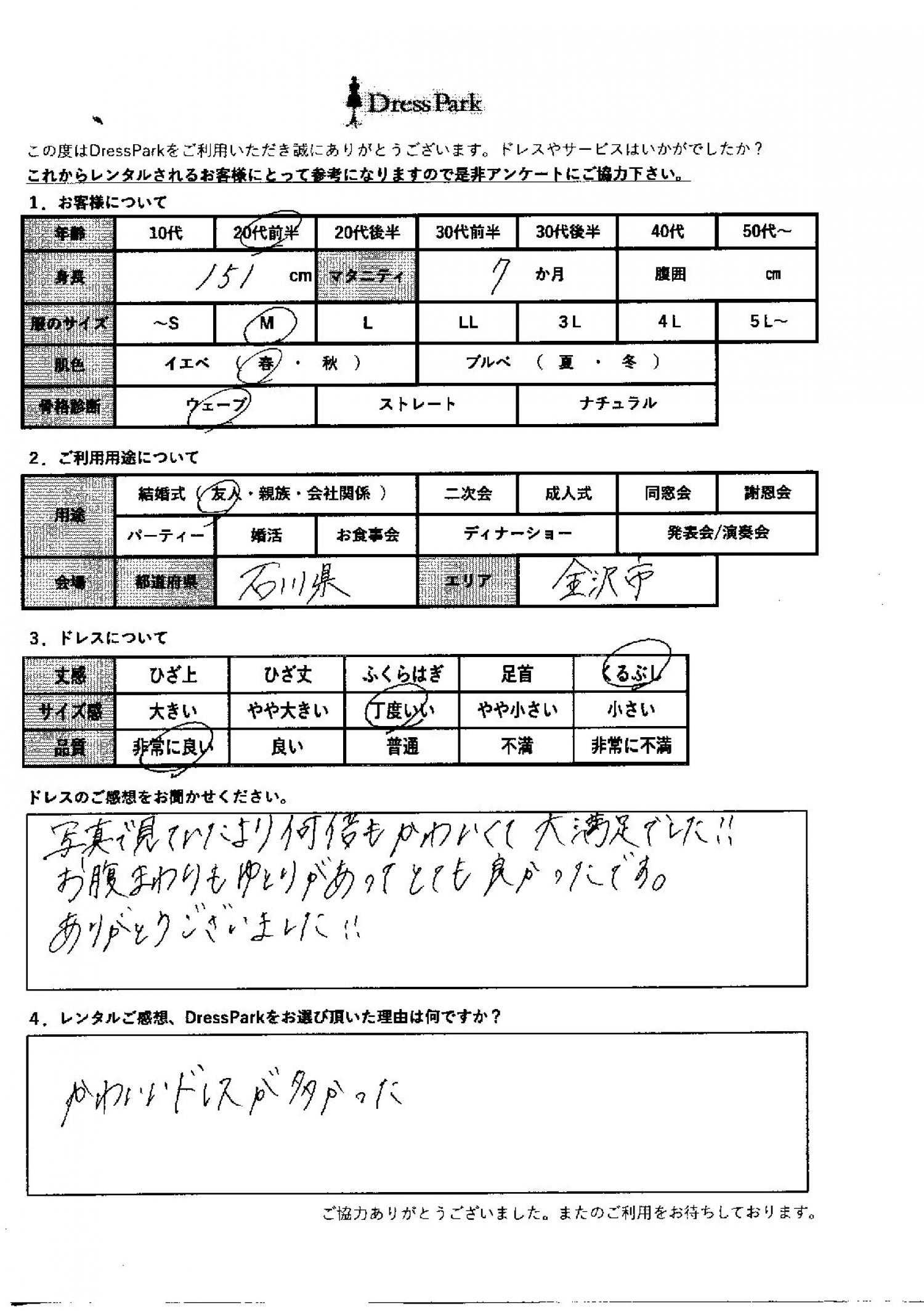 石川県 R.T様151㎝ Mサイズ金沢 マタニティ #20代#M/L#150~154㎝#結婚式(友人)#石川県#金沢 ◆レンタルしたドレスはこちら ◆レンタルしたサイズは:M ◆レンタルした日付:2025/11/23 ドレスの着用感 ◆点数: (5点) ◆丈感:くるぶし ◆サイズ感:丁度いい ◆品質:非常に良い ◆マタニティ: ◆肌色:イエベ ◆骨格診断:ウェーブ ドレスの感想 写真で見ていたより、何倍も可愛くて大満足でした!お腹周りもゆとりがあってとても良かったです。ありがとうございました! レンタルのご感想、DressParkをお選び頂いた理由 かわいいドレスが多かった。 CUSTOMER REVIEWS お客様の声 気になるカテゴリー別にご利用の感想をチェック! ◆AGE 年代で見る 10代 20代 30代 40代 50代~ ◆SIZE サイズで見る SS/S M/L 大きいサイズLL~ ◆HIGHT 身長で見る 140~149㎝ 150~154㎝ 155~159㎝ 160~164㎝ 165~169㎝ 170㎝以上 ◆マタニティ ~3か月 4~6か月 7~8か月 9~10か月 ◆肌色 イエベ ブルべ ◆骨格診断 ウェーブ ストレート ナチュラル ◆利用シーン 結婚式(友人) 結婚式(親族) 結婚式(会社関係) 二次会 成人式 謝恩会 パーティー その他 CUSTOMER REVIEWS都道府県別お客様の声 都道府県別にのお客様の声をチェック! 北海道 青森県 岩手県 宮城県 秋田県 山形県 福島県 茨城県 栃木県 群馬県 埼玉県 千葉県 東京都 神奈川県 新潟県 富山県 石川県 福井県 山梨県 長野県 岐阜県 静岡県 愛知県 三重県 滋賀県 京都府 大阪府 兵庫県 奈良県 和歌山県 鳥取県 島根県 岡山県 広島県 山口県 徳島県 香川県 愛媛県 高知県 福岡県 佐賀県 長崎県 熊本県 大分県 宮崎県 鹿児島県 沖縄県 CUSTOMER REVIEWSエリア別お客様の声 都道府県別にのお客様の声をチェック! 札幌 仙台 名古屋 軽井沢 金沢 神戸・芦屋 博多 那覇 梅田・新大阪 難波・心斎橋 鎌倉・湘南 横浜・みなとみらい 舞浜・浦安・幕張 大宮・浦和 青山・表参道 六本木・麻布 渋谷・恵比寿 新宿 池袋 銀座・丸の内 お台場・汐留 鹿児島市 郡山市 福島市 東予 甲府・石和 LINEでお問い合わせ このサイトではJavaScriptを使用しています