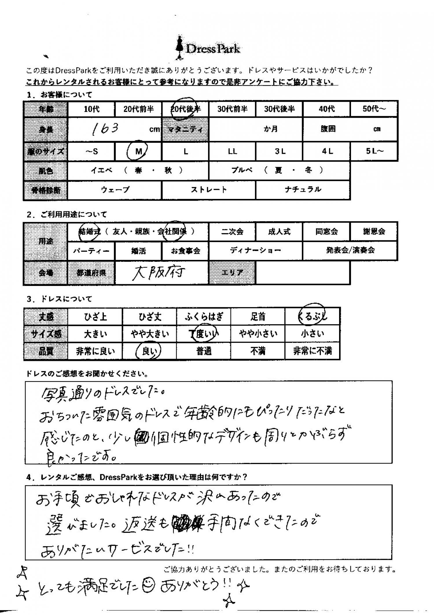 大阪府 Y.I様163㎝ Mサイズ #20代#M/L#160~164㎝#結婚式(会社関係)#大阪府 ◆レンタルしたドレスはこちら ◆レンタルしたサイズは:M ◆レンタルした日付:2025/11/23 ドレスの着用感 ◆点数: (4点) ◆丈感:くるぶし ◆サイズ感:丁度いい ◆品質:良い ドレスの感想 写真通りのドレスでした。落ち着いた雰囲気のドレスで年齢的にもぴったりだったなと感じたのと、少し個性的なデザインも周りとかぶらず良かったです。 レンタルのご感想、DressParkをお選び頂いた理由 手頃でおしゃれなドレスがたくさんあったので選びました。返送も手間なくできたので、ありがたいサービスでした!とっても満足でした。ありがとう! CUSTOMER REVIEWS お客様の声 気になるカテゴリー別にご利用の感想をチェック! ◆AGE 年代で見る 10代 20代 30代 40代 50代~ ◆SIZE サイズで見る SS/S M/L 大きいサイズLL~ ◆HIGHT 身長で見る 140~149㎝ 150~154㎝ 155~159㎝ 160~164㎝ 165~169㎝ 170㎝以上 ◆マタニティ ~3か月 4~6か月 7~8か月 9~10か月 ◆肌色 イエベ ブルべ ◆骨格診断 ウェーブ ストレート ナチュラル ◆利用シーン 結婚式(友人) 結婚式(親族) 結婚式(会社関係) 二次会 成人式 謝恩会 パーティー その他 CUSTOMER REVIEWS都道府県別お客様の声 都道府県別にのお客様の声をチェック! 北海道 青森県 岩手県 宮城県 秋田県 山形県 福島県 茨城県 栃木県 群馬県 埼玉県 千葉県 東京都 神奈川県 新潟県 富山県 石川県 福井県 山梨県 長野県 岐阜県 静岡県 愛知県 三重県 滋賀県 京都府 大阪府 兵庫県 奈良県 和歌山県 鳥取県 島根県 岡山県 広島県 山口県 徳島県 香川県 愛媛県 高知県 福岡県 佐賀県 長崎県 熊本県 大分県 宮崎県 鹿児島県 沖縄県 CUSTOMER REVIEWSエリア別お客様の声 都道府県別にのお客様の声をチェック! 札幌 仙台 名古屋 軽井沢 金沢 神戸・芦屋 博多 那覇 梅田・新大阪 難波・心斎橋 鎌倉・湘南 横浜・みなとみらい 舞浜・浦安・幕張 大宮・浦和 青山・表参道 六本木・麻布 渋谷・恵比寿 新宿 池袋 銀座・丸の内 お台場・汐留 鹿児島市 郡山市 福島市 東予 甲府・石和 LINEでお問い合わせ このサイトではJavaScriptを使用しています