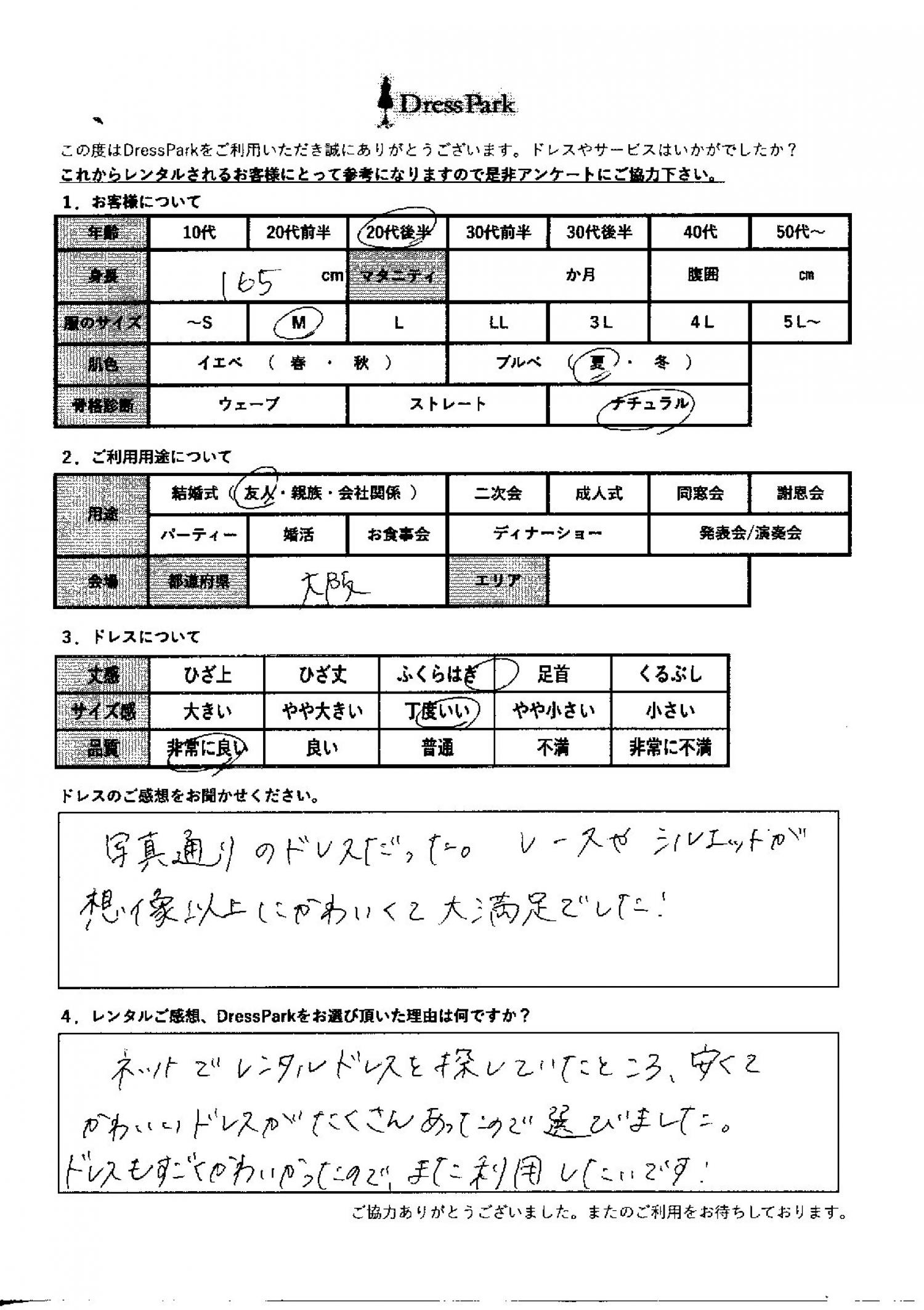 大阪府 N.K様165㎝ Mサイズ #20代#M/L#165~169㎝#結婚式(友人)#大阪府 ◆レンタルしたドレスはこちら ◆レンタルしたサイズは:M ◆レンタルした日付:2025/11/23 ドレスの着用感 ◆点数: (5点) ◆丈感:ふくらはぎ ◆サイズ感:丁度いい ◆品質:非常に良い ◆肌色:ブルべ ◆骨格診断:ナチュラル ドレスの感想 写真通りのドレスだった。レースやシルエットが想像以上に可愛くて大満足でした! レンタルのご感想、DressParkをお選び頂いた理由 ネットでレンタルドレスを探していたところ、安くてかわいいドレスがたくさんあったので、選びました。ドレスもすごく可愛かったので、また利用したいです! CUSTOMER REVIEWS お客様の声 気になるカテゴリー別にご利用の感想をチェック! ◆AGE 年代で見る 10代 20代 30代 40代 50代~ ◆SIZE サイズで見る SS/S M/L 大きいサイズLL~ ◆HIGHT 身長で見る 140~149㎝ 150~154㎝ 155~159㎝ 160~164㎝ 165~169㎝ 170㎝以上 ◆マタニティ ~3か月 4~6か月 7~8か月 9~10か月 ◆肌色 イエベ ブルべ ◆骨格診断 ウェーブ ストレート ナチュラル ◆利用シーン 結婚式(友人) 結婚式(親族) 結婚式(会社関係) 二次会 成人式 謝恩会 パーティー その他 CUSTOMER REVIEWS都道府県別お客様の声 都道府県別にのお客様の声をチェック! 北海道 青森県 岩手県 宮城県 秋田県 山形県 福島県 茨城県 栃木県 群馬県 埼玉県 千葉県 東京都 神奈川県 新潟県 富山県 石川県 福井県 山梨県 長野県 岐阜県 静岡県 愛知県 三重県 滋賀県 京都府 大阪府 兵庫県 奈良県 和歌山県 鳥取県 島根県 岡山県 広島県 山口県 徳島県 香川県 愛媛県 高知県 福岡県 佐賀県 長崎県 熊本県 大分県 宮崎県 鹿児島県 沖縄県 CUSTOMER REVIEWSエリア別お客様の声 都道府県別にのお客様の声をチェック! 札幌 仙台 名古屋 軽井沢 金沢 神戸・芦屋 博多 那覇 梅田・新大阪 難波・心斎橋 鎌倉・湘南 横浜・みなとみらい 舞浜・浦安・幕張 大宮・浦和 青山・表参道 六本木・麻布 渋谷・恵比寿 新宿 池袋 銀座・丸の内 お台場・汐留 鹿児島市 郡山市 福島市 東予 甲府・石和 LINEでお問い合わせ このサイトではJavaScriptを使用しています