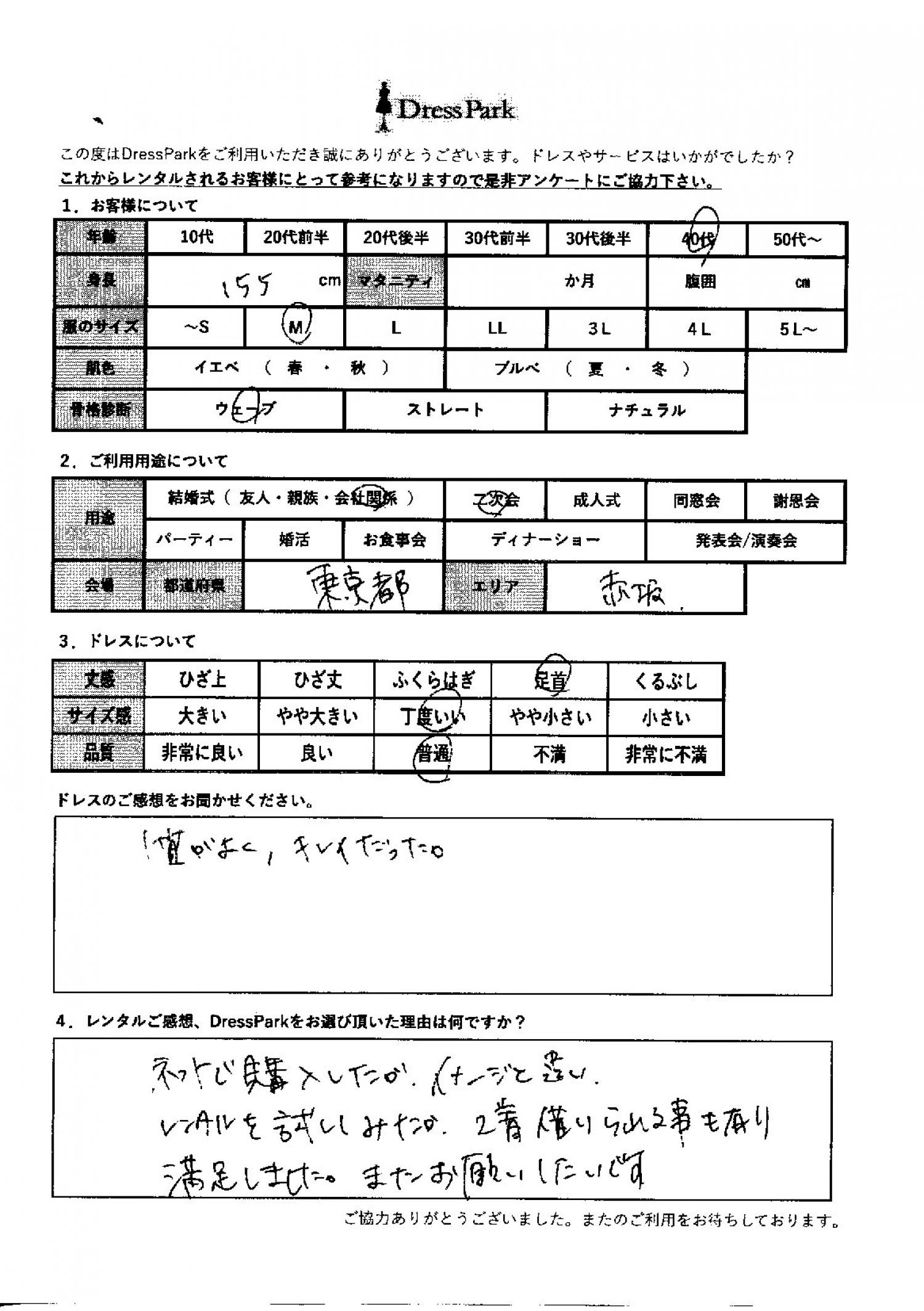 東京都 S.S様155㎝ Mサイズ六本木・麻布 #40代#M/L#155~159㎝#結婚式(会社関係)#東京都#六本木・麻布 ◆レンタルしたドレスはこちら ◆レンタルしたサイズは:M ◆レンタルした日付:2025/11/23 ドレスの着用感 ◆点数: (4点) ◆丈感:足首 ◆サイズ感:丁度いい ◆品質:普通 ◆骨格診断:ウェーブ ドレスの感想 質がよくきれいだった。 レンタルのご感想、DressParkをお選び頂いた理由 ネットで購入したが、イメージと違い、レンタルを試してみたが、2着借りられることもあり満足しました。またお願いしたいです。 CUSTOMER REVIEWS お客様の声 気になるカテゴリー別にご利用の感想をチェック! ◆AGE 年代で見る 10代 20代 30代 40代 50代~ ◆SIZE サイズで見る SS/S M/L 大きいサイズLL~ ◆HIGHT 身長で見る 140~149㎝ 150~154㎝ 155~159㎝ 160~164㎝ 165~169㎝ 170㎝以上 ◆マタニティ ~3か月 4~6か月 7~8か月 9~10か月 ◆肌色 イエベ ブルべ ◆骨格診断 ウェーブ ストレート ナチュラル ◆利用シーン 結婚式(友人) 結婚式(親族) 結婚式(会社関係) 二次会 成人式 謝恩会 パーティー その他 CUSTOMER REVIEWS都道府県別お客様の声 都道府県別にのお客様の声をチェック! 北海道 青森県 岩手県 宮城県 秋田県 山形県 福島県 茨城県 栃木県 群馬県 埼玉県 千葉県 東京都 神奈川県 新潟県 富山県 石川県 福井県 山梨県 長野県 岐阜県 静岡県 愛知県 三重県 滋賀県 京都府 大阪府 兵庫県 奈良県 和歌山県 鳥取県 島根県 岡山県 広島県 山口県 徳島県 香川県 愛媛県 高知県 福岡県 佐賀県 長崎県 熊本県 大分県 宮崎県 鹿児島県 沖縄県 CUSTOMER REVIEWSエリア別お客様の声 都道府県別にのお客様の声をチェック! 札幌 仙台 名古屋 軽井沢 金沢 神戸・芦屋 博多 那覇 梅田・新大阪 難波・心斎橋 鎌倉・湘南 横浜・みなとみらい 舞浜・浦安・幕張 大宮・浦和 青山・表参道 六本木・麻布 渋谷・恵比寿 新宿 池袋 銀座・丸の内 お台場・汐留 鹿児島市 郡山市 福島市 東予 甲府・石和 LINEでお問い合わせ このサイトではJavaScriptを使用しています