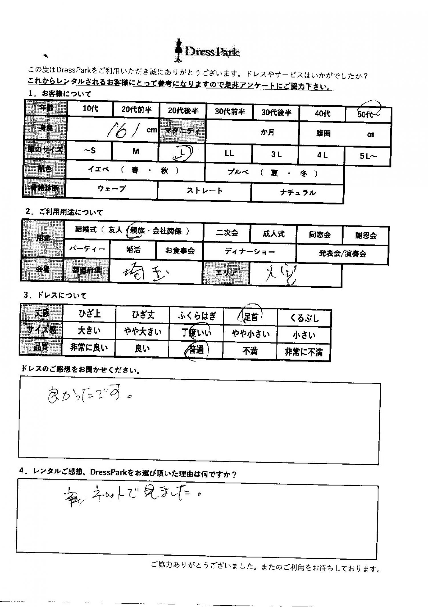 埼玉県 S.M様161㎝ Lサイズ大宮・浦和 #50代~#M/L#160~164㎝#結婚式(親族)#埼玉県#大宮・浦和 ◆レンタルしたドレスはこちら ◆レンタルしたサイズは:L ◆レンタルした日付:2025/11/23 ドレスの着用感 ◆点数: (4点) ◆丈感:足首 ◆サイズ感:丁度いい ◆品質:普通 ドレスの感想 よかったです。 レンタルのご感想、DressParkをお選び頂いた理由 ネットで見ました。 CUSTOMER REVIEWS お客様の声 気になるカテゴリー別にご利用の感想をチェック! ◆AGE 年代で見る 10代 20代 30代 40代 50代~ ◆SIZE サイズで見る SS/S M/L 大きいサイズLL~ ◆HIGHT 身長で見る 140~149㎝ 150~154㎝ 155~159㎝ 160~164㎝ 165~169㎝ 170㎝以上 ◆マタニティ ~3か月 4~6か月 7~8か月 9~10か月 ◆肌色 イエベ ブルべ ◆骨格診断 ウェーブ ストレート ナチュラル ◆利用シーン 結婚式(友人) 結婚式(親族) 結婚式(会社関係) 二次会 成人式 謝恩会 パーティー その他 CUSTOMER REVIEWS都道府県別お客様の声 都道府県別にのお客様の声をチェック! 北海道 青森県 岩手県 宮城県 秋田県 山形県 福島県 茨城県 栃木県 群馬県 埼玉県 千葉県 東京都 神奈川県 新潟県 富山県 石川県 福井県 山梨県 長野県 岐阜県 静岡県 愛知県 三重県 滋賀県 京都府 大阪府 兵庫県 奈良県 和歌山県 鳥取県 島根県 岡山県 広島県 山口県 徳島県 香川県 愛媛県 高知県 福岡県 佐賀県 長崎県 熊本県 大分県 宮崎県 鹿児島県 沖縄県 CUSTOMER REVIEWSエリア別お客様の声 都道府県別にのお客様の声をチェック! 札幌 仙台 名古屋 軽井沢 金沢 神戸・芦屋 博多 那覇 梅田・新大阪 難波・心斎橋 鎌倉・湘南 横浜・みなとみらい 舞浜・浦安・幕張 大宮・浦和 青山・表参道 六本木・麻布 渋谷・恵比寿 新宿 池袋 銀座・丸の内 お台場・汐留 鹿児島市 郡山市 福島市 東予 甲府・石和 LINEでお問い合わせ このサイトではJavaScriptを使用しています