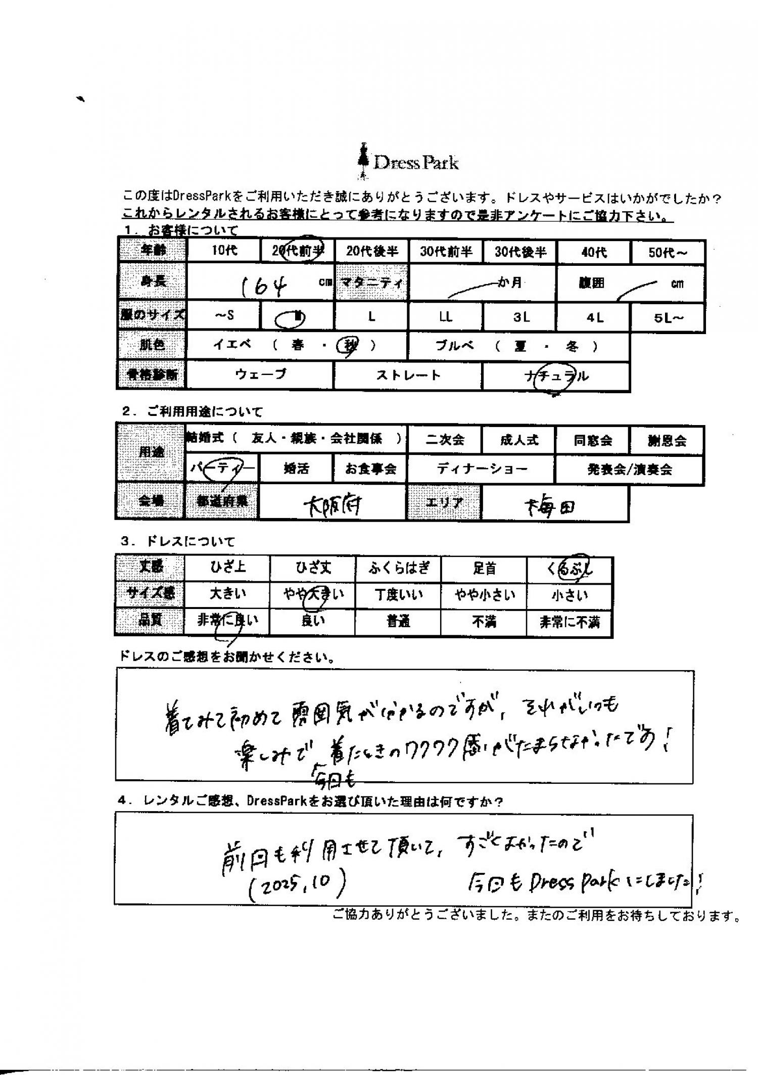 大阪府 A.K様164㎝ Mサイズ梅田・新大阪 #20代#M/L#160~164㎝#パーティー#大阪府#梅田・新大阪 ◆レンタルしたドレスはこちら ◆レンタルしたサイズは:M ◆レンタルした日付:2025/12/03 ドレスの着用感 ◆点数: (5点) ◆丈感:くるぶし ◆サイズ感:やや大きい ◆品質:非常に良い ◆肌色:イエベ ◆骨格診断:ナチュラル ドレスの感想 着てみて初めて雰囲気がわかるのですが、それがいつも楽しみで、今回も着たときのワクワク感がたまらなかったです! レンタルのご感想、DressParkをお選び頂いた理由 前回も利用させていただいて、すごく良かったので、今回もドレスパークにしました! CUSTOMER REVIEWS お客様の声 気になるカテゴリー別にご利用の感想をチェック! ◆AGE 年代で見る 10代 20代 30代 40代 50代~ ◆SIZE サイズで見る SS/S M/L 大きいサイズLL~ ◆HIGHT 身長で見る 140~149㎝ 150~154㎝ 155~159㎝ 160~164㎝ 165~169㎝ 170㎝以上 ◆マタニティ ~3か月 4~6か月 7~8か月 9~10か月 ◆肌色 イエベ ブルべ ◆骨格診断 ウェーブ ストレート ナチュラル ◆利用シーン 結婚式(友人) 結婚式(親族) 結婚式(会社関係) 二次会 成人式 謝恩会 パーティー その他 CUSTOMER REVIEWS都道府県別お客様の声 都道府県別にのお客様の声をチェック! 北海道 青森県 岩手県 宮城県 秋田県 山形県 福島県 茨城県 栃木県 群馬県 埼玉県 千葉県 東京都 神奈川県 新潟県 富山県 石川県 福井県 山梨県 長野県 岐阜県 静岡県 愛知県 三重県 滋賀県 京都府 大阪府 兵庫県 奈良県 和歌山県 鳥取県 島根県 岡山県 広島県 山口県 徳島県 香川県 愛媛県 高知県 福岡県 佐賀県 長崎県 熊本県 大分県 宮崎県 鹿児島県 沖縄県 CUSTOMER REVIEWSエリア別お客様の声 都道府県別にのお客様の声をチェック! 札幌 仙台 名古屋 軽井沢 金沢 神戸・芦屋 博多 那覇 梅田・新大阪 難波・心斎橋 鎌倉・湘南 横浜・みなとみらい 舞浜・浦安・幕張 大宮・浦和 青山・表参道 六本木・麻布 渋谷・恵比寿 新宿 池袋 銀座・丸の内 お台場・汐留 鹿児島市 郡山市 福島市 東予 甲府・石和 LINEでお問い合わせ このサイトではJavaScriptを使用しています