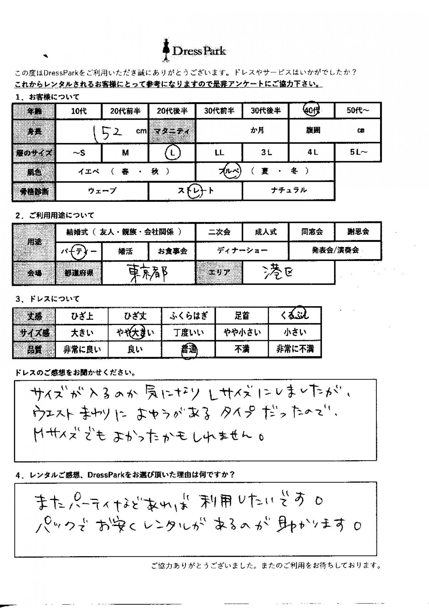 東京都 K.A様152㎝ Lサイズ六本木・麻布 #40代#M/L#150~154㎝#パーティー#東京都#六本木・麻布 ◆レンタルしたドレスはこちら ◆レンタルしたサイズは:L ◆レンタルした日付:2025/12/02 ドレスの着用感 ◆点数: (4点) ◆丈感:くるぶし ◆サイズ感:やや大きい ◆品質:普通 ◆肌色:ブルべ ◆骨格診断:ストレート ドレスの感想 サイズが入るのか気になり、Lサイズにしましたが、ウェスト周りに余裕のあるタイプだったので、Mサイズでも良かったかもしれません。 レンタルのご感想、DressParkをお選び頂いた理由 またパーティー等あれば利用したいです。パックでお安くレンタルがあるのが助かります。 CUSTOMER REVIEWS お客様の声 気になるカテゴリー別にご利用の感想をチェック! ◆AGE 年代で見る 10代 20代 30代 40代 50代~ ◆SIZE サイズで見る SS/S M/L 大きいサイズLL~ ◆HIGHT 身長で見る 140~149㎝ 150~154㎝ 155~159㎝ 160~164㎝ 165~169㎝ 170㎝以上 ◆マタニティ ~3か月 4~6か月 7~8か月 9~10か月 ◆肌色 イエベ ブルべ ◆骨格診断 ウェーブ ストレート ナチュラル ◆利用シーン 結婚式(友人) 結婚式(親族) 結婚式(会社関係) 二次会 成人式 謝恩会 パーティー その他 CUSTOMER REVIEWS都道府県別お客様の声 都道府県別にのお客様の声をチェック! 北海道 青森県 岩手県 宮城県 秋田県 山形県 福島県 茨城県 栃木県 群馬県 埼玉県 千葉県 東京都 神奈川県 新潟県 富山県 石川県 福井県 山梨県 長野県 岐阜県 静岡県 愛知県 三重県 滋賀県 京都府 大阪府 兵庫県 奈良県 和歌山県 鳥取県 島根県 岡山県 広島県 山口県 徳島県 香川県 愛媛県 高知県 福岡県 佐賀県 長崎県 熊本県 大分県 宮崎県 鹿児島県 沖縄県 CUSTOMER REVIEWSエリア別お客様の声 都道府県別にのお客様の声をチェック! 札幌 仙台 名古屋 軽井沢 金沢 神戸・芦屋 博多 那覇 梅田・新大阪 難波・心斎橋 鎌倉・湘南 横浜・みなとみらい 舞浜・浦安・幕張 大宮・浦和 青山・表参道 六本木・麻布 渋谷・恵比寿 新宿 池袋 銀座・丸の内 お台場・汐留 鹿児島市 郡山市 福島市 東予 甲府・石和 LINEでお問い合わせ このサイトではJavaScriptを使用しています