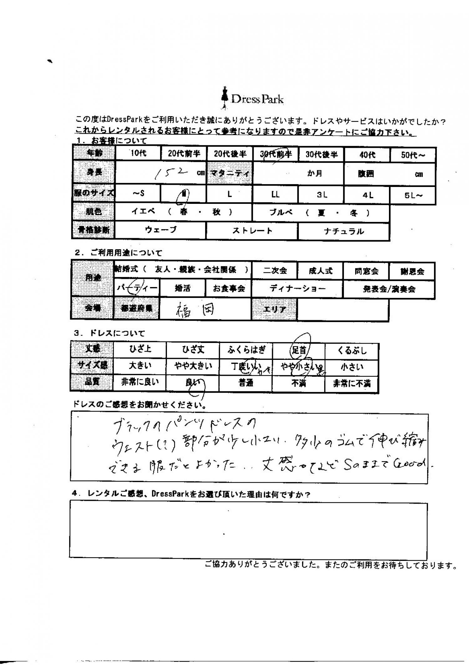 福岡県 S.K様152㎝ Mサイズ #30代#M/L#150~154㎝#パーティー#福岡県 ◆レンタルしたドレスはこちら ◆レンタルしたサイズは:S ◆レンタルした日付:2025/12/02 ドレスの着用感 ◆点数: (4点) ◆丈感:足首 ◆サイズ感:やや小さい ◆品質:良い ドレスの感想 ブラックのパンツドレスのウェスト(?)部分が少し小さい。多少のゴムで伸び縮みできる服だとよかった。丈感などSのままでGOOD。 CUSTOMER REVIEWS お客様の声 気になるカテゴリー別にご利用の感想をチェック! ◆AGE 年代で見る 10代 20代 30代 40代 50代~ ◆SIZE サイズで見る SS/S M/L 大きいサイズLL~ ◆HIGHT 身長で見る 140~149㎝ 150~154㎝ 155~159㎝ 160~164㎝ 165~169㎝ 170㎝以上 ◆マタニティ ~3か月 4~6か月 7~8か月 9~10か月 ◆肌色 イエベ ブルべ ◆骨格診断 ウェーブ ストレート ナチュラル ◆利用シーン 結婚式(友人) 結婚式(親族) 結婚式(会社関係) 二次会 成人式 謝恩会 パーティー その他 CUSTOMER REVIEWS都道府県別お客様の声 都道府県別にのお客様の声をチェック! 北海道 青森県 岩手県 宮城県 秋田県 山形県 福島県 茨城県 栃木県 群馬県 埼玉県 千葉県 東京都 神奈川県 新潟県 富山県 石川県 福井県 山梨県 長野県 岐阜県 静岡県 愛知県 三重県 滋賀県 京都府 大阪府 兵庫県 奈良県 和歌山県 鳥取県 島根県 岡山県 広島県 山口県 徳島県 香川県 愛媛県 高知県 福岡県 佐賀県 長崎県 熊本県 大分県 宮崎県 鹿児島県 沖縄県 CUSTOMER REVIEWSエリア別お客様の声 都道府県別にのお客様の声をチェック! 札幌 仙台 名古屋 軽井沢 金沢 神戸・芦屋 博多 那覇 梅田・新大阪 難波・心斎橋 鎌倉・湘南 横浜・みなとみらい 舞浜・浦安・幕張 大宮・浦和 青山・表参道 六本木・麻布 渋谷・恵比寿 新宿 池袋 銀座・丸の内 お台場・汐留 鹿児島市 郡山市 福島市 東予 甲府・石和 LINEでお問い合わせ このサイトではJavaScriptを使用しています