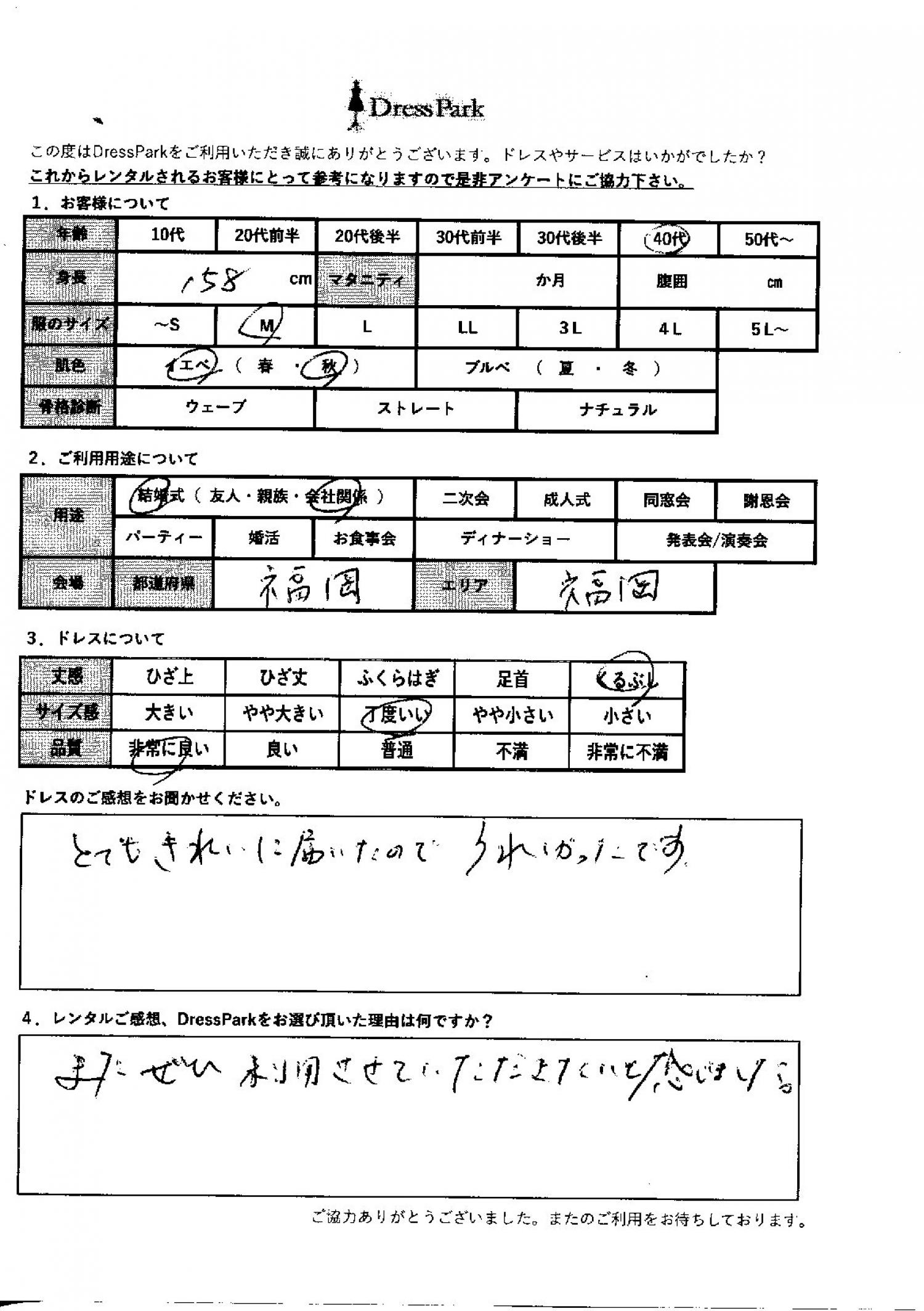 福岡県 E.S様158㎝ Mサイズ #40代#M/L#155~159㎝#結婚式(会社関係)#福岡県 ◆レンタルしたドレスはこちら ◆レンタルしたサイズは:M ◆レンタルした日付:2025/11/30 ドレスの着用感 ◆点数: (5点) ◆丈感:くるぶし ◆サイズ感:丁度いい ◆品質:非常に良い ◆肌色:イエベ ドレスの感想 とてもきれいに届いたので嬉しかったです。 レンタルのご感想、DressParkをお選び頂いた理由 またぜひ利用させていただきたいと感じました。 CUSTOMER REVIEWS お客様の声 気になるカテゴリー別にご利用の感想をチェック! ◆AGE 年代で見る 10代 20代 30代 40代 50代~ ◆SIZE サイズで見る SS/S M/L 大きいサイズLL~ ◆HIGHT 身長で見る 140~149㎝ 150~154㎝ 155~159㎝ 160~164㎝ 165~169㎝ 170㎝以上 ◆マタニティ ~3か月 4~6か月 7~8か月 9~10か月 ◆肌色 イエベ ブルべ ◆骨格診断 ウェーブ ストレート ナチュラル ◆利用シーン 結婚式(友人) 結婚式(親族) 結婚式(会社関係) 二次会 成人式 謝恩会 パーティー その他 CUSTOMER REVIEWS都道府県別お客様の声 都道府県別にのお客様の声をチェック! 北海道 青森県 岩手県 宮城県 秋田県 山形県 福島県 茨城県 栃木県 群馬県 埼玉県 千葉県 東京都 神奈川県 新潟県 富山県 石川県 福井県 山梨県 長野県 岐阜県 静岡県 愛知県 三重県 滋賀県 京都府 大阪府 兵庫県 奈良県 和歌山県 鳥取県 島根県 岡山県 広島県 山口県 徳島県 香川県 愛媛県 高知県 福岡県 佐賀県 長崎県 熊本県 大分県 宮崎県 鹿児島県 沖縄県 CUSTOMER REVIEWSエリア別お客様の声 都道府県別にのお客様の声をチェック! 札幌 仙台 名古屋 軽井沢 金沢 神戸・芦屋 博多 那覇 梅田・新大阪 難波・心斎橋 鎌倉・湘南 横浜・みなとみらい 舞浜・浦安・幕張 大宮・浦和 青山・表参道 六本木・麻布 渋谷・恵比寿 新宿 池袋 銀座・丸の内 お台場・汐留 鹿児島市 郡山市 福島市 東予 甲府・石和 LINEでお問い合わせ このサイトではJavaScriptを使用しています