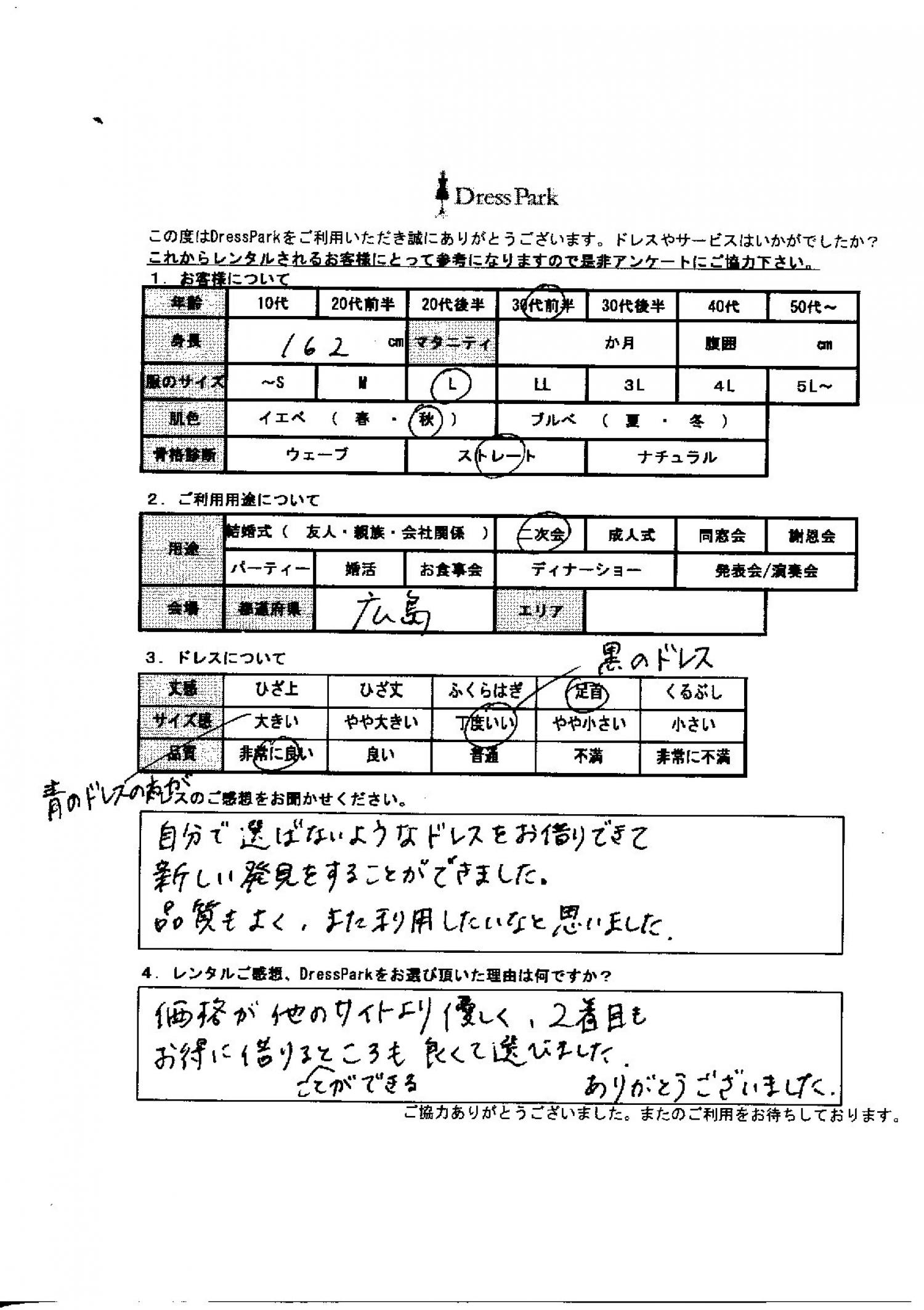 広島県 S.F様162㎝ Lサイズ #30代#M/L#160~164㎝#二次会#広島県 ◆レンタルしたドレスはこちら ◆レンタルしたサイズは:L ◆レンタルした日付:2025/12/04 ドレスの着用感 ◆点数: (5点) ◆丈感:足首 ◆サイズ感:丁度いい ◆品質:非常に良い ◆肌色:イエベ ◆骨格診断:ストレート ドレスの感想 自分で選ばないようなドレスをお借りできて、新しい発見をすることができました。品質も良くまた利用したいと思いました。 レンタルのご感想、DressParkをお選び頂いた理由 価格が他のサイトより優しく、2着目もお得に借りることができるところも良くて選びました。ありがとうございました。 CUSTOMER REVIEWS お客様の声 気になるカテゴリー別にご利用の感想をチェック! ◆AGE 年代で見る 10代 20代 30代 40代 50代~ ◆SIZE サイズで見る SS/S M/L 大きいサイズLL~ ◆HIGHT 身長で見る 140~149㎝ 150~154㎝ 155~159㎝ 160~164㎝ 165~169㎝ 170㎝以上 ◆マタニティ ~3か月 4~6か月 7~8か月 9~10か月 ◆肌色 イエベ ブルべ ◆骨格診断 ウェーブ ストレート ナチュラル ◆利用シーン 結婚式(友人) 結婚式(親族) 結婚式(会社関係) 二次会 成人式 謝恩会 パーティー その他 CUSTOMER REVIEWS都道府県別お客様の声 都道府県別にのお客様の声をチェック! 北海道 青森県 岩手県 宮城県 秋田県 山形県 福島県 茨城県 栃木県 群馬県 埼玉県 千葉県 東京都 神奈川県 新潟県 富山県 石川県 福井県 山梨県 長野県 岐阜県 静岡県 愛知県 三重県 滋賀県 京都府 大阪府 兵庫県 奈良県 和歌山県 鳥取県 島根県 岡山県 広島県 山口県 徳島県 香川県 愛媛県 高知県 福岡県 佐賀県 長崎県 熊本県 大分県 宮崎県 鹿児島県 沖縄県 CUSTOMER REVIEWSエリア別お客様の声 都道府県別にのお客様の声をチェック! 札幌 仙台 名古屋 軽井沢 金沢 神戸・芦屋 博多 那覇 梅田・新大阪 難波・心斎橋 鎌倉・湘南 横浜・みなとみらい 舞浜・浦安・幕張 大宮・浦和 青山・表参道 六本木・麻布 渋谷・恵比寿 新宿 池袋 銀座・丸の内 お台場・汐留 鹿児島市 郡山市 福島市 東予 甲府・石和 LINEでお問い合わせ このサイトではJavaScriptを使用しています