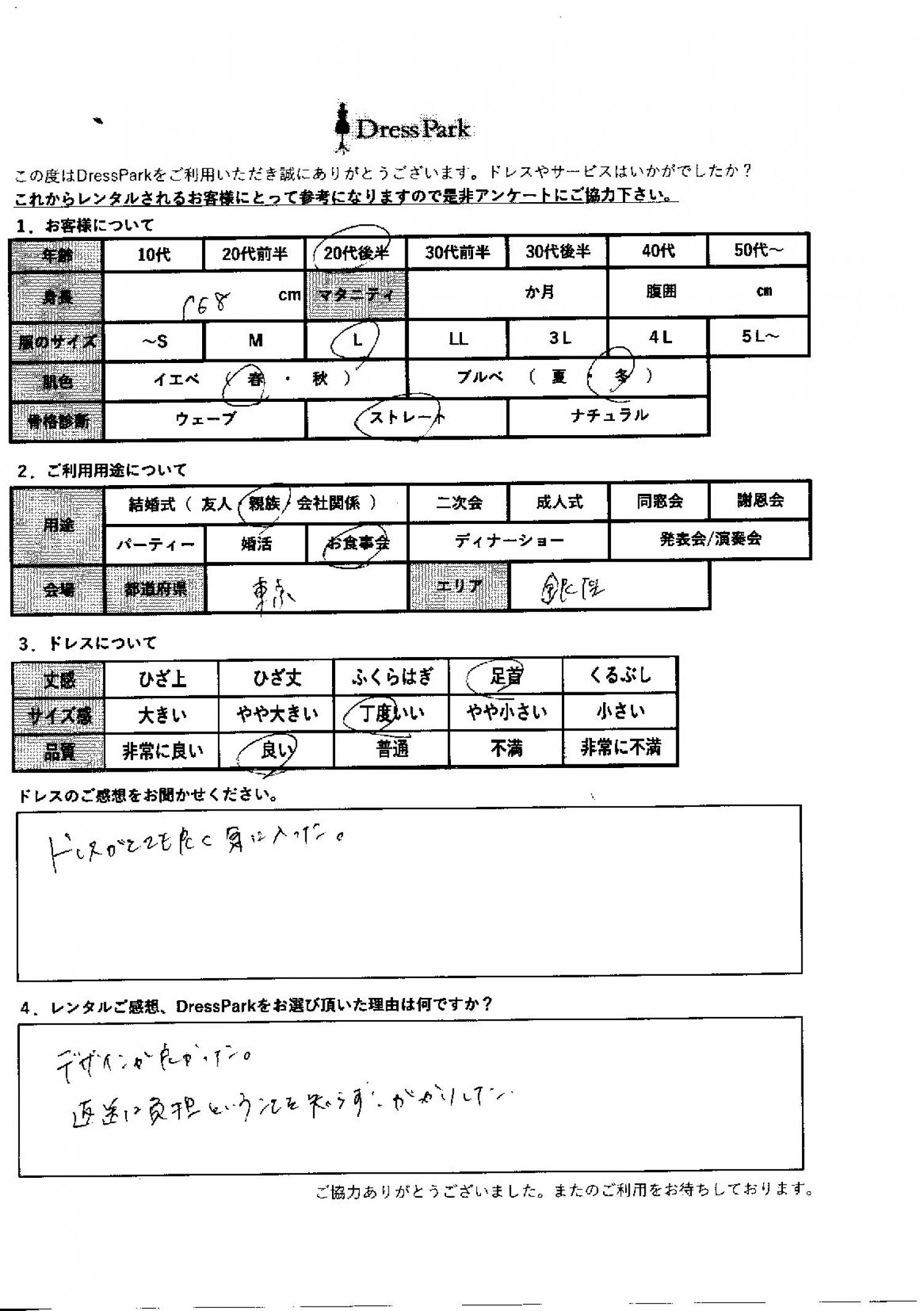 東京都 A,M様168㎝ Lサイズ銀座・丸の内 #20代#M/L#165~169㎝#結婚式(親族)#東京都#銀座・丸の内 ◆レンタルしたドレスはこちら ◆レンタルしたサイズは:L ◆レンタルした日付:2025/12/07 ドレスの着用感 ◆点数: (4点) ◆丈感:足首 ◆サイズ感:丁度いい ◆品質:良い ◆肌色:イエベ ◆骨格診断:ストレート ドレスの感想 ドレスがとてもよく気に入った。 レンタルのご感想、DressParkをお選び頂いた理由 デザインが良かった。返送は負担ということを知らずがっかりした。 CUSTOMER REVIEWS お客様の声 気になるカテゴリー別にご利用の感想をチェック! ◆AGE 年代で見る 10代 20代 30代 40代 50代~ ◆SIZE サイズで見る SS/S M/L 大きいサイズLL~ ◆HIGHT 身長で見る 140~149㎝ 150~154㎝ 155~159㎝ 160~164㎝ 165~169㎝ 170㎝以上 ◆マタニティ ~3か月 4~6か月 7~8か月 9~10か月 ◆肌色 イエベ ブルべ ◆骨格診断 ウェーブ ストレート ナチュラル ◆利用シーン 結婚式(友人) 結婚式(親族) 結婚式(会社関係) 二次会 成人式 謝恩会 パーティー その他 CUSTOMER REVIEWS都道府県別お客様の声 都道府県別にのお客様の声をチェック! 北海道 青森県 岩手県 宮城県 秋田県 山形県 福島県 茨城県 栃木県 群馬県 埼玉県 千葉県 東京都 神奈川県 新潟県 富山県 石川県 福井県 山梨県 長野県 岐阜県 静岡県 愛知県 三重県 滋賀県 京都府 大阪府 兵庫県 奈良県 和歌山県 鳥取県 島根県 岡山県 広島県 山口県 徳島県 香川県 愛媛県 高知県 福岡県 佐賀県 長崎県 熊本県 大分県 宮崎県 鹿児島県 沖縄県 CUSTOMER REVIEWSエリア別お客様の声 都道府県別にのお客様の声をチェック! 札幌 仙台 名古屋 軽井沢 金沢 神戸・芦屋 博多 那覇 梅田・新大阪 難波・心斎橋 鎌倉・湘南 横浜・みなとみらい 舞浜・浦安・幕張 大宮・浦和 青山・表参道 六本木・麻布 渋谷・恵比寿 新宿 池袋 銀座・丸の内 お台場・汐留 鹿児島市 郡山市 福島市 東予 甲府・石和 LINEでお問い合わせ このサイトではJavaScriptを使用しています