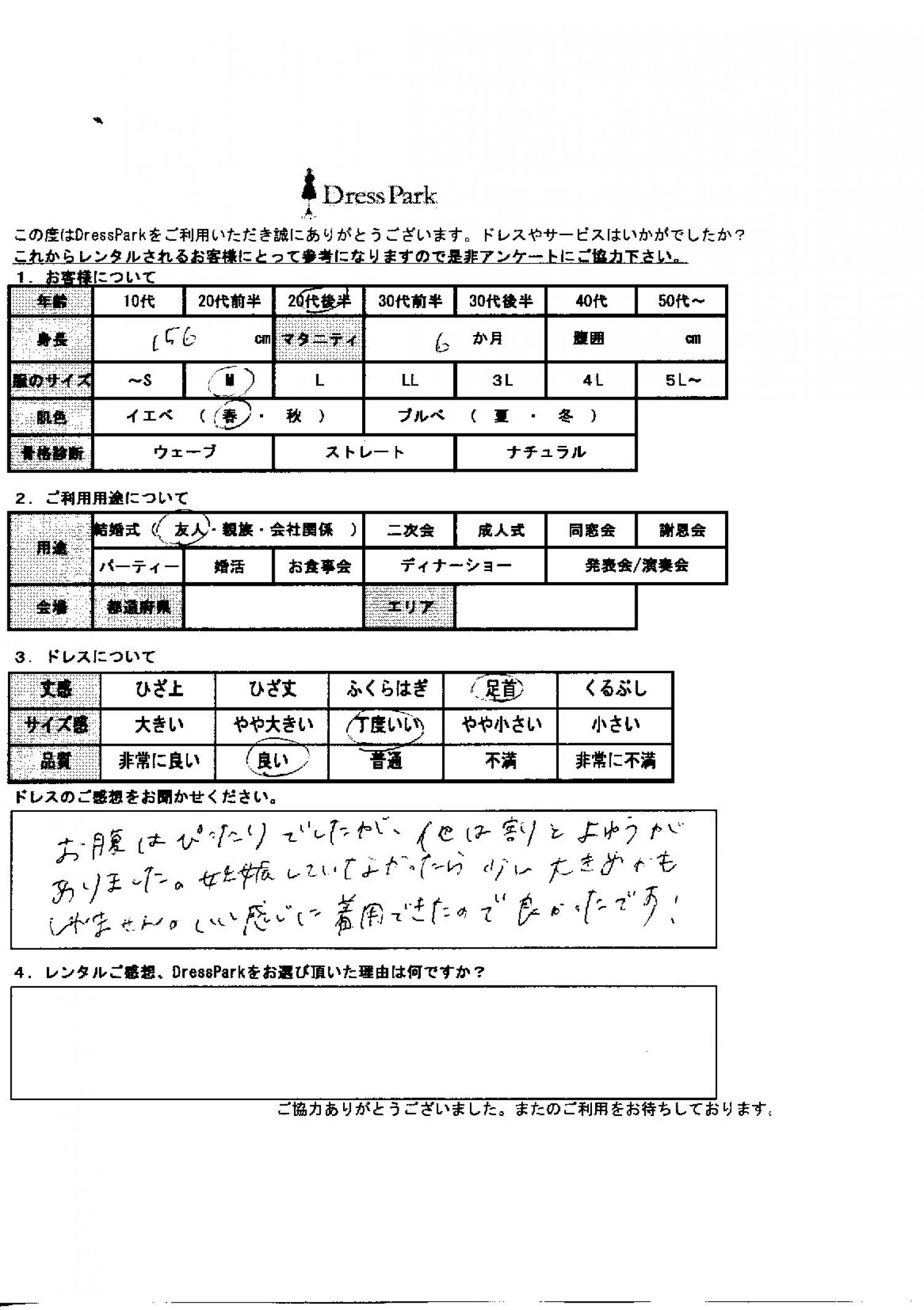 千葉県 Y.K様156㎝ Mサイズ マタニティ #20代#M/L#155~159㎝#結婚式(友人)#千葉県 ◆レンタルしたドレスはこちら ◆レンタルしたサイズは:M ◆レンタルした日付:2025/12/06 ドレスの着用感 ◆点数: (4点) ◆丈感:足首 ◆サイズ感:丁度いい ◆品質:良い ◆マタニティ: ◆肌色:イエベ ドレスの感想 お腹はぴったりでしたが、外は割と余裕がありました。妊娠していなかったら少し大きめかもしれません。良い感じに着用できたので、よかったです! CUSTOMER REVIEWS お客様の声 気になるカテゴリー別にご利用の感想をチェック! ◆AGE 年代で見る 10代 20代 30代 40代 50代~ ◆SIZE サイズで見る SS/S M/L 大きいサイズLL~ ◆HIGHT 身長で見る 140~149㎝ 150~154㎝ 155~159㎝ 160~164㎝ 165~169㎝ 170㎝以上 ◆マタニティ ~3か月 4~6か月 7~8か月 9~10か月 ◆肌色 イエベ ブルべ ◆骨格診断 ウェーブ ストレート ナチュラル ◆利用シーン 結婚式(友人) 結婚式(親族) 結婚式(会社関係) 二次会 成人式 謝恩会 パーティー その他 CUSTOMER REVIEWS都道府県別お客様の声 都道府県別にのお客様の声をチェック! 北海道 青森県 岩手県 宮城県 秋田県 山形県 福島県 茨城県 栃木県 群馬県 埼玉県 千葉県 東京都 神奈川県 新潟県 富山県 石川県 福井県 山梨県 長野県 岐阜県 静岡県 愛知県 三重県 滋賀県 京都府 大阪府 兵庫県 奈良県 和歌山県 鳥取県 島根県 岡山県 広島県 山口県 徳島県 香川県 愛媛県 高知県 福岡県 佐賀県 長崎県 熊本県 大分県 宮崎県 鹿児島県 沖縄県 CUSTOMER REVIEWSエリア別お客様の声 都道府県別にのお客様の声をチェック! 札幌 仙台 名古屋 軽井沢 金沢 神戸・芦屋 博多 那覇 梅田・新大阪 難波・心斎橋 鎌倉・湘南 横浜・みなとみらい 舞浜・浦安・幕張 大宮・浦和 青山・表参道 六本木・麻布 渋谷・恵比寿 新宿 池袋 銀座・丸の内 お台場・汐留 鹿児島市 郡山市 福島市 東予 甲府・石和 LINEでお問い合わせ このサイトではJavaScriptを使用しています