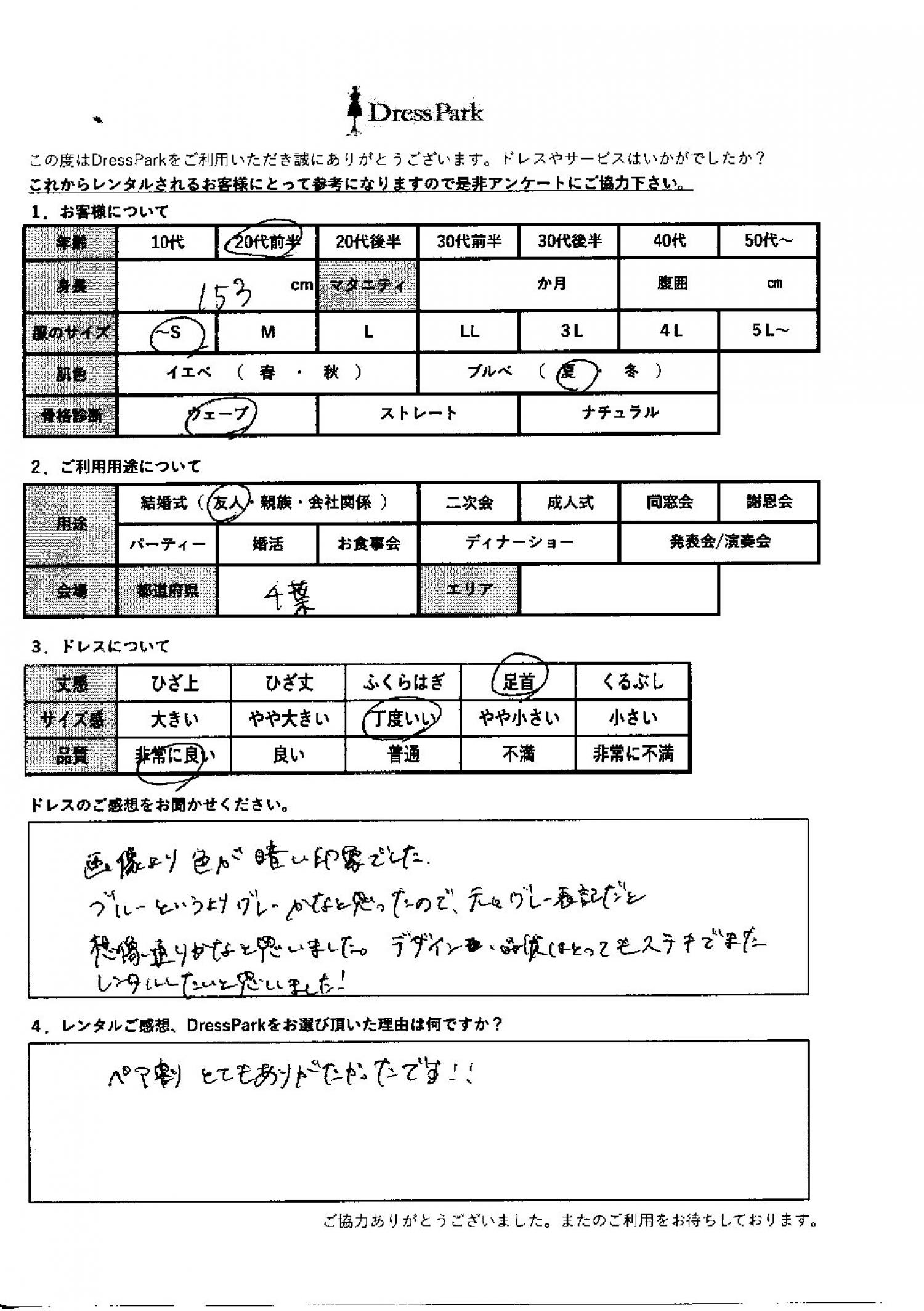 千葉県 E.T様153㎝ ~Sサイズ #20代#SS/S#150~154㎝#結婚式(友人)#千葉県 ◆レンタルしたドレスはこちら ◆レンタルしたサイズは:M ◆レンタルした日付:2025/12/06 ドレスの着用感 ◆点数: (5点) ◆丈感:足首 ◆サイズ感:丁度いい ◆品質:非常に良い ◆肌色:ブルべ ◆骨格診断:ウェーブ ドレスの感想 画像より色が暗い印象でした。ブルーというよりグレーかなと思ったので、もともとグレー表記だと早々通りかなと思いました。デザイン、品質はとても素敵で、またレンタルしたいと思いました! レンタルのご感想、DressParkをお選び頂いた理由 ペア割り、とてもありがたかったです! CUSTOMER REVIEWS お客様の声 気になるカテゴリー別にご利用の感想をチェック! ◆AGE 年代で見る 10代 20代 30代 40代 50代~ ◆SIZE サイズで見る SS/S M/L 大きいサイズLL~ ◆HIGHT 身長で見る 140~149㎝ 150~154㎝ 155~159㎝ 160~164㎝ 165~169㎝ 170㎝以上 ◆マタニティ ~3か月 4~6か月 7~8か月 9~10か月 ◆肌色 イエベ ブルべ ◆骨格診断 ウェーブ ストレート ナチュラル ◆利用シーン 結婚式(友人) 結婚式(親族) 結婚式(会社関係) 二次会 成人式 謝恩会 パーティー その他 CUSTOMER REVIEWS都道府県別お客様の声 都道府県別にのお客様の声をチェック! 北海道 青森県 岩手県 宮城県 秋田県 山形県 福島県 茨城県 栃木県 群馬県 埼玉県 千葉県 東京都 神奈川県 新潟県 富山県 石川県 福井県 山梨県 長野県 岐阜県 静岡県 愛知県 三重県 滋賀県 京都府 大阪府 兵庫県 奈良県 和歌山県 鳥取県 島根県 岡山県 広島県 山口県 徳島県 香川県 愛媛県 高知県 福岡県 佐賀県 長崎県 熊本県 大分県 宮崎県 鹿児島県 沖縄県 CUSTOMER REVIEWSエリア別お客様の声 都道府県別にのお客様の声をチェック! 札幌 仙台 名古屋 軽井沢 金沢 神戸・芦屋 博多 那覇 梅田・新大阪 難波・心斎橋 鎌倉・湘南 横浜・みなとみらい 舞浜・浦安・幕張 大宮・浦和 青山・表参道 六本木・麻布 渋谷・恵比寿 新宿 池袋 銀座・丸の内 お台場・汐留 鹿児島市 郡山市 福島市 東予 甲府・石和 LINEでお問い合わせ このサイトではJavaScriptを使用しています
