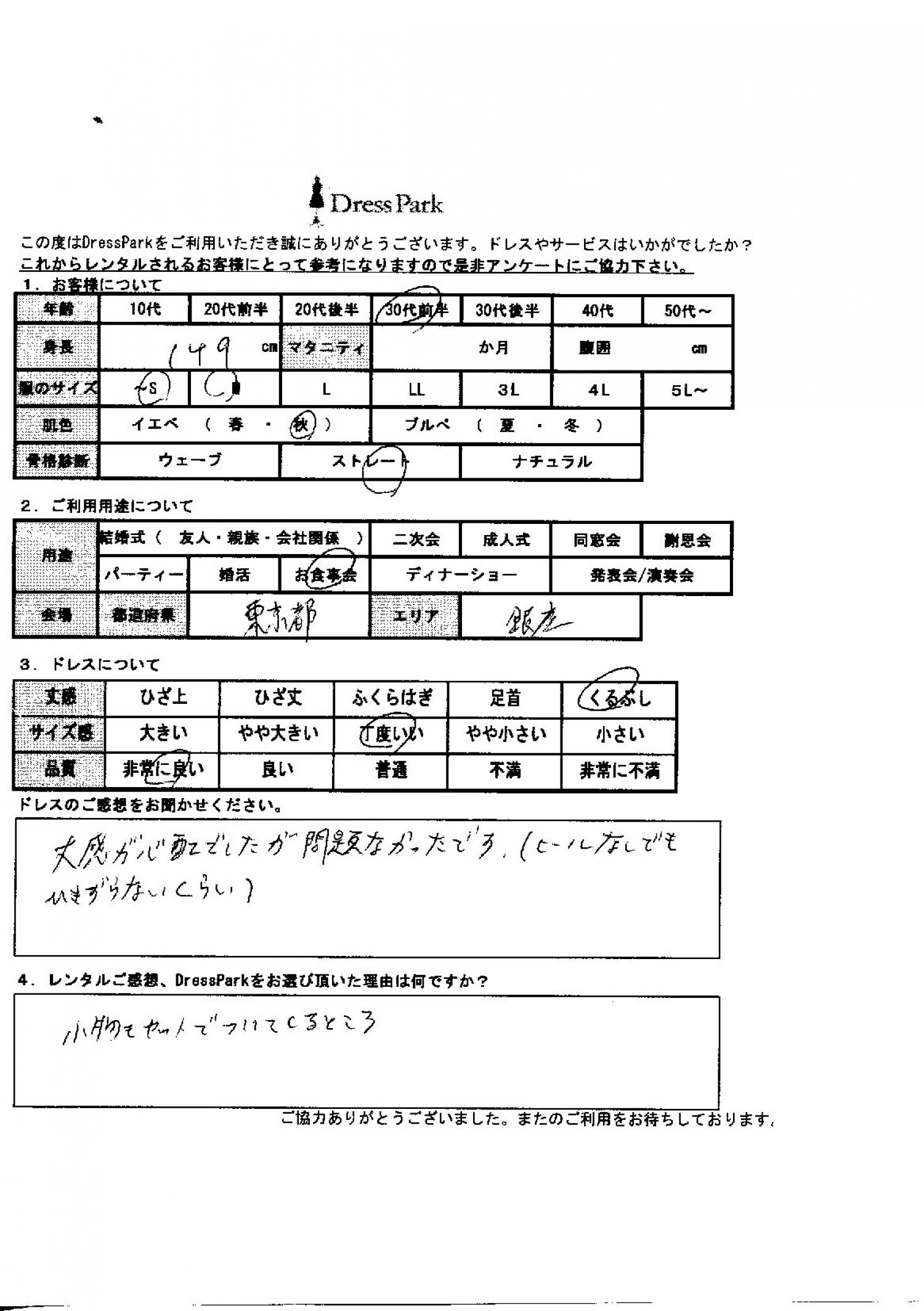 東京都 A.F様149㎝ Mサイズ銀座・丸の内 #30代#M/L#140~149㎝#その他#東京都#銀座・丸の内 ◆レンタルしたドレスはこちら ◆レンタルしたサイズは:M ◆レンタルした日付:2025/12/06 ドレスの着用感 ◆点数: (5点) ◆丈感:くるぶし ◆サイズ感:丁度いい ◆品質:非常に良い ◆肌色:イエベ ◆骨格診断:ストレート ドレスの感想 丈感が心配でしたが、問題なかったです。(ヒールなしでも引きずらない位) レンタルのご感想、DressParkをお選び頂いた理由 小物がセットでついてくるところ。 CUSTOMER REVIEWS お客様の声 気になるカテゴリー別にご利用の感想をチェック! ◆AGE 年代で見る 10代 20代 30代 40代 50代~ ◆SIZE サイズで見る SS/S M/L 大きいサイズLL~ ◆HIGHT 身長で見る 140~149㎝ 150~154㎝ 155~159㎝ 160~164㎝ 165~169㎝ 170㎝以上 ◆マタニティ ~3か月 4~6か月 7~8か月 9~10か月 ◆肌色 イエベ ブルべ ◆骨格診断 ウェーブ ストレート ナチュラル ◆利用シーン 結婚式(友人) 結婚式(親族) 結婚式(会社関係) 二次会 成人式 謝恩会 パーティー その他 CUSTOMER REVIEWS都道府県別お客様の声 都道府県別にのお客様の声をチェック! 北海道 青森県 岩手県 宮城県 秋田県 山形県 福島県 茨城県 栃木県 群馬県 埼玉県 千葉県 東京都 神奈川県 新潟県 富山県 石川県 福井県 山梨県 長野県 岐阜県 静岡県 愛知県 三重県 滋賀県 京都府 大阪府 兵庫県 奈良県 和歌山県 鳥取県 島根県 岡山県 広島県 山口県 徳島県 香川県 愛媛県 高知県 福岡県 佐賀県 長崎県 熊本県 大分県 宮崎県 鹿児島県 沖縄県 CUSTOMER REVIEWSエリア別お客様の声 都道府県別にのお客様の声をチェック! 札幌 仙台 名古屋 軽井沢 金沢 神戸・芦屋 博多 那覇 梅田・新大阪 難波・心斎橋 鎌倉・湘南 横浜・みなとみらい 舞浜・浦安・幕張 大宮・浦和 青山・表参道 六本木・麻布 渋谷・恵比寿 新宿 池袋 銀座・丸の内 お台場・汐留 鹿児島市 郡山市 福島市 東予 甲府・石和 LINEでお問い合わせ このサイトではJavaScriptを使用しています