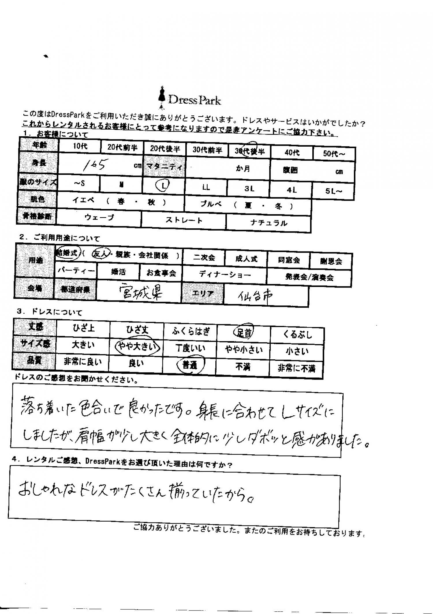 宮城県 K.S様165㎝ Lサイズ仙台 #30代#M/L#165~169㎝#結婚式(友人)#宮城県#仙台 ◆レンタルしたドレスはこちら ◆レンタルしたサイズは:L ◆レンタルした日付:2025/12/06 ドレスの着用感 ◆点数: (4点) ◆丈感:足首 ◆サイズ感:やや大きい ◆品質:普通 ドレスの感想 落ち着いた色合いでよかったです。身長に合わせてLサイズにしましたが、肩幅が少し大きく全体的に少しだぼっと感がありました。 レンタルのご感想、DressParkをお選び頂いた理由 おしゃれなドレスがたくさん揃っていたから。 CUSTOMER REVIEWS お客様の声 気になるカテゴリー別にご利用の感想をチェック! ◆AGE 年代で見る 10代 20代 30代 40代 50代~ ◆SIZE サイズで見る SS/S M/L 大きいサイズLL~ ◆HIGHT 身長で見る 140~149㎝ 150~154㎝ 155~159㎝ 160~164㎝ 165~169㎝ 170㎝以上 ◆マタニティ ~3か月 4~6か月 7~8か月 9~10か月 ◆肌色 イエベ ブルべ ◆骨格診断 ウェーブ ストレート ナチュラル ◆利用シーン 結婚式(友人) 結婚式(親族) 結婚式(会社関係) 二次会 成人式 謝恩会 パーティー その他 CUSTOMER REVIEWS都道府県別お客様の声 都道府県別にのお客様の声をチェック! 北海道 青森県 岩手県 宮城県 秋田県 山形県 福島県 茨城県 栃木県 群馬県 埼玉県 千葉県 東京都 神奈川県 新潟県 富山県 石川県 福井県 山梨県 長野県 岐阜県 静岡県 愛知県 三重県 滋賀県 京都府 大阪府 兵庫県 奈良県 和歌山県 鳥取県 島根県 岡山県 広島県 山口県 徳島県 香川県 愛媛県 高知県 福岡県 佐賀県 長崎県 熊本県 大分県 宮崎県 鹿児島県 沖縄県 CUSTOMER REVIEWSエリア別お客様の声 都道府県別にのお客様の声をチェック! 札幌 仙台 名古屋 軽井沢 金沢 神戸・芦屋 博多 那覇 梅田・新大阪 難波・心斎橋 鎌倉・湘南 横浜・みなとみらい 舞浜・浦安・幕張 大宮・浦和 青山・表参道 六本木・麻布 渋谷・恵比寿 新宿 池袋 銀座・丸の内 お台場・汐留 鹿児島市 郡山市 福島市 東予 甲府・石和 LINEでお問い合わせ このサイトではJavaScriptを使用しています