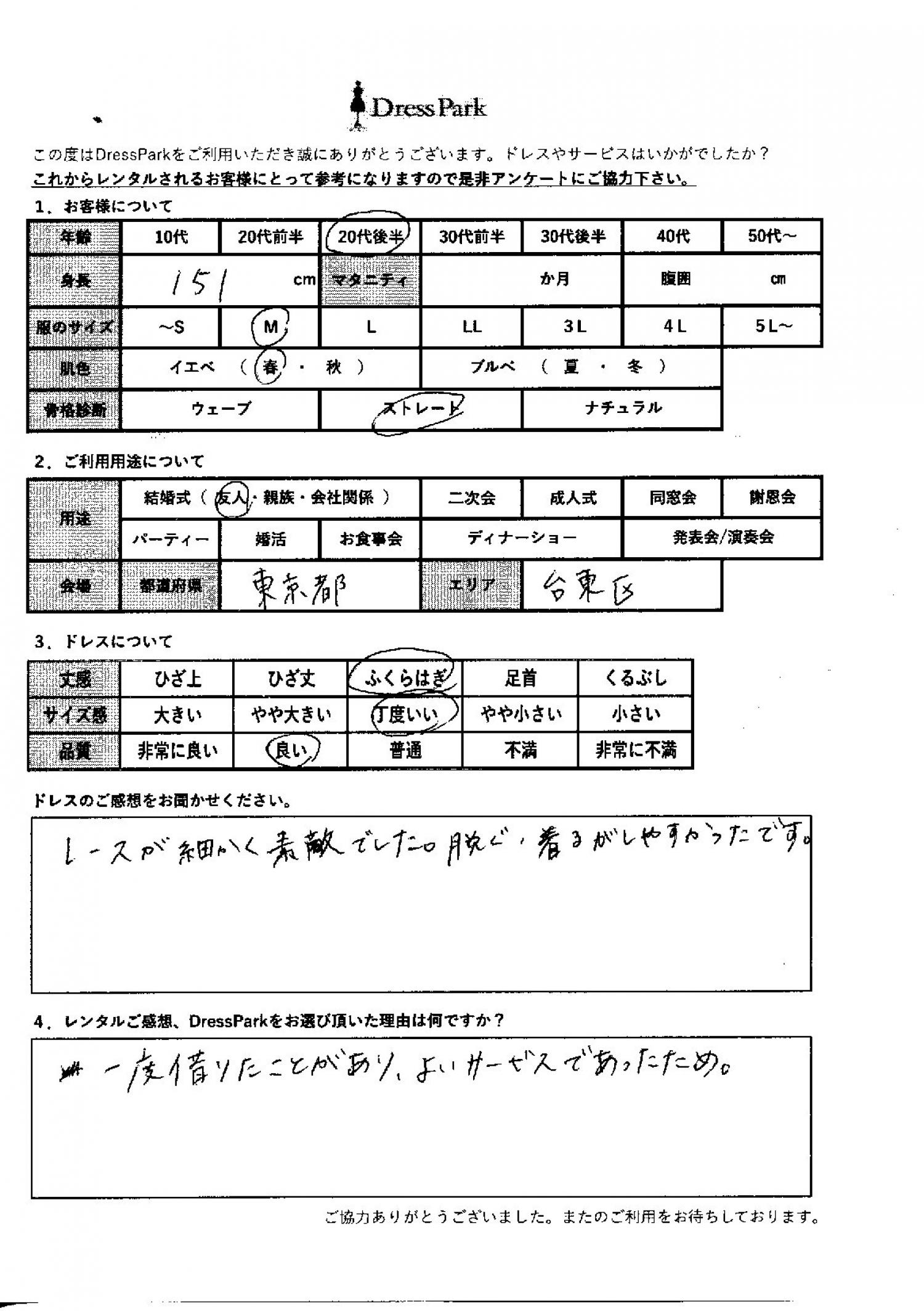 東京都 H.D様151㎝ Mサイズ #20代#M/L#150~154㎝#結婚式(友人)#東京都 ◆レンタルしたドレスはこちら ◆レンタルしたサイズは:M ◆レンタルした日付:2025/12/06 ドレスの着用感 ◆点数: (4点) ◆丈感:ふくらはぎ ◆サイズ感:丁度いい ◆品質:良い ◆肌色:イエベ ◆骨格診断:ストレート ドレスの感想 レースが細く素敵でした。脱ぐ着るがしやすかったです。 レンタルのご感想、DressParkをお選び頂いた理由 1度借りたことがあり、良いサービスであったため。 CUSTOMER REVIEWS お客様の声 気になるカテゴリー別にご利用の感想をチェック! ◆AGE 年代で見る 10代 20代 30代 40代 50代~ ◆SIZE サイズで見る SS/S M/L 大きいサイズLL~ ◆HIGHT 身長で見る 140~149㎝ 150~154㎝ 155~159㎝ 160~164㎝ 165~169㎝ 170㎝以上 ◆マタニティ ~3か月 4~6か月 7~8か月 9~10か月 ◆肌色 イエベ ブルべ ◆骨格診断 ウェーブ ストレート ナチュラル ◆利用シーン 結婚式(友人) 結婚式(親族) 結婚式(会社関係) 二次会 成人式 謝恩会 パーティー その他 CUSTOMER REVIEWS都道府県別お客様の声 都道府県別にのお客様の声をチェック! 北海道 青森県 岩手県 宮城県 秋田県 山形県 福島県 茨城県 栃木県 群馬県 埼玉県 千葉県 東京都 神奈川県 新潟県 富山県 石川県 福井県 山梨県 長野県 岐阜県 静岡県 愛知県 三重県 滋賀県 京都府 大阪府 兵庫県 奈良県 和歌山県 鳥取県 島根県 岡山県 広島県 山口県 徳島県 香川県 愛媛県 高知県 福岡県 佐賀県 長崎県 熊本県 大分県 宮崎県 鹿児島県 沖縄県 CUSTOMER REVIEWSエリア別お客様の声 都道府県別にのお客様の声をチェック! 札幌 仙台 名古屋 軽井沢 金沢 神戸・芦屋 博多 那覇 梅田・新大阪 難波・心斎橋 鎌倉・湘南 横浜・みなとみらい 舞浜・浦安・幕張 大宮・浦和 青山・表参道 六本木・麻布 渋谷・恵比寿 新宿 池袋 銀座・丸の内 お台場・汐留 鹿児島市 郡山市 福島市 東予 甲府・石和 LINEでお問い合わせ このサイトではJavaScriptを使用しています