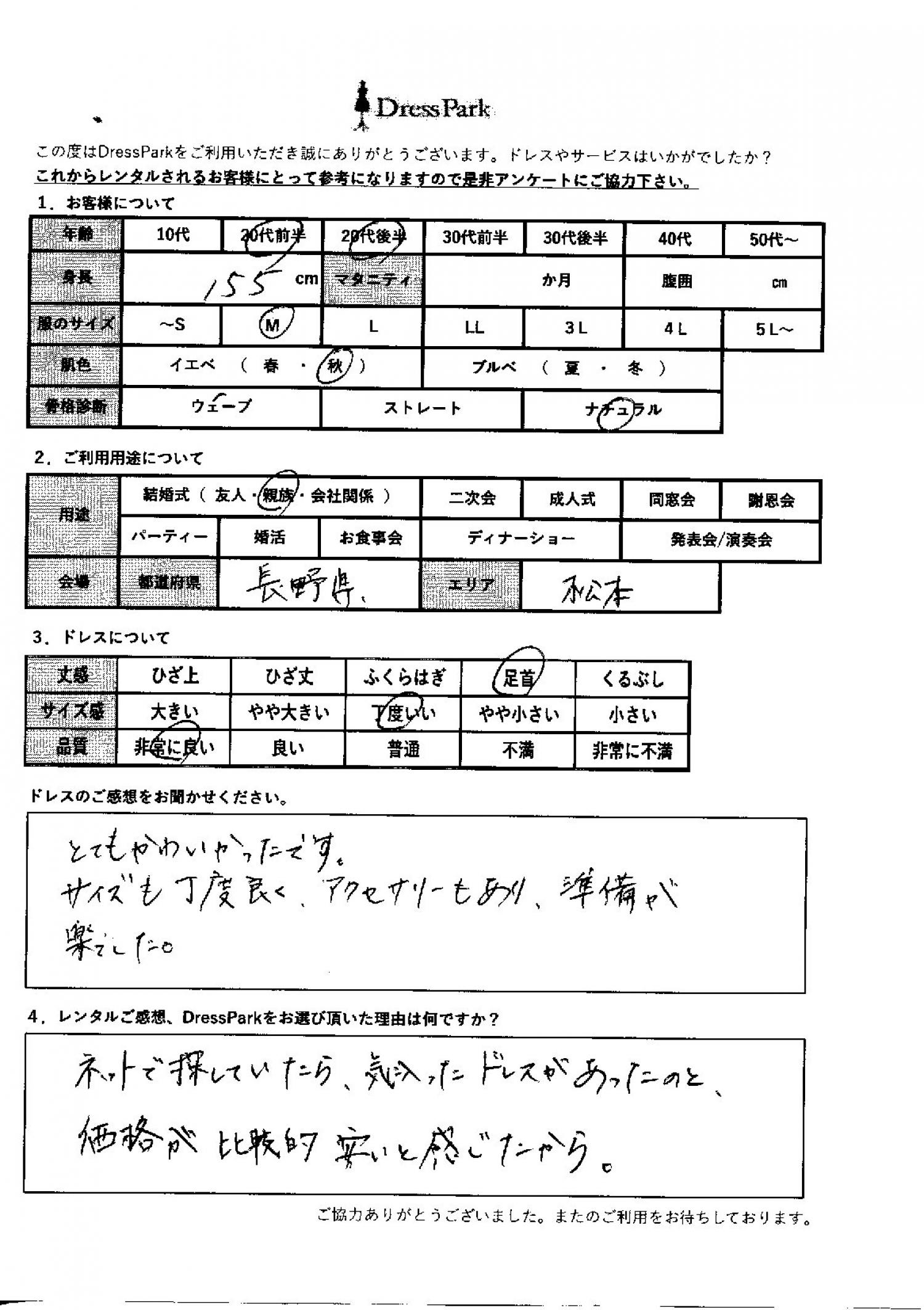 長野県 N.O様155㎝ Mサイズ #20代#M/L#155~159㎝#結婚式(親族)#長野県 ◆レンタルしたドレスはこちら ◆レンタルしたサイズは:M ◆レンタルした日付:2025/12/06 ドレスの着用感 ◆点数: (5点) ◆丈感:足首 ◆サイズ感:丁度いい ◆品質:非常に良い ◆肌色:イエベ ◆骨格診断:ナチュラル ドレスの感想 とても可愛かったです。サイズもちょうど良く、アクセサリーもあり、準備が楽でした。 レンタルのご感想、DressParkをお選び頂いた理由 ネットで探していたら、気に入ったドレスがあったのと、価格が比較的安いと感じたから。 CUSTOMER REVIEWS お客様の声 気になるカテゴリー別にご利用の感想をチェック! ◆AGE 年代で見る 10代 20代 30代 40代 50代~ ◆SIZE サイズで見る SS/S M/L 大きいサイズLL~ ◆HIGHT 身長で見る 140~149㎝ 150~154㎝ 155~159㎝ 160~164㎝ 165~169㎝ 170㎝以上 ◆マタニティ ~3か月 4~6か月 7~8か月 9~10か月 ◆肌色 イエベ ブルべ ◆骨格診断 ウェーブ ストレート ナチュラル ◆利用シーン 結婚式(友人) 結婚式(親族) 結婚式(会社関係) 二次会 成人式 謝恩会 パーティー その他 CUSTOMER REVIEWS都道府県別お客様の声 都道府県別にのお客様の声をチェック! 北海道 青森県 岩手県 宮城県 秋田県 山形県 福島県 茨城県 栃木県 群馬県 埼玉県 千葉県 東京都 神奈川県 新潟県 富山県 石川県 福井県 山梨県 長野県 岐阜県 静岡県 愛知県 三重県 滋賀県 京都府 大阪府 兵庫県 奈良県 和歌山県 鳥取県 島根県 岡山県 広島県 山口県 徳島県 香川県 愛媛県 高知県 福岡県 佐賀県 長崎県 熊本県 大分県 宮崎県 鹿児島県 沖縄県 CUSTOMER REVIEWSエリア別お客様の声 都道府県別にのお客様の声をチェック! 札幌 仙台 名古屋 軽井沢 金沢 神戸・芦屋 博多 那覇 梅田・新大阪 難波・心斎橋 鎌倉・湘南 横浜・みなとみらい 舞浜・浦安・幕張 大宮・浦和 青山・表参道 六本木・麻布 渋谷・恵比寿 新宿 池袋 銀座・丸の内 お台場・汐留 鹿児島市 郡山市 福島市 東予 甲府・石和 LINEでお問い合わせ このサイトではJavaScriptを使用しています