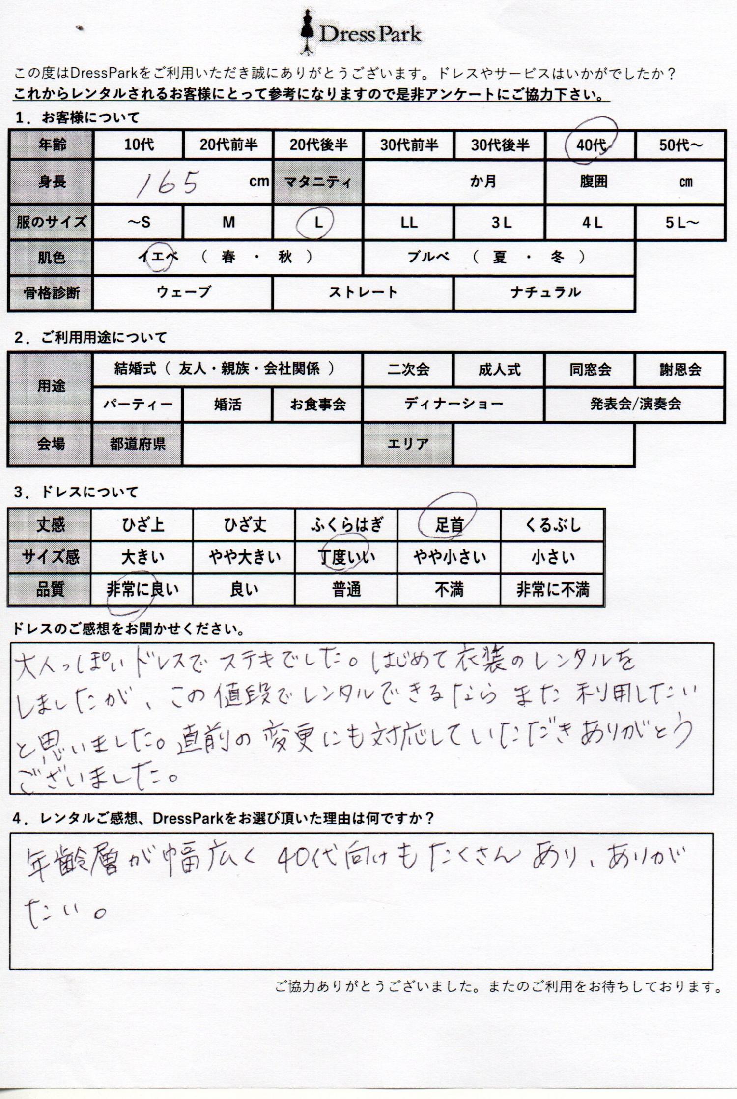 神奈川県 Y.I様165㎝ Lサイズ #40代#M/L#165~169㎝#結婚式(友人)#神奈川県 ◆レンタルしたドレスはこちら ◆レンタルしたサイズは:L ◆レンタルした日付:2025/12/07 ドレスの着用感 ◆点数: (5点) ◆丈感:足首 ◆サイズ感:丁度いい ◆品質:非常に良い ◆肌色:イエベ ドレスの感想 大人っぽいドレスで素敵でした。初めて衣装のレンタルをしましたが、この値段でレンタルできるならまた利用したいと思いました。直前の変更にも対応していただきありがとうございました。 レンタルのご感想、DressParkをお選び頂いた理由 年齢層が幅広く40代向けもたくさんありありがたい。 CUSTOMER REVIEWS お客様の声 気になるカテゴリー別にご利用の感想をチェック! ◆AGE 年代で見る 10代 20代 30代 40代 50代~ ◆SIZE サイズで見る SS/S M/L 大きいサイズLL~ ◆HIGHT 身長で見る 140~149㎝ 150~154㎝ 155~159㎝ 160~164㎝ 165~169㎝ 170㎝以上 ◆マタニティ ~3か月 4~6か月 7~8か月 9~10か月 ◆肌色 イエベ ブルべ ◆骨格診断 ウェーブ ストレート ナチュラル ◆利用シーン 結婚式(友人) 結婚式(親族) 結婚式(会社関係) 二次会 成人式 謝恩会 パーティー その他 CUSTOMER REVIEWS都道府県別お客様の声 都道府県別にのお客様の声をチェック! 北海道 青森県 岩手県 宮城県 秋田県 山形県 福島県 茨城県 栃木県 群馬県 埼玉県 千葉県 東京都 神奈川県 新潟県 富山県 石川県 福井県 山梨県 長野県 岐阜県 静岡県 愛知県 三重県 滋賀県 京都府 大阪府 兵庫県 奈良県 和歌山県 鳥取県 島根県 岡山県 広島県 山口県 徳島県 香川県 愛媛県 高知県 福岡県 佐賀県 長崎県 熊本県 大分県 宮崎県 鹿児島県 沖縄県 CUSTOMER REVIEWSエリア別お客様の声 都道府県別にのお客様の声をチェック! 札幌 仙台 名古屋 軽井沢 金沢 神戸・芦屋 博多 那覇 梅田・新大阪 難波・心斎橋 鎌倉・湘南 横浜・みなとみらい 舞浜・浦安・幕張 大宮・浦和 青山・表参道 六本木・麻布 渋谷・恵比寿 新宿 池袋 銀座・丸の内 お台場・汐留 鹿児島市 郡山市 福島市 東予 甲府・石和 LINEでお問い合わせ このサイトではJavaScriptを使用しています