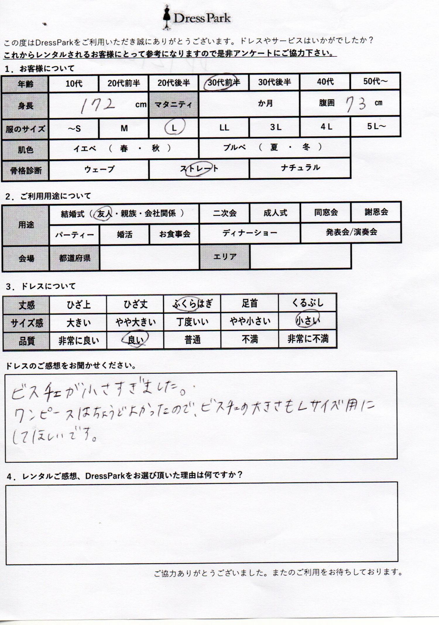 大阪府 K.S様172㎝ Lサイズ #30代#M/L#170㎝以上#結婚式(友人)#大阪府 ◆レンタルしたドレスはこちら ◆レンタルしたサイズは:L ◆レンタルした日付:2025/12/07 ドレスの着用感 ◆点数: (4点) ◆丈感:ふくらはぎ ◆サイズ感:小さい ◆品質:良い ◆骨格診断:ストレート ドレスの感想 ビスチェが小さすぎました。ワンピースはちょうど良かったので、ビスチェの大きさもLサイズ用にしてほしいです。 【スタッフより】 この度はご利用ありがとうございました。ビスチェのおサイズですが、Lサイズ用はLサイズです。Mサイズとは異なるサイズ感です。 CUSTOMER REVIEWS お客様の声 気になるカテゴリー別にご利用の感想をチェック! ◆AGE 年代で見る 10代 20代 30代 40代 50代~ ◆SIZE サイズで見る SS/S M/L 大きいサイズLL~ ◆HIGHT 身長で見る 140~149㎝ 150~154㎝ 155~159㎝ 160~164㎝ 165~169㎝ 170㎝以上 ◆マタニティ ~3か月 4~6か月 7~8か月 9~10か月 ◆肌色 イエベ ブルべ ◆骨格診断 ウェーブ ストレート ナチュラル ◆利用シーン 結婚式(友人) 結婚式(親族) 結婚式(会社関係) 二次会 成人式 謝恩会 パーティー その他 CUSTOMER REVIEWS都道府県別お客様の声 都道府県別にのお客様の声をチェック! 北海道 青森県 岩手県 宮城県 秋田県 山形県 福島県 茨城県 栃木県 群馬県 埼玉県 千葉県 東京都 神奈川県 新潟県 富山県 石川県 福井県 山梨県 長野県 岐阜県 静岡県 愛知県 三重県 滋賀県 京都府 大阪府 兵庫県 奈良県 和歌山県 鳥取県 島根県 岡山県 広島県 山口県 徳島県 香川県 愛媛県 高知県 福岡県 佐賀県 長崎県 熊本県 大分県 宮崎県 鹿児島県 沖縄県 CUSTOMER REVIEWSエリア別お客様の声 都道府県別にのお客様の声をチェック! 札幌 仙台 名古屋 軽井沢 金沢 神戸・芦屋 博多 那覇 梅田・新大阪 難波・心斎橋 鎌倉・湘南 横浜・みなとみらい 舞浜・浦安・幕張 大宮・浦和 青山・表参道 六本木・麻布 渋谷・恵比寿 新宿 池袋 銀座・丸の内 お台場・汐留 鹿児島市 郡山市 福島市 東予 甲府・石和 LINEでお問い合わせ このサイトではJavaScriptを使用しています