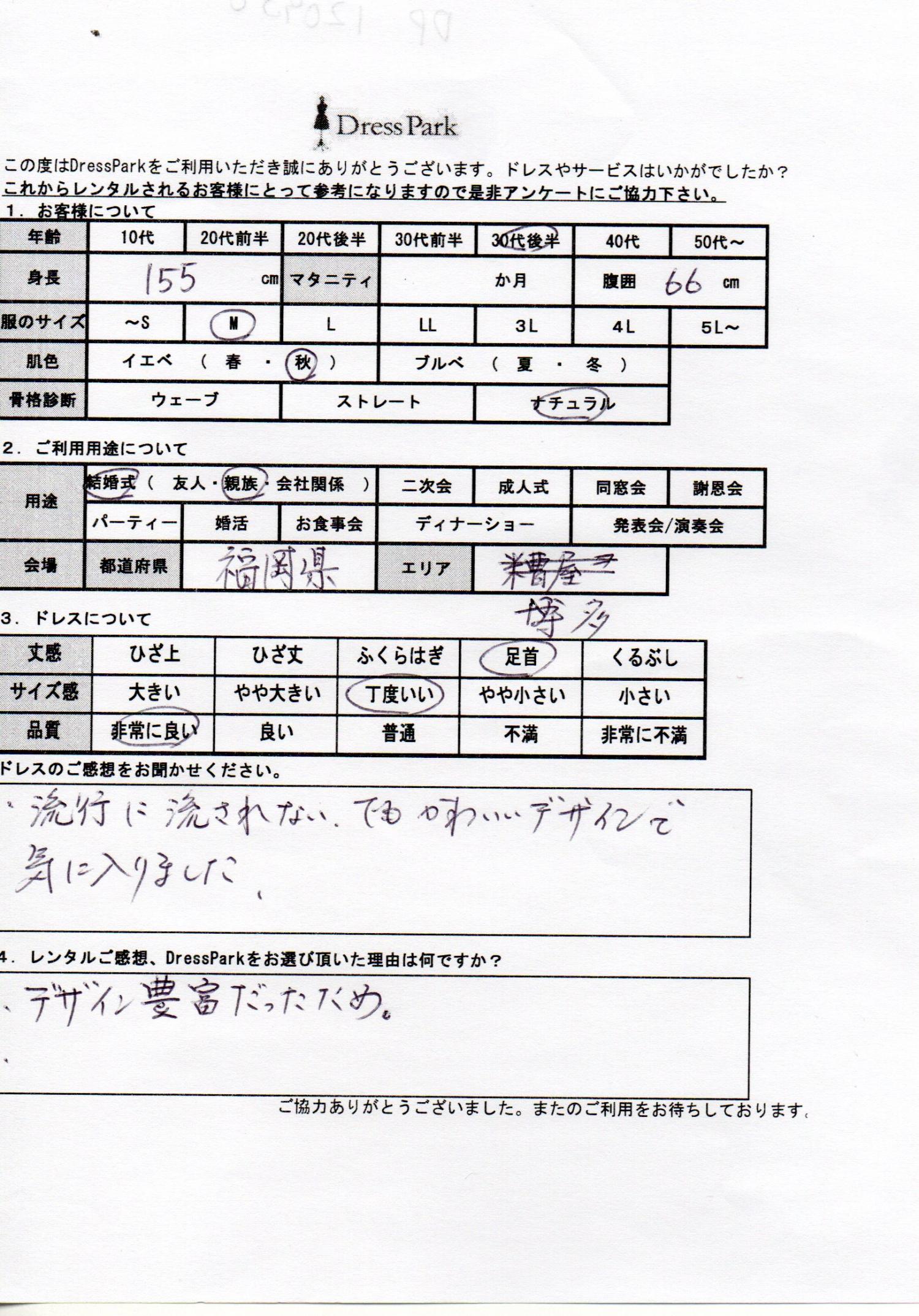 福岡県 M.O様155㎝ Mサイズ博多 #30代#M/L#155~159㎝#結婚式(親族)#福岡県#博多 ◆レンタルしたドレスはこちら ◆レンタルしたサイズは:M ◆レンタルした日付:2025/12/06 ドレスの着用感 ◆点数: (5点) ◆丈感:足首 ◆サイズ感:丁度いい ◆品質:非常に良い ◆肌色:イエベ ◆骨格診断:ナチュラル ドレスの感想 流行に流されない、でもかわいいデザインで気に入りました。 レンタルのご感想、DressParkをお選び頂いた理由 デザイン豊富だったため。 CUSTOMER REVIEWS お客様の声 気になるカテゴリー別にご利用の感想をチェック! ◆AGE 年代で見る 10代 20代 30代 40代 50代~ ◆SIZE サイズで見る SS/S M/L 大きいサイズLL~ ◆HIGHT 身長で見る 140~149㎝ 150~154㎝ 155~159㎝ 160~164㎝ 165~169㎝ 170㎝以上 ◆マタニティ ~3か月 4~6か月 7~8か月 9~10か月 ◆肌色 イエベ ブルべ ◆骨格診断 ウェーブ ストレート ナチュラル ◆利用シーン 結婚式(友人) 結婚式(親族) 結婚式(会社関係) 二次会 成人式 謝恩会 パーティー その他 CUSTOMER REVIEWS都道府県別お客様の声 都道府県別にのお客様の声をチェック! 北海道 青森県 岩手県 宮城県 秋田県 山形県 福島県 茨城県 栃木県 群馬県 埼玉県 千葉県 東京都 神奈川県 新潟県 富山県 石川県 福井県 山梨県 長野県 岐阜県 静岡県 愛知県 三重県 滋賀県 京都府 大阪府 兵庫県 奈良県 和歌山県 鳥取県 島根県 岡山県 広島県 山口県 徳島県 香川県 愛媛県 高知県 福岡県 佐賀県 長崎県 熊本県 大分県 宮崎県 鹿児島県 沖縄県 CUSTOMER REVIEWSエリア別お客様の声 都道府県別にのお客様の声をチェック! 札幌 仙台 名古屋 軽井沢 金沢 神戸・芦屋 博多 那覇 梅田・新大阪 難波・心斎橋 鎌倉・湘南 横浜・みなとみらい 舞浜・浦安・幕張 大宮・浦和 青山・表参道 六本木・麻布 渋谷・恵比寿 新宿 池袋 銀座・丸の内 お台場・汐留 鹿児島市 郡山市 福島市 東予 甲府・石和 LINEでお問い合わせ このサイトではJavaScriptを使用しています