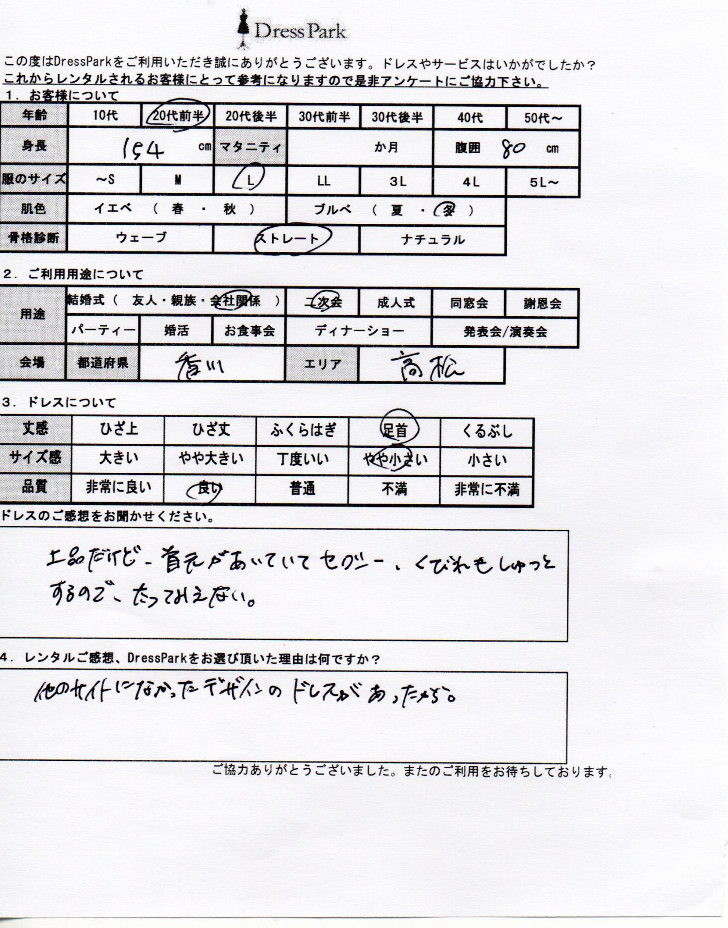 香川県 M.F様154㎝ Lサイズ #20代#M/L#150~154㎝#結婚式(会社関係)#香川県 ◆レンタルしたドレスはこちら ◆レンタルしたサイズは:L ◆レンタルした日付:2025/12/06 ドレスの着用感 ◆点数: (4点) ◆丈感:足首 ◆サイズ感:やや小さい ◆品質:良い ◆肌色:ブルべ ◆骨格診断:ストレート ドレスの感想 上品だけど、首元が空いていてセクシー、くびれもシュッとするので太って見えない。 レンタルのご感想、DressParkをお選び頂いた理由 他のサイトになかったデザインのドレスがあったから。 CUSTOMER REVIEWS お客様の声 気になるカテゴリー別にご利用の感想をチェック! ◆AGE 年代で見る 10代 20代 30代 40代 50代~ ◆SIZE サイズで見る SS/S M/L 大きいサイズLL~ ◆HIGHT 身長で見る 140~149㎝ 150~154㎝ 155~159㎝ 160~164㎝ 165~169㎝ 170㎝以上 ◆マタニティ ~3か月 4~6か月 7~8か月 9~10か月 ◆肌色 イエベ ブルべ ◆骨格診断 ウェーブ ストレート ナチュラル ◆利用シーン 結婚式(友人) 結婚式(親族) 結婚式(会社関係) 二次会 成人式 謝恩会 パーティー その他 CUSTOMER REVIEWS都道府県別お客様の声 都道府県別にのお客様の声をチェック! 北海道 青森県 岩手県 宮城県 秋田県 山形県 福島県 茨城県 栃木県 群馬県 埼玉県 千葉県 東京都 神奈川県 新潟県 富山県 石川県 福井県 山梨県 長野県 岐阜県 静岡県 愛知県 三重県 滋賀県 京都府 大阪府 兵庫県 奈良県 和歌山県 鳥取県 島根県 岡山県 広島県 山口県 徳島県 香川県 愛媛県 高知県 福岡県 佐賀県 長崎県 熊本県 大分県 宮崎県 鹿児島県 沖縄県 CUSTOMER REVIEWSエリア別お客様の声 都道府県別にのお客様の声をチェック! 札幌 仙台 名古屋 軽井沢 金沢 神戸・芦屋 博多 那覇 梅田・新大阪 難波・心斎橋 鎌倉・湘南 横浜・みなとみらい 舞浜・浦安・幕張 大宮・浦和 青山・表参道 六本木・麻布 渋谷・恵比寿 新宿 池袋 銀座・丸の内 お台場・汐留 鹿児島市 郡山市 福島市 東予 甲府・石和 LINEでお問い合わせ このサイトではJavaScriptを使用しています
