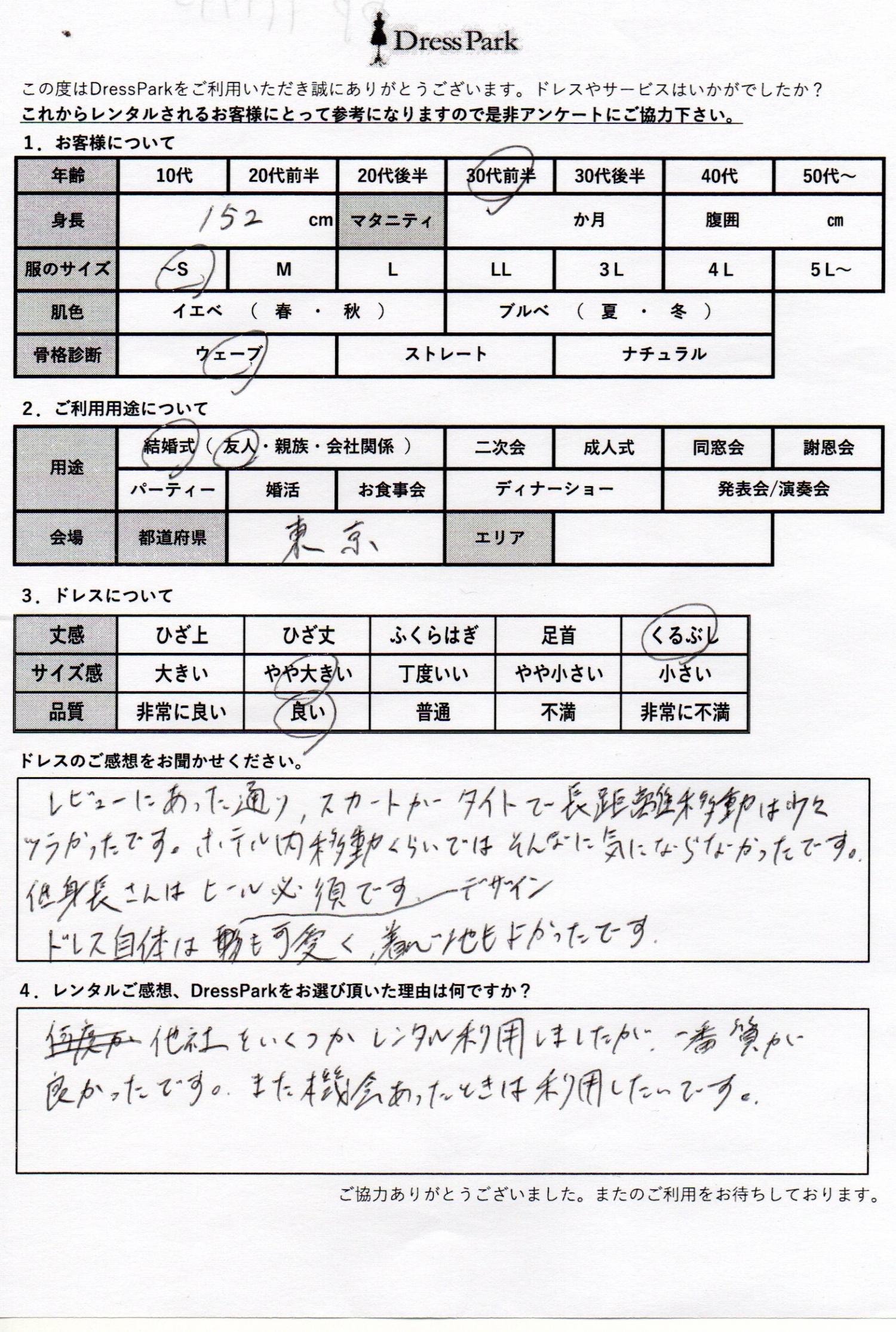 東京都 M.K様152㎝ ~Sサイズ #30代#SS/S#150~154㎝#結婚式(友人)#東京都 ◆レンタルしたドレスはこちら ◆レンタルしたサイズは:M ◆レンタルした日付:2025/12/07 ドレスの着用感 ◆点数: (4点) ◆丈感:くるぶし ◆サイズ感:やや大きい ◆品質:良い ◆骨格診断:ウェーブ ドレスの感想 レビューにあった通り、スカートがタイトで、長距離移動は少々辛かったです。ホテル内移動位ではそんなに気にならなかったです。低身長さんはヒール必須です。ドレス自体はデザインも可愛く着心地も良かったです。 レンタルのご感想、DressParkをお選び頂いた理由 他社をいくつかレンタル利用しましたが1番質が良かったです。また機会があった時は利用したいです。 CUSTOMER REVIEWS お客様の声 気になるカテゴリー別にご利用の感想をチェック! ◆AGE 年代で見る 10代 20代 30代 40代 50代~ ◆SIZE サイズで見る SS/S M/L 大きいサイズLL~ ◆HIGHT 身長で見る 140~149㎝ 150~154㎝ 155~159㎝ 160~164㎝ 165~169㎝ 170㎝以上 ◆マタニティ ~3か月 4~6か月 7~8か月 9~10か月 ◆肌色 イエベ ブルべ ◆骨格診断 ウェーブ ストレート ナチュラル ◆利用シーン 結婚式(友人) 結婚式(親族) 結婚式(会社関係) 二次会 成人式 謝恩会 パーティー その他 CUSTOMER REVIEWS都道府県別お客様の声 都道府県別にのお客様の声をチェック! 北海道 青森県 岩手県 宮城県 秋田県 山形県 福島県 茨城県 栃木県 群馬県 埼玉県 千葉県 東京都 神奈川県 新潟県 富山県 石川県 福井県 山梨県 長野県 岐阜県 静岡県 愛知県 三重県 滋賀県 京都府 大阪府 兵庫県 奈良県 和歌山県 鳥取県 島根県 岡山県 広島県 山口県 徳島県 香川県 愛媛県 高知県 福岡県 佐賀県 長崎県 熊本県 大分県 宮崎県 鹿児島県 沖縄県 CUSTOMER REVIEWSエリア別お客様の声 都道府県別にのお客様の声をチェック! 札幌 仙台 名古屋 軽井沢 金沢 神戸・芦屋 博多 那覇 梅田・新大阪 難波・心斎橋 鎌倉・湘南 横浜・みなとみらい 舞浜・浦安・幕張 大宮・浦和 青山・表参道 六本木・麻布 渋谷・恵比寿 新宿 池袋 銀座・丸の内 お台場・汐留 鹿児島市 郡山市 福島市 東予 甲府・石和 LINEでお問い合わせ このサイトではJavaScriptを使用しています