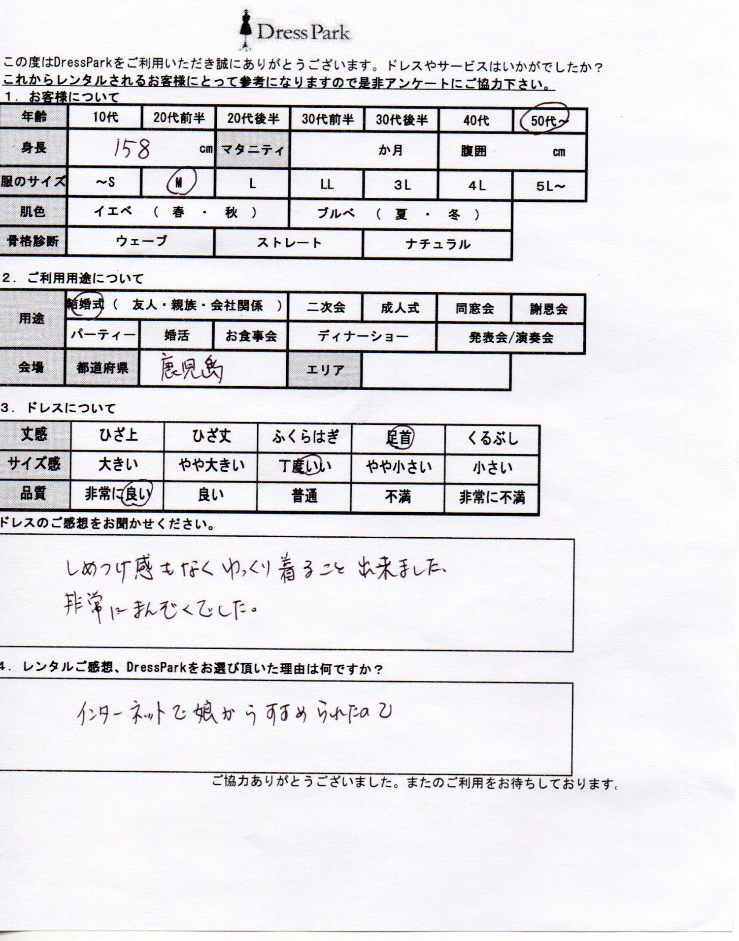 鹿児島県 M.M様158㎝ Mサイズ #50代~#M/L#155~159㎝#結婚式(親族)#鹿児島県 ◆レンタルしたドレスはこちら ◆レンタルしたサイズは:L ◆レンタルした日付:2025/12/06 ドレスの着用感 ◆点数: (5点) ◆丈感:足首 ◆サイズ感:丁度いい ◆品質:非常に良い ドレスの感想 締め付け感もなくゆったり着ることができました。非常に満足でした。 レンタルのご感想、DressParkをお選び頂いた理由 インターネットで娘から勧められたので。 CUSTOMER REVIEWS お客様の声 気になるカテゴリー別にご利用の感想をチェック! ◆AGE 年代で見る 10代 20代 30代 40代 50代~ ◆SIZE サイズで見る SS/S M/L 大きいサイズLL~ ◆HIGHT 身長で見る 140~149㎝ 150~154㎝ 155~159㎝ 160~164㎝ 165~169㎝ 170㎝以上 ◆マタニティ ~3か月 4~6か月 7~8か月 9~10か月 ◆肌色 イエベ ブルべ ◆骨格診断 ウェーブ ストレート ナチュラル ◆利用シーン 結婚式(友人) 結婚式(親族) 結婚式(会社関係) 二次会 成人式 謝恩会 パーティー その他 CUSTOMER REVIEWS都道府県別お客様の声 都道府県別にのお客様の声をチェック! 北海道 青森県 岩手県 宮城県 秋田県 山形県 福島県 茨城県 栃木県 群馬県 埼玉県 千葉県 東京都 神奈川県 新潟県 富山県 石川県 福井県 山梨県 長野県 岐阜県 静岡県 愛知県 三重県 滋賀県 京都府 大阪府 兵庫県 奈良県 和歌山県 鳥取県 島根県 岡山県 広島県 山口県 徳島県 香川県 愛媛県 高知県 福岡県 佐賀県 長崎県 熊本県 大分県 宮崎県 鹿児島県 沖縄県 CUSTOMER REVIEWSエリア別お客様の声 都道府県別にのお客様の声をチェック! 札幌 仙台 名古屋 軽井沢 金沢 神戸・芦屋 博多 那覇 梅田・新大阪 難波・心斎橋 鎌倉・湘南 横浜・みなとみらい 舞浜・浦安・幕張 大宮・浦和 青山・表参道 六本木・麻布 渋谷・恵比寿 新宿 池袋 銀座・丸の内 お台場・汐留 鹿児島市 郡山市 福島市 東予 甲府・石和 LINEでお問い合わせ このサイトではJavaScriptを使用しています