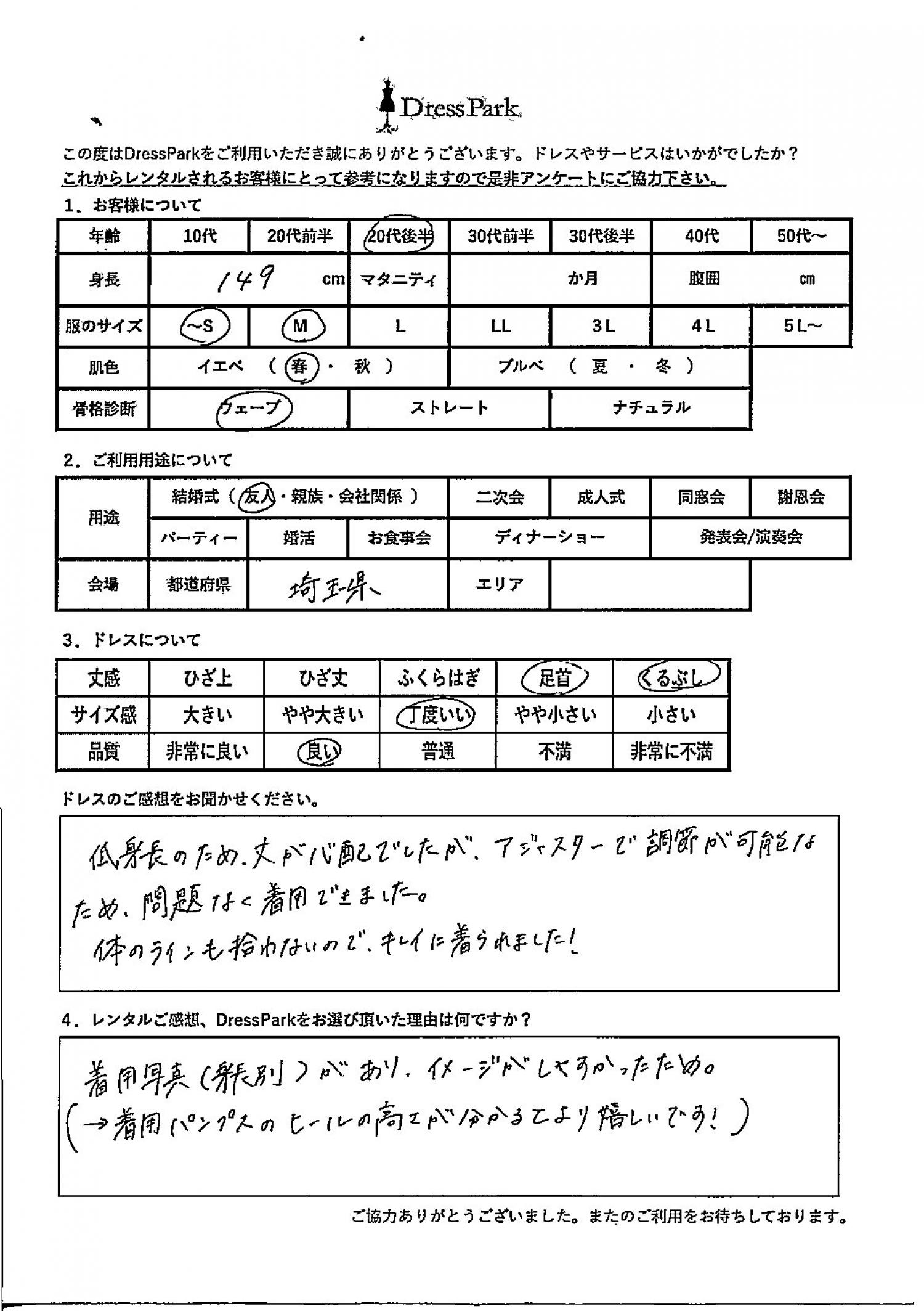 埼玉県 Y.G様149㎝ ~Sサイズ #20代#SS/S#140~149㎝#結婚式(友人)#埼玉県 ◆レンタルしたドレスはこちら ◆レンタルしたサイズは:M ◆レンタルした日付:2025/12/6 ドレスの着用感 ◆点数: (4点) ◆丈感:くるぶし ◆サイズ感:丁度いい ◆品質:良い ◆肌色:イエベ ◆骨格診断:ウェーブ ドレスの感想 低身長のため丈が心配でしたが、アジャスターで調節が可能なため、問題なく着用できました。 体のラインも拾わないので、キレイに着られました! レンタルのご感想、DressParkをお選び頂いた理由 着用写真(身長別)があり、イメージがしやすかったため。 (→着用パンプスのヒールの高さが分かるとより嬉しいです!) CUSTOMER REVIEWS お客様の声 気になるカテゴリー別にご利用の感想をチェック! ◆AGE 年代で見る 10代 20代 30代 40代 50代~ ◆SIZE サイズで見る SS/S M/L 大きいサイズLL~ ◆HIGHT 身長で見る 140~149㎝ 150~154㎝ 155~159㎝ 160~164㎝ 165~169㎝ 170㎝以上 ◆マタニティ ~3か月 4~6か月 7~8か月 9~10か月 ◆肌色 イエベ ブルべ ◆骨格診断 ウェーブ ストレート ナチュラル ◆利用シーン 結婚式(友人) 結婚式(親族) 結婚式(会社関係) 二次会 成人式 謝恩会 パーティー その他 CUSTOMER REVIEWS都道府県別お客様の声 都道府県別にのお客様の声をチェック! 北海道 青森県 岩手県 宮城県 秋田県 山形県 福島県 茨城県 栃木県 群馬県 埼玉県 千葉県 東京都 神奈川県 新潟県 富山県 石川県 福井県 山梨県 長野県 岐阜県 静岡県 愛知県 三重県 滋賀県 京都府 大阪府 兵庫県 奈良県 和歌山県 鳥取県 島根県 岡山県 広島県 山口県 徳島県 香川県 愛媛県 高知県 福岡県 佐賀県 長崎県 熊本県 大分県 宮崎県 鹿児島県 沖縄県 CUSTOMER REVIEWSエリア別お客様の声 都道府県別にのお客様の声をチェック! 札幌 仙台 名古屋 軽井沢 金沢 神戸・芦屋 博多 那覇 梅田・新大阪 難波・心斎橋 鎌倉・湘南 横浜・みなとみらい 舞浜・浦安・幕張 大宮・浦和 青山・表参道 六本木・麻布 渋谷・恵比寿 新宿 池袋 銀座・丸の内 お台場・汐留 鹿児島市 郡山市 福島市 東予 甲府・石和 LINEでお問い合わせ このサイトではJavaScriptを使用しています