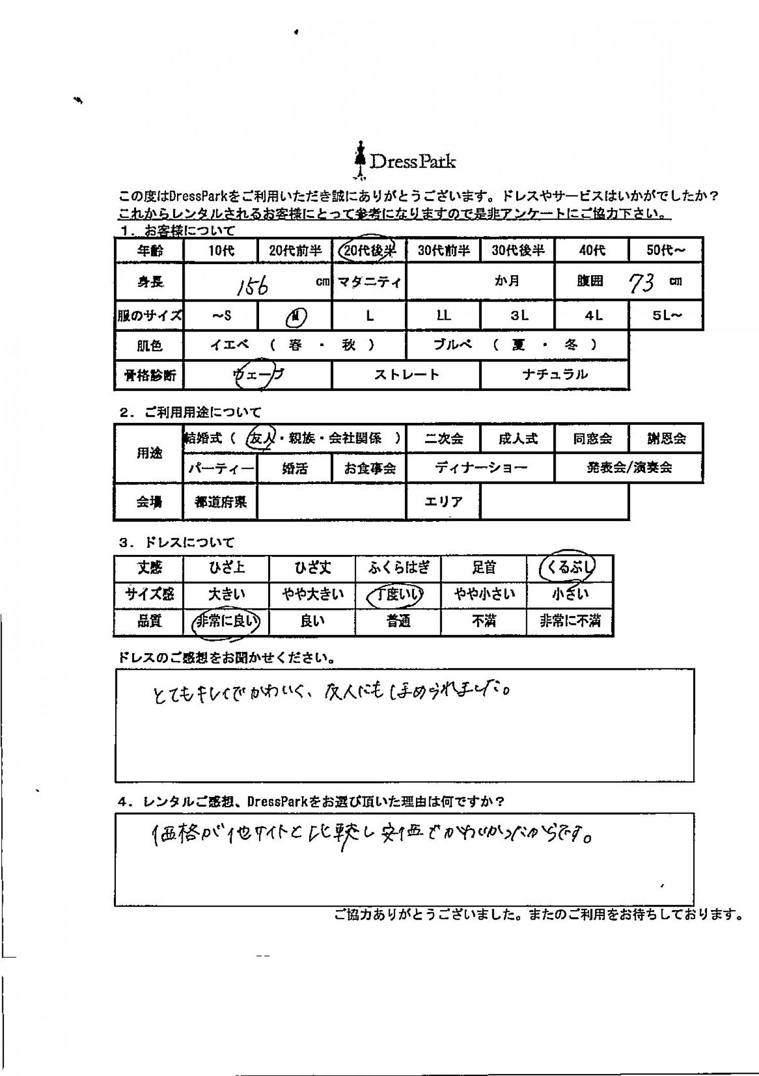 長野県 N.K様156㎝ Mサイズ #20代#M/L#155~159㎝#結婚式(友人)#長野県 ◆レンタルしたドレスはこちら ◆レンタルしたサイズは:M ◆レンタルした日付:2025/12/6 ドレスの着用感 ◆点数: (5点) ◆丈感:くるぶし ◆サイズ感:丁度いい ◆品質:非常に良い ◆骨格診断:ウェーブ ドレスの感想 とてもキレイでかわいく、友人にもほめられました。 レンタルのご感想、DressParkをお選び頂いた理由 価格が他サイトと比較し安価でかわいかったからです。 CUSTOMER REVIEWS お客様の声 気になるカテゴリー別にご利用の感想をチェック! ◆AGE 年代で見る 10代 20代 30代 40代 50代~ ◆SIZE サイズで見る SS/S M/L 大きいサイズLL~ ◆HIGHT 身長で見る 140~149㎝ 150~154㎝ 155~159㎝ 160~164㎝ 165~169㎝ 170㎝以上 ◆マタニティ ~3か月 4~6か月 7~8か月 9~10か月 ◆肌色 イエベ ブルべ ◆骨格診断 ウェーブ ストレート ナチュラル ◆利用シーン 結婚式(友人) 結婚式(親族) 結婚式(会社関係) 二次会 成人式 謝恩会 パーティー その他 CUSTOMER REVIEWS都道府県別お客様の声 都道府県別にのお客様の声をチェック! 北海道 青森県 岩手県 宮城県 秋田県 山形県 福島県 茨城県 栃木県 群馬県 埼玉県 千葉県 東京都 神奈川県 新潟県 富山県 石川県 福井県 山梨県 長野県 岐阜県 静岡県 愛知県 三重県 滋賀県 京都府 大阪府 兵庫県 奈良県 和歌山県 鳥取県 島根県 岡山県 広島県 山口県 徳島県 香川県 愛媛県 高知県 福岡県 佐賀県 長崎県 熊本県 大分県 宮崎県 鹿児島県 沖縄県 CUSTOMER REVIEWSエリア別お客様の声 都道府県別にのお客様の声をチェック! 札幌 仙台 名古屋 軽井沢 金沢 神戸・芦屋 博多 那覇 梅田・新大阪 難波・心斎橋 鎌倉・湘南 横浜・みなとみらい 舞浜・浦安・幕張 大宮・浦和 青山・表参道 六本木・麻布 渋谷・恵比寿 新宿 池袋 銀座・丸の内 お台場・汐留 鹿児島市 郡山市 福島市 東予 甲府・石和 LINEでお問い合わせ このサイトではJavaScriptを使用しています