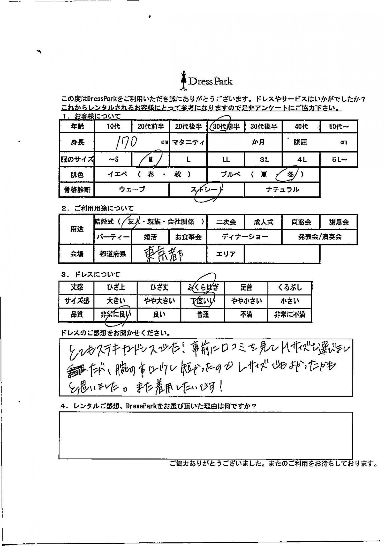 東京都 K.K様170㎝ Mサイズ #30代#M/L#170㎝以上#結婚式(友人)#東京都 ◆レンタルしたドレスはこちら ◆レンタルしたサイズは:L ◆レンタルした日付:2025/12/6 ドレスの着用感 ◆点数: (5点) ◆丈感:ふくらはぎ ◆サイズ感:丁度いい ◆品質:非常に良い ◆肌色:ブルべ ◆骨格診断:ストレート ドレスの感想 とてもステキなドレスでした!事前に口コミサイトを見てMサイズを選びましたが、腕の方は少し短かったのでLサイズでもよかったかもと思いました。また着用したいです! CUSTOMER REVIEWS お客様の声 気になるカテゴリー別にご利用の感想をチェック! ◆AGE 年代で見る 10代 20代 30代 40代 50代~ ◆SIZE サイズで見る SS/S M/L 大きいサイズLL~ ◆HIGHT 身長で見る 140~149㎝ 150~154㎝ 155~159㎝ 160~164㎝ 165~169㎝ 170㎝以上 ◆マタニティ ~3か月 4~6か月 7~8か月 9~10か月 ◆肌色 イエベ ブルべ ◆骨格診断 ウェーブ ストレート ナチュラル ◆利用シーン 結婚式(友人) 結婚式(親族) 結婚式(会社関係) 二次会 成人式 謝恩会 パーティー その他 CUSTOMER REVIEWS都道府県別お客様の声 都道府県別にのお客様の声をチェック! 北海道 青森県 岩手県 宮城県 秋田県 山形県 福島県 茨城県 栃木県 群馬県 埼玉県 千葉県 東京都 神奈川県 新潟県 富山県 石川県 福井県 山梨県 長野県 岐阜県 静岡県 愛知県 三重県 滋賀県 京都府 大阪府 兵庫県 奈良県 和歌山県 鳥取県 島根県 岡山県 広島県 山口県 徳島県 香川県 愛媛県 高知県 福岡県 佐賀県 長崎県 熊本県 大分県 宮崎県 鹿児島県 沖縄県 CUSTOMER REVIEWSエリア別お客様の声 都道府県別にのお客様の声をチェック! 札幌 仙台 名古屋 軽井沢 金沢 神戸・芦屋 博多 那覇 梅田・新大阪 難波・心斎橋 鎌倉・湘南 横浜・みなとみらい 舞浜・浦安・幕張 大宮・浦和 青山・表参道 六本木・麻布 渋谷・恵比寿 新宿 池袋 銀座・丸の内 お台場・汐留 鹿児島市 郡山市 福島市 東予 甲府・石和 LINEでお問い合わせ このサイトではJavaScriptを使用しています