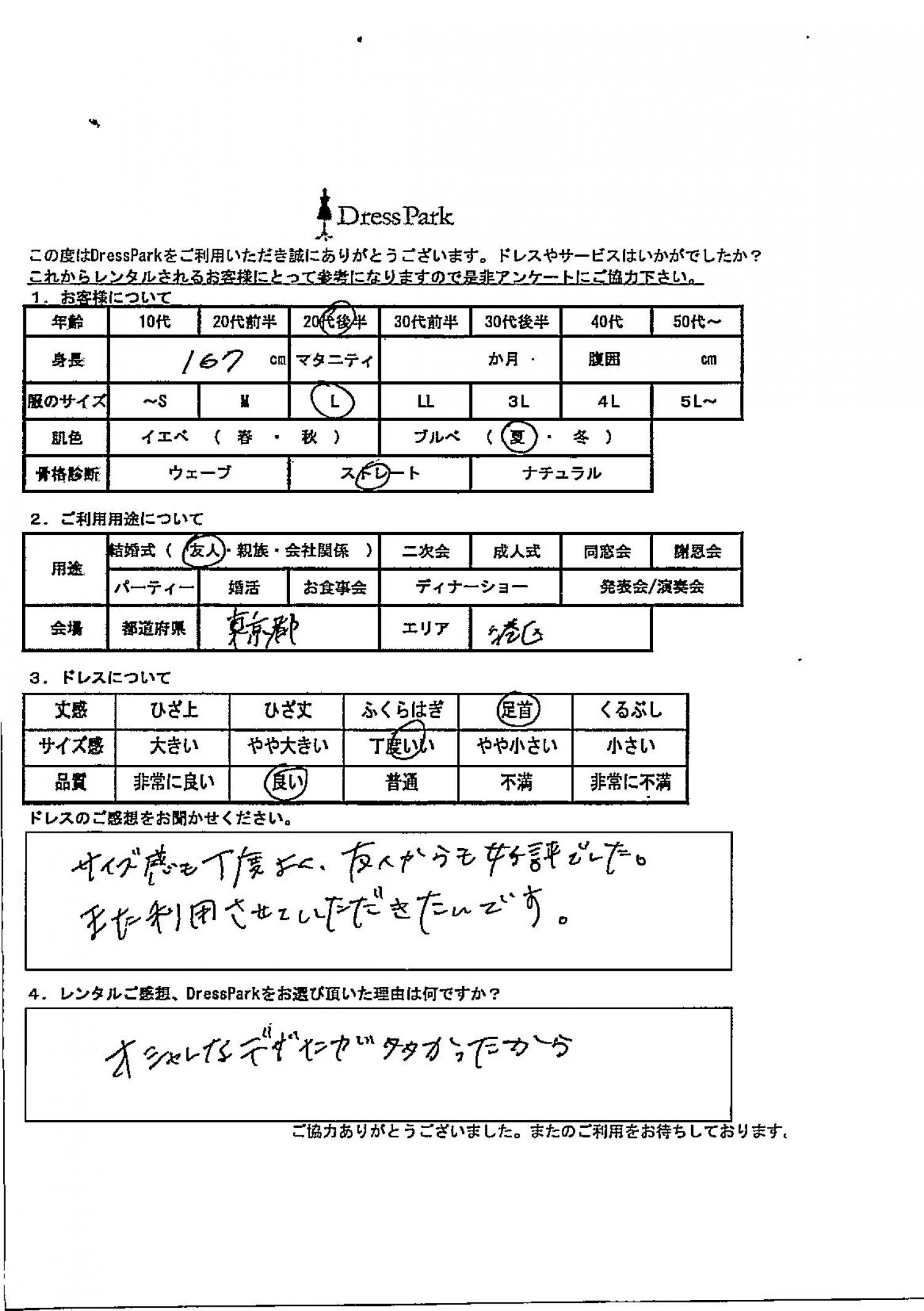 東京都 R.S様167㎝ Lサイズ #20代#M/L#165~169㎝#結婚式(友人)#東京都 ◆レンタルしたドレスはこちら ◆レンタルしたサイズは:L ◆レンタルした日付:2025/12/6 ドレスの着用感 ◆点数: (4点) ◆丈感:足首 ◆サイズ感:丁度いい ◆品質:良い ◆肌色:ブルべ ◆骨格診断:ストレート ドレスの感想 サイズ感も丁度よく、友人から好評でした。 また利用させていただきたいです。 レンタルのご感想、DressParkをお選び頂いた理由 オシャレなデザインが多かったから CUSTOMER REVIEWS お客様の声 気になるカテゴリー別にご利用の感想をチェック! ◆AGE 年代で見る 10代 20代 30代 40代 50代~ ◆SIZE サイズで見る SS/S M/L 大きいサイズLL~ ◆HIGHT 身長で見る 140~149㎝ 150~154㎝ 155~159㎝ 160~164㎝ 165~169㎝ 170㎝以上 ◆マタニティ ~3か月 4~6か月 7~8か月 9~10か月 ◆肌色 イエベ ブルべ ◆骨格診断 ウェーブ ストレート ナチュラル ◆利用シーン 結婚式(友人) 結婚式(親族) 結婚式(会社関係) 二次会 成人式 謝恩会 パーティー その他 CUSTOMER REVIEWS都道府県別お客様の声 都道府県別にのお客様の声をチェック! 北海道 青森県 岩手県 宮城県 秋田県 山形県 福島県 茨城県 栃木県 群馬県 埼玉県 千葉県 東京都 神奈川県 新潟県 富山県 石川県 福井県 山梨県 長野県 岐阜県 静岡県 愛知県 三重県 滋賀県 京都府 大阪府 兵庫県 奈良県 和歌山県 鳥取県 島根県 岡山県 広島県 山口県 徳島県 香川県 愛媛県 高知県 福岡県 佐賀県 長崎県 熊本県 大分県 宮崎県 鹿児島県 沖縄県 CUSTOMER REVIEWSエリア別お客様の声 都道府県別にのお客様の声をチェック! 札幌 仙台 名古屋 軽井沢 金沢 神戸・芦屋 博多 那覇 梅田・新大阪 難波・心斎橋 鎌倉・湘南 横浜・みなとみらい 舞浜・浦安・幕張 大宮・浦和 青山・表参道 六本木・麻布 渋谷・恵比寿 新宿 池袋 銀座・丸の内 お台場・汐留 鹿児島市 郡山市 福島市 東予 甲府・石和 LINEでお問い合わせ このサイトではJavaScriptを使用しています