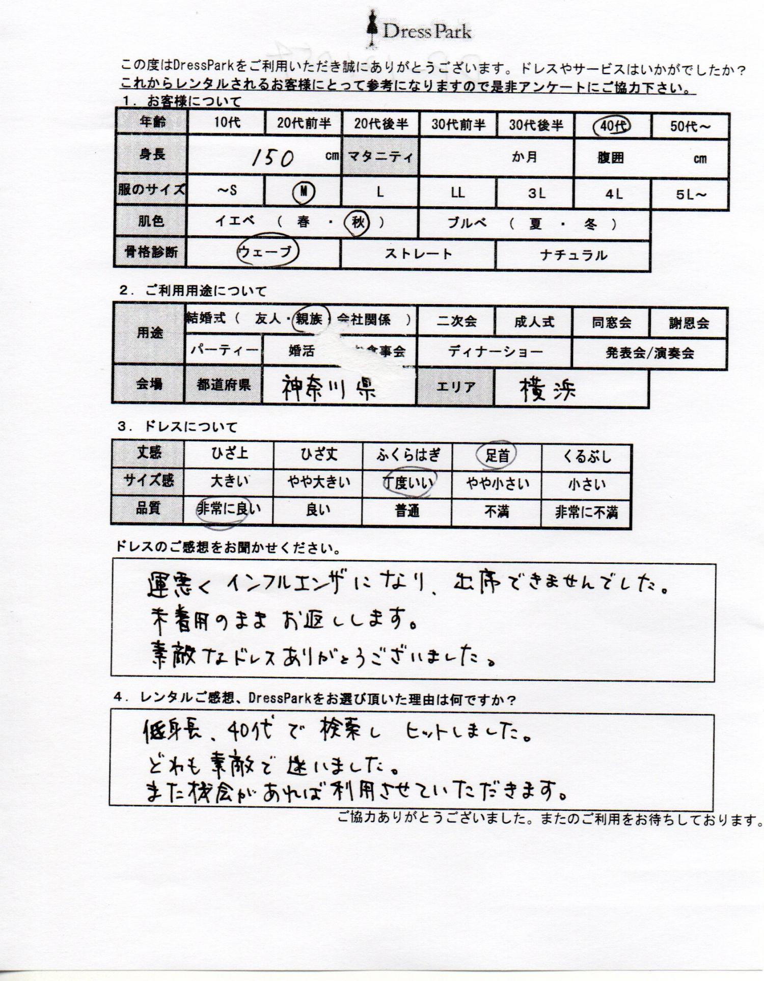 運悪くインフルエンザになり、出席できませんでした。未着用のままお返しします。素敵なドレスありがとうございました。レンタルのご感想、