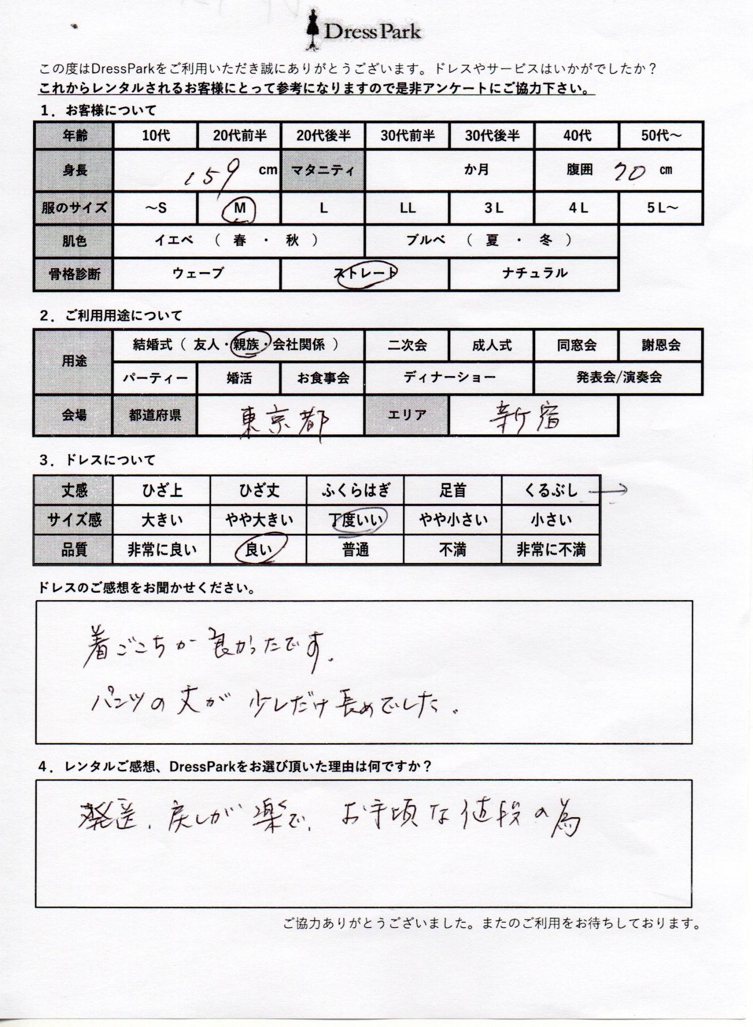 東京都 S.S様159㎝ Mサイズ新宿 #40代#M/L#155~159㎝#結婚式(親族)#東京都#新宿 ◆レンタルしたドレスはこちら ◆レンタルしたサイズは:M ◆レンタルした日付:2025/12/07 ドレスの着用感 ◆点数: (4点) ◆丈感:くるぶし ◆サイズ感:丁度いい ◆品質:良い ◆骨格診断:ストレート ドレスの感想 着心地が良かったです。パンツの丈が少しだけ長めでした。 レンタルのご感想、DressParkをお選び頂いた理由 発送、戻しが楽でお手頃な値段のため。 CUSTOMER REVIEWS お客様の声 気になるカテゴリー別にご利用の感想をチェック! ◆AGE 年代で見る 10代 20代 30代 40代 50代~ ◆SIZE サイズで見る SS/S M/L 大きいサイズLL~ ◆HIGHT 身長で見る 140~149㎝ 150~154㎝ 155~159㎝ 160~164㎝ 165~169㎝ 170㎝以上 ◆マタニティ ~3か月 4~6か月 7~8か月 9~10か月 ◆肌色 イエベ ブルべ ◆骨格診断 ウェーブ ストレート ナチュラル ◆利用シーン 結婚式(友人) 結婚式(親族) 結婚式(会社関係) 二次会 成人式 謝恩会 パーティー その他 CUSTOMER REVIEWS都道府県別お客様の声 都道府県別にのお客様の声をチェック! 北海道 青森県 岩手県 宮城県 秋田県 山形県 福島県 茨城県 栃木県 群馬県 埼玉県 千葉県 東京都 神奈川県 新潟県 富山県 石川県 福井県 山梨県 長野県 岐阜県 静岡県 愛知県 三重県 滋賀県 京都府 大阪府 兵庫県 奈良県 和歌山県 鳥取県 島根県 岡山県 広島県 山口県 徳島県 香川県 愛媛県 高知県 福岡県 佐賀県 長崎県 熊本県 大分県 宮崎県 鹿児島県 沖縄県 CUSTOMER REVIEWSエリア別お客様の声 都道府県別にのお客様の声をチェック! 札幌 仙台 名古屋 軽井沢 金沢 神戸・芦屋 博多 那覇 梅田・新大阪 難波・心斎橋 鎌倉・湘南 横浜・みなとみらい 舞浜・浦安・幕張 大宮・浦和 青山・表参道 六本木・麻布 渋谷・恵比寿 新宿 池袋 銀座・丸の内 お台場・汐留 鹿児島市 郡山市 福島市 東予 甲府・石和 LINEでお問い合わせ このサイトではJavaScriptを使用しています