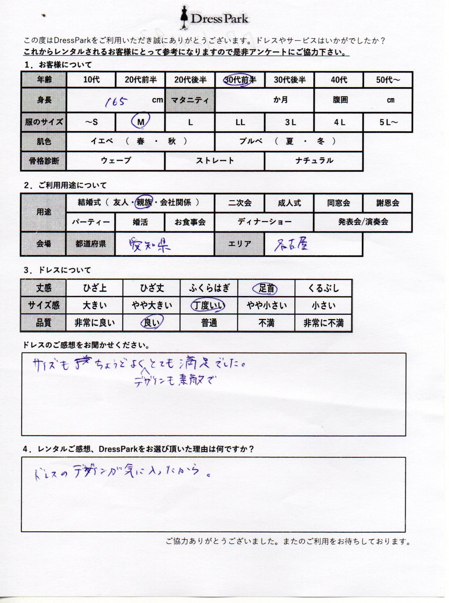 愛知県 M.Y様165㎝ Mサイズ名古屋 #30代#M/L#165~169㎝#結婚式(親族)#愛知県#名古屋 ◆レンタルしたドレスはこちら ◆レンタルしたサイズは:M ◆レンタルした日付:2025/12/07 ドレスの着用感 ◆点数: (4点) ◆丈感:足首 ◆サイズ感:丁度いい ◆品質:良い ドレスの感想 サイズもちょうど良く、デザインも素敵でとても満足でした。 レンタルのご感想、DressParkをお選び頂いた理由 ドレスのデザインが気に入ったから。 CUSTOMER REVIEWS お客様の声 気になるカテゴリー別にご利用の感想をチェック! ◆AGE 年代で見る 10代 20代 30代 40代 50代~ ◆SIZE サイズで見る SS/S M/L 大きいサイズLL~ ◆HIGHT 身長で見る 140~149㎝ 150~154㎝ 155~159㎝ 160~164㎝ 165~169㎝ 170㎝以上 ◆マタニティ ~3か月 4~6か月 7~8か月 9~10か月 ◆肌色 イエベ ブルべ ◆骨格診断 ウェーブ ストレート ナチュラル ◆利用シーン 結婚式(友人) 結婚式(親族) 結婚式(会社関係) 二次会 成人式 謝恩会 パーティー その他 CUSTOMER REVIEWS都道府県別お客様の声 都道府県別にのお客様の声をチェック! 北海道 青森県 岩手県 宮城県 秋田県 山形県 福島県 茨城県 栃木県 群馬県 埼玉県 千葉県 東京都 神奈川県 新潟県 富山県 石川県 福井県 山梨県 長野県 岐阜県 静岡県 愛知県 三重県 滋賀県 京都府 大阪府 兵庫県 奈良県 和歌山県 鳥取県 島根県 岡山県 広島県 山口県 徳島県 香川県 愛媛県 高知県 福岡県 佐賀県 長崎県 熊本県 大分県 宮崎県 鹿児島県 沖縄県 CUSTOMER REVIEWSエリア別お客様の声 都道府県別にのお客様の声をチェック! 札幌 仙台 名古屋 軽井沢 金沢 神戸・芦屋 博多 那覇 梅田・新大阪 難波・心斎橋 鎌倉・湘南 横浜・みなとみらい 舞浜・浦安・幕張 大宮・浦和 青山・表参道 六本木・麻布 渋谷・恵比寿 新宿 池袋 銀座・丸の内 お台場・汐留 鹿児島市 郡山市 福島市 東予 甲府・石和 LINEでお問い合わせ このサイトではJavaScriptを使用しています