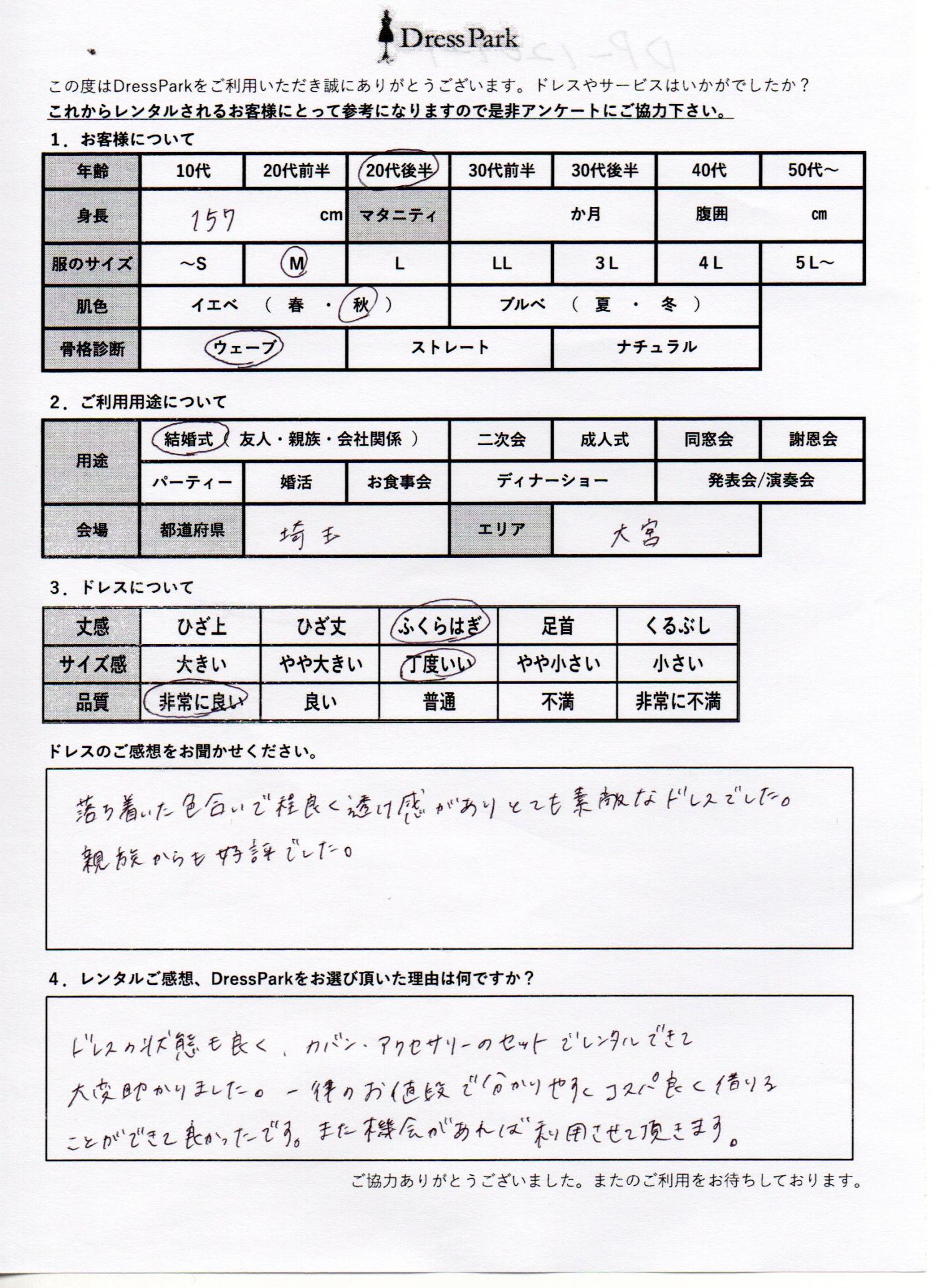 ドレスの状態も良く、カバン・アクセサリーのセットでレンタルできて大変助かりました。一律のお値段でわかりやすく、コスパ良く借りることができてよかったです。また機会があれば利用させていただきます。