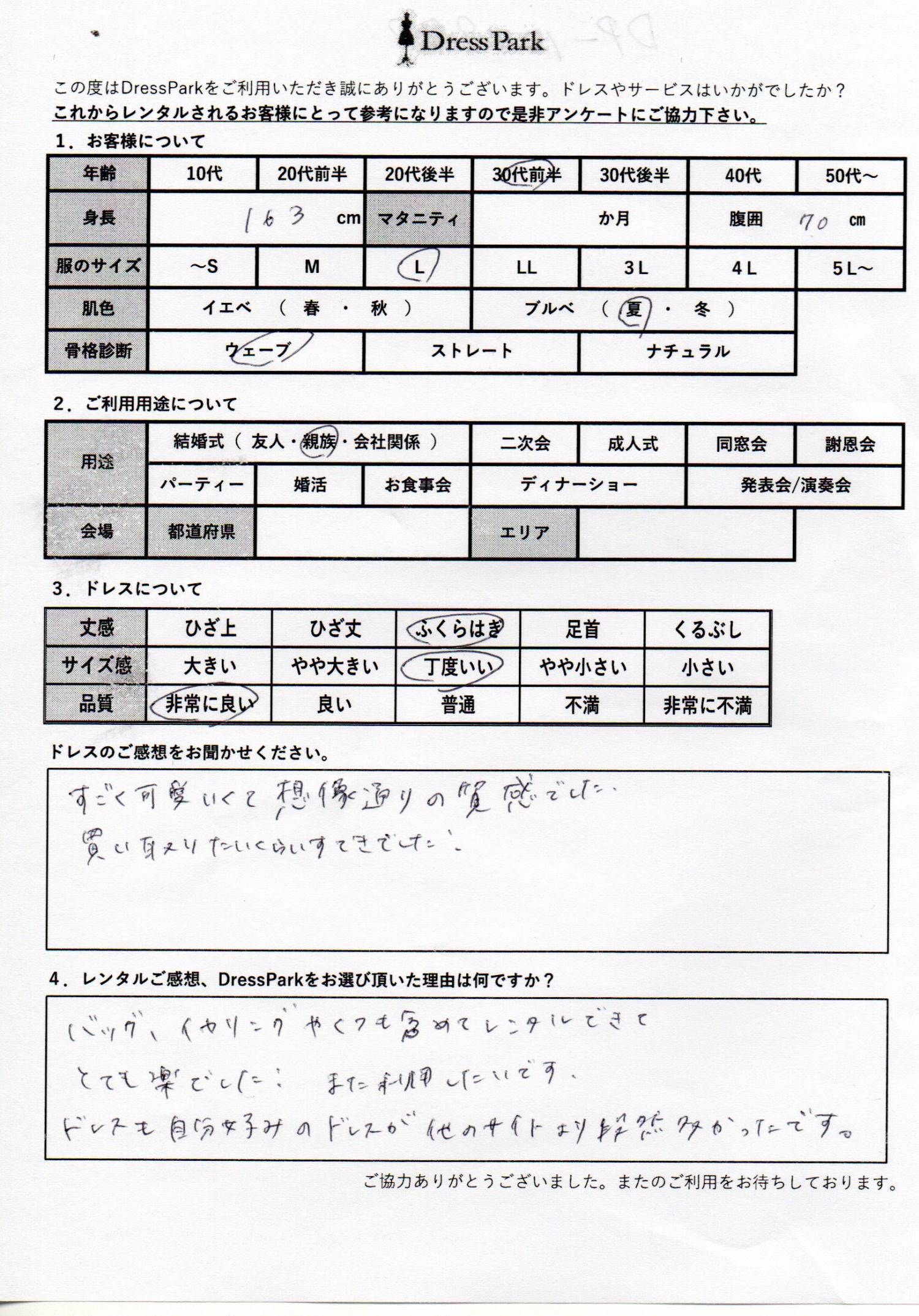 千葉県 M.F様163㎝ Lサイズ #30代#M/L#160~164㎝#結婚式(親族)#千葉県 ◆レンタルしたドレスはこちら ◆レンタルしたサイズは:L ◆レンタルした日付:2025/12/07 ドレスの着用感 ◆点数: (5点) ◆丈感:ふくらはぎ ◆サイズ感:丁度いい ◆品質:非常に良い ◆肌色:ブルべ ◆骨格診断:ウェーブ ドレスの感想 すごく可愛くて、想像通りの質感でした。買取たい位素敵でした! レンタルのご感想、DressParkをお選び頂いた理由 バッグ、イヤリングや靴も含めてレンタルできて、とても楽でした!また利用したいです。ドレスも自分好みのドレスが他のサイトより断然多かったです。 CUSTOMER REVIEWS お客様の声 気になるカテゴリー別にご利用の感想をチェック! ◆AGE 年代で見る 10代 20代 30代 40代 50代~ ◆SIZE サイズで見る SS/S M/L 大きいサイズLL~ ◆HIGHT 身長で見る 140~149㎝ 150~154㎝ 155~159㎝ 160~164㎝ 165~169㎝ 170㎝以上 ◆マタニティ ~3か月 4~6か月 7~8か月 9~10か月 ◆肌色 イエベ ブルべ ◆骨格診断 ウェーブ ストレート ナチュラル ◆利用シーン 結婚式(友人) 結婚式(親族) 結婚式(会社関係) 二次会 成人式 謝恩会 パーティー その他 CUSTOMER REVIEWS都道府県別お客様の声 都道府県別にのお客様の声をチェック! 北海道 青森県 岩手県 宮城県 秋田県 山形県 福島県 茨城県 栃木県 群馬県 埼玉県 千葉県 東京都 神奈川県 新潟県 富山県 石川県 福井県 山梨県 長野県 岐阜県 静岡県 愛知県 三重県 滋賀県 京都府 大阪府 兵庫県 奈良県 和歌山県 鳥取県 島根県 岡山県 広島県 山口県 徳島県 香川県 愛媛県 高知県 福岡県 佐賀県 長崎県 熊本県 大分県 宮崎県 鹿児島県 沖縄県 CUSTOMER REVIEWSエリア別お客様の声 都道府県別にのお客様の声をチェック! 札幌 仙台 名古屋 軽井沢 金沢 神戸・芦屋 博多 那覇 梅田・新大阪 難波・心斎橋 鎌倉・湘南 横浜・みなとみらい 舞浜・浦安・幕張 大宮・浦和 青山・表参道 六本木・麻布 渋谷・恵比寿 新宿 池袋 銀座・丸の内 お台場・汐留 鹿児島市 郡山市 福島市 東予 甲府・石和 LINEでお問い合わせ このサイトではJavaScriptを使用しています