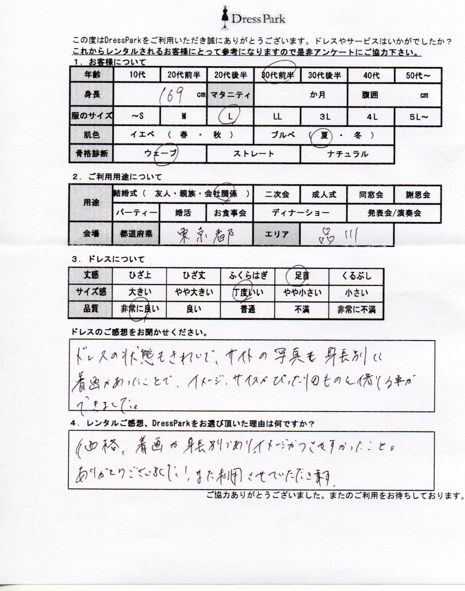 東京都 A.T様169㎝ Lサイズ #30代#M/L#165~169㎝#結婚式(会社関係)#東京都 ◆レンタルしたドレスはこちら ◆レンタルしたサイズは:L ◆レンタルした日付:2025/12/06 ドレスの着用感 ◆点数: (5点) ◆丈感:足首 ◆サイズ感:丁度いい ◆品質:非常に良い ◆肌色:ブルべ ◆骨格診断:ウェーブ ドレスの感想 ドレスの状態も綺麗で、サイトの写真も身長別の着画があったことで、イメージ、サイズぴったりのものを借りることができました。 レンタルのご感想、DressParkをお選び頂いた理由 価格、着画が身長別であり、イメージが付きやすかったこと。ありがとうございました!また利用させていただきます。 CUSTOMER REVIEWS お客様の声 気になるカテゴリー別にご利用の感想をチェック! ◆AGE 年代で見る 10代 20代 30代 40代 50代~ ◆SIZE サイズで見る SS/S M/L 大きいサイズLL~ ◆HIGHT 身長で見る 140~149㎝ 150~154㎝ 155~159㎝ 160~164㎝ 165~169㎝ 170㎝以上 ◆マタニティ ~3か月 4~6か月 7~8か月 9~10か月 ◆肌色 イエベ ブルべ ◆骨格診断 ウェーブ ストレート ナチュラル ◆利用シーン 結婚式(友人) 結婚式(親族) 結婚式(会社関係) 二次会 成人式 謝恩会 パーティー その他 CUSTOMER REVIEWS都道府県別お客様の声 都道府県別にのお客様の声をチェック! 北海道 青森県 岩手県 宮城県 秋田県 山形県 福島県 茨城県 栃木県 群馬県 埼玉県 千葉県 東京都 神奈川県 新潟県 富山県 石川県 福井県 山梨県 長野県 岐阜県 静岡県 愛知県 三重県 滋賀県 京都府 大阪府 兵庫県 奈良県 和歌山県 鳥取県 島根県 岡山県 広島県 山口県 徳島県 香川県 愛媛県 高知県 福岡県 佐賀県 長崎県 熊本県 大分県 宮崎県 鹿児島県 沖縄県 CUSTOMER REVIEWSエリア別お客様の声 都道府県別にのお客様の声をチェック! 札幌 仙台 名古屋 軽井沢 金沢 神戸・芦屋 博多 那覇 梅田・新大阪 難波・心斎橋 鎌倉・湘南 横浜・みなとみらい 舞浜・浦安・幕張 大宮・浦和 青山・表参道 六本木・麻布 渋谷・恵比寿 新宿 池袋 銀座・丸の内 お台場・汐留 鹿児島市 郡山市 福島市 東予 甲府・石和 LINEでお問い合わせ このサイトではJavaScriptを使用しています