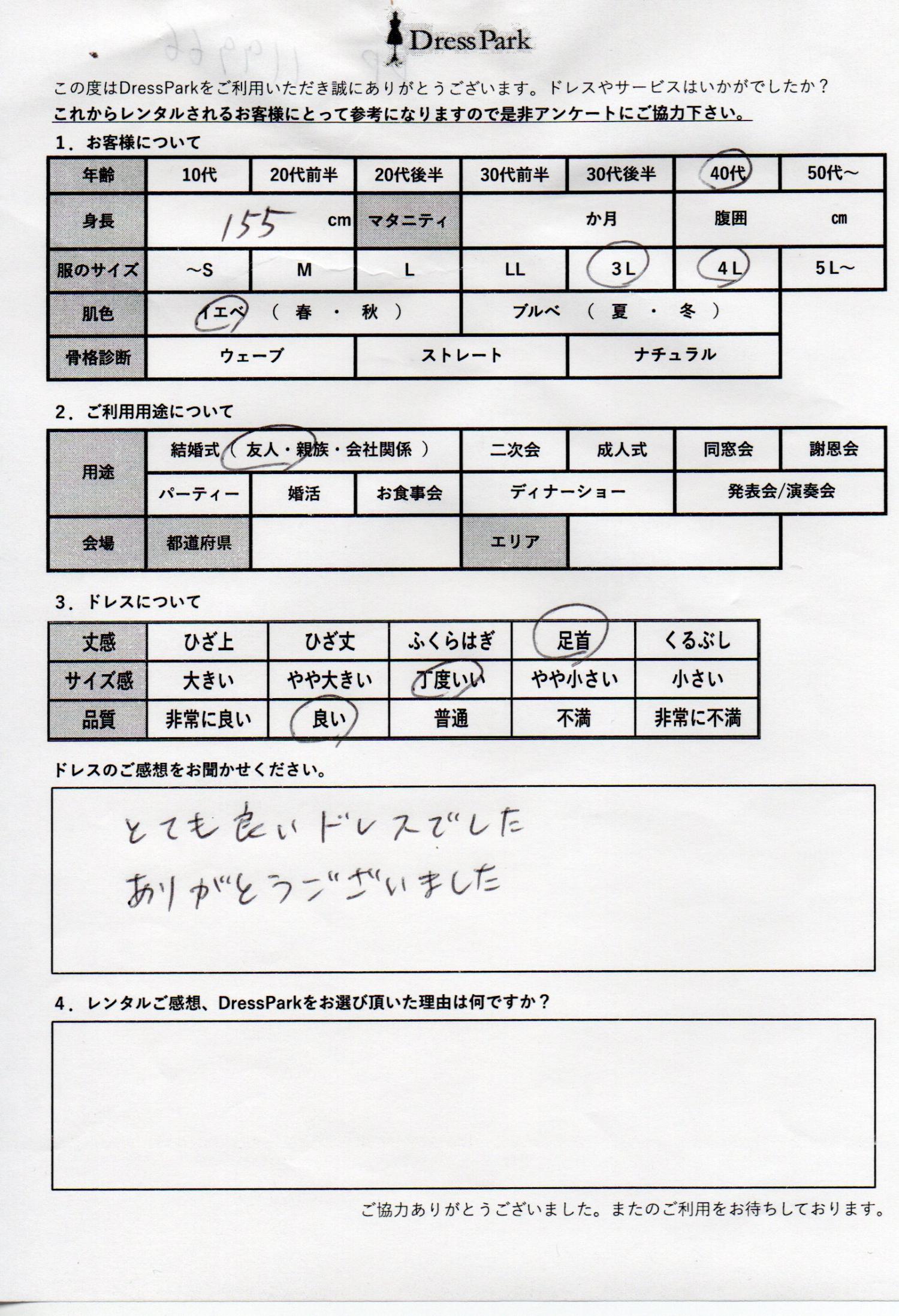 京都府 E.K様155㎝ 4Lサイズ #40代#大きいサイズLL~#155~159㎝#結婚式(友人)#京都府 ◆レンタルしたドレスはこちら ◆レンタルしたサイズは:5L ◆レンタルした日付:2025/12/06 ドレスの着用感 ◆点数: (4点) ◆丈感:足首 ◆サイズ感:丁度いい ◆品質:良い ◆肌色:イエベ ドレスの感想 とても良いドレスでした。ありがとうございました。 CUSTOMER REVIEWS お客様の声 気になるカテゴリー別にご利用の感想をチェック! ◆AGE 年代で見る 10代 20代 30代 40代 50代~ ◆SIZE サイズで見る SS/S M/L 大きいサイズLL~ ◆HIGHT 身長で見る 140~149㎝ 150~154㎝ 155~159㎝ 160~164㎝ 165~169㎝ 170㎝以上 ◆マタニティ ~3か月 4~6か月 7~8か月 9~10か月 ◆肌色 イエベ ブルべ ◆骨格診断 ウェーブ ストレート ナチュラル ◆利用シーン 結婚式(友人) 結婚式(親族) 結婚式(会社関係) 二次会 成人式 謝恩会 パーティー その他 CUSTOMER REVIEWS都道府県別お客様の声 都道府県別にのお客様の声をチェック! 北海道 青森県 岩手県 宮城県 秋田県 山形県 福島県 茨城県 栃木県 群馬県 埼玉県 千葉県 東京都 神奈川県 新潟県 富山県 石川県 福井県 山梨県 長野県 岐阜県 静岡県 愛知県 三重県 滋賀県 京都府 大阪府 兵庫県 奈良県 和歌山県 鳥取県 島根県 岡山県 広島県 山口県 徳島県 香川県 愛媛県 高知県 福岡県 佐賀県 長崎県 熊本県 大分県 宮崎県 鹿児島県 沖縄県 CUSTOMER REVIEWSエリア別お客様の声 都道府県別にのお客様の声をチェック! 札幌 仙台 名古屋 軽井沢 金沢 神戸・芦屋 博多 那覇 梅田・新大阪 難波・心斎橋 鎌倉・湘南 横浜・みなとみらい 舞浜・浦安・幕張 大宮・浦和 青山・表参道 六本木・麻布 渋谷・恵比寿 新宿 池袋 銀座・丸の内 お台場・汐留 鹿児島市 郡山市 福島市 東予 甲府・石和 LINEでお問い合わせ このサイトではJavaScriptを使用しています