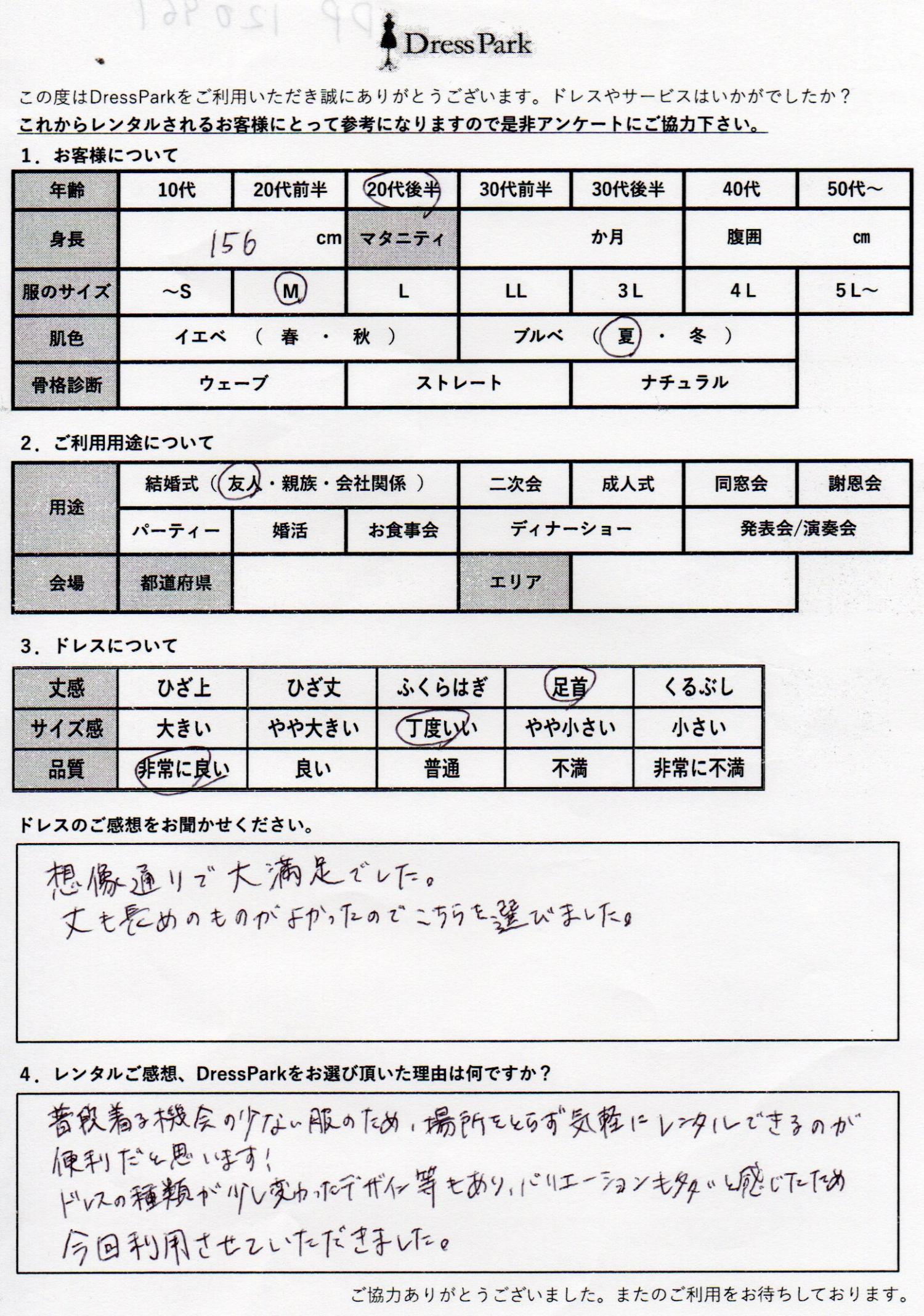 大阪府 A.K様156㎝ Mサイズ #20代#M/L#155~159㎝#結婚式(友人)#大阪府 ◆レンタルしたドレスはこちら ◆レンタルしたサイズは:M ◆レンタルした日付:2025/12/06 ドレスの着用感 ◆点数: (5点) ◆丈感:足首 ◆サイズ感:丁度いい ◆品質:非常に良い ◆肌色:ブルべ ドレスの感想 想像通りで大満足でした。丈も長めのものが良かったので、こちらを選びました。 レンタルのご感想、DressParkをお選び頂いた理由 普段着る機会の少ない服のため、場所を取らずに気軽にレンタルできるのが便利だと思います!ドレスの種類が少し変わったデザインなどもあり、バリエーションも多いと感じたため、今回利用させていただきました。 CUSTOMER REVIEWS お客様の声 気になるカテゴリー別にご利用の感想をチェック! ◆AGE 年代で見る 10代 20代 30代 40代 50代~ ◆SIZE サイズで見る SS/S M/L 大きいサイズLL~ ◆HIGHT 身長で見る 140~149㎝ 150~154㎝ 155~159㎝ 160~164㎝ 165~169㎝ 170㎝以上 ◆マタニティ ~3か月 4~6か月 7~8か月 9~10か月 ◆肌色 イエベ ブルべ ◆骨格診断 ウェーブ ストレート ナチュラル ◆利用シーン 結婚式(友人) 結婚式(親族) 結婚式(会社関係) 二次会 成人式 謝恩会 パーティー その他 CUSTOMER REVIEWS都道府県別お客様の声 都道府県別にのお客様の声をチェック! 北海道 青森県 岩手県 宮城県 秋田県 山形県 福島県 茨城県 栃木県 群馬県 埼玉県 千葉県 東京都 神奈川県 新潟県 富山県 石川県 福井県 山梨県 長野県 岐阜県 静岡県 愛知県 三重県 滋賀県 京都府 大阪府 兵庫県 奈良県 和歌山県 鳥取県 島根県 岡山県 広島県 山口県 徳島県 香川県 愛媛県 高知県 福岡県 佐賀県 長崎県 熊本県 大分県 宮崎県 鹿児島県 沖縄県 CUSTOMER REVIEWSエリア別お客様の声 都道府県別にのお客様の声をチェック! 札幌 仙台 名古屋 軽井沢 金沢 神戸・芦屋 博多 那覇 梅田・新大阪 難波・心斎橋 鎌倉・湘南 横浜・みなとみらい 舞浜・浦安・幕張 大宮・浦和 青山・表参道 六本木・麻布 渋谷・恵比寿 新宿 池袋 銀座・丸の内 お台場・汐留 鹿児島市 郡山市 福島市 東予 甲府・石和 LINEでお問い合わせ このサイトではJavaScriptを使用しています