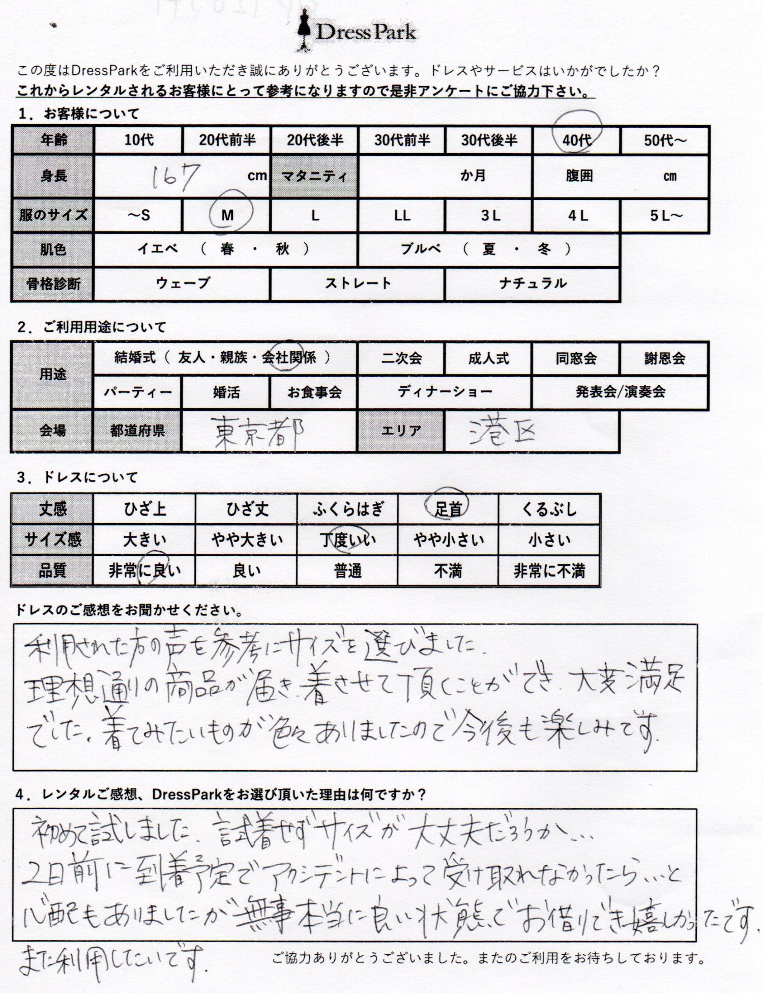 利用された方の声を参考にサイズを選びました。理想通りの商品が届き、着用させていただくことができ、大変満足でした。着てみたいものがいろいろありましたので、今後も楽しみです。