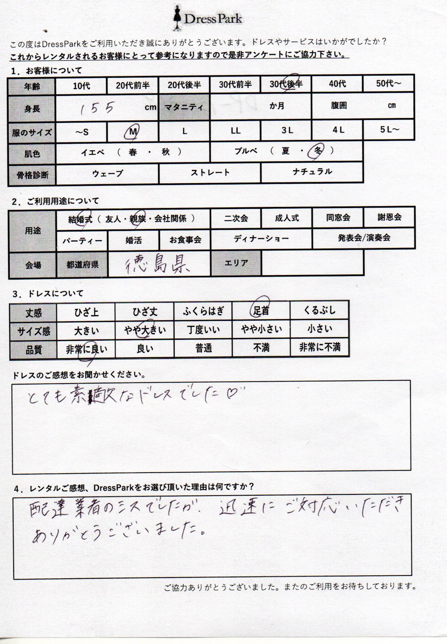 徳島県 S.K様155㎝ Mサイズ #30代#M/L#155~159㎝#結婚式(親族)#徳島県 ◆レンタルしたドレスはこちら ◆レンタルしたサイズは:M ◆レンタルした日付:2025/12/13 ドレスの着用感 ◆点数: (5点) ◆丈感:足首 ◆サイズ感:やや大きい ◆品質:非常に良い ◆肌色:ブルべ ドレスの感想 とても素敵なドレスでした。 レンタルのご感想、DressParkをお選び頂いた理由 配達業者のミスでしたが、迅速にご対応いただきありがとうございました。 CUSTOMER REVIEWS お客様の声 気になるカテゴリー別にご利用の感想をチェック! ◆AGE 年代で見る 10代 20代 30代 40代 50代~ ◆SIZE サイズで見る SS/S M/L 大きいサイズLL~ ◆HIGHT 身長で見る 140~149㎝ 150~154㎝ 155~159㎝ 160~164㎝ 165~169㎝ 170㎝以上 ◆マタニティ ~3か月 4~6か月 7~8か月 9~10か月 ◆肌色 イエベ ブルべ ◆骨格診断 ウェーブ ストレート ナチュラル ◆利用シーン 結婚式(友人) 結婚式(親族) 結婚式(会社関係) 二次会 成人式 謝恩会 パーティー その他 CUSTOMER REVIEWS都道府県別お客様の声 都道府県別にのお客様の声をチェック! 北海道 青森県 岩手県 宮城県 秋田県 山形県 福島県 茨城県 栃木県 群馬県 埼玉県 千葉県 東京都 神奈川県 新潟県 富山県 石川県 福井県 山梨県 長野県 岐阜県 静岡県 愛知県 三重県 滋賀県 京都府 大阪府 兵庫県 奈良県 和歌山県 鳥取県 島根県 岡山県 広島県 山口県 徳島県 香川県 愛媛県 高知県 福岡県 佐賀県 長崎県 熊本県 大分県 宮崎県 鹿児島県 沖縄県 CUSTOMER REVIEWSエリア別お客様の声 都道府県別にのお客様の声をチェック! 札幌 仙台 名古屋 軽井沢 金沢 神戸・芦屋 博多 那覇 梅田・新大阪 難波・心斎橋 鎌倉・湘南 横浜・みなとみらい 舞浜・浦安・幕張 大宮・浦和 青山・表参道 六本木・麻布 渋谷・恵比寿 新宿 池袋 銀座・丸の内 お台場・汐留 鹿児島市 郡山市 福島市 東予 甲府・石和 LINEでお問い合わせ このサイトではJavaScriptを使用しています