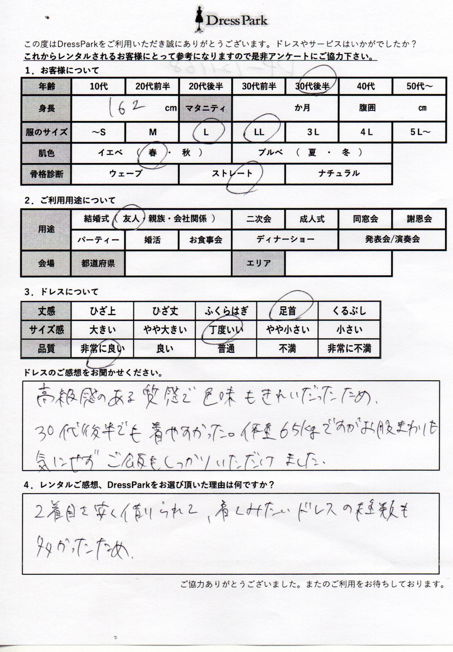 大阪府 M.K様162㎝ Lサイズ #30代#M/L#160~164㎝#結婚式(友人)#大阪府 ◆レンタルしたドレスはこちら ◆レンタルしたサイズは:L ◆レンタルした日付:2025/12/13 ドレスの着用感 ◆点数: (5点) ◆丈感:足首 ◆サイズ感:丁度いい ◆品質:非常に良い ◆肌色:イエベ ◆骨格診断:ストレート ドレスの感想 高級感のある質感で色味も綺麗だったため。30代後半でも着やすかった。体重65キロですが、お腹周りも気にせずご飯もしっかりいただけました。 レンタルのご感想、DressParkをお選び頂いた理由 2着目を安く借りられて、着てみたいドレスの種類も多かったため。 CUSTOMER REVIEWS お客様の声 気になるカテゴリー別にご利用の感想をチェック! ◆AGE 年代で見る 10代 20代 30代 40代 50代~ ◆SIZE サイズで見る SS/S M/L 大きいサイズLL~ ◆HIGHT 身長で見る 140~149㎝ 150~154㎝ 155~159㎝ 160~164㎝ 165~169㎝ 170㎝以上 ◆マタニティ ~3か月 4~6か月 7~8か月 9~10か月 ◆肌色 イエベ ブルべ ◆骨格診断 ウェーブ ストレート ナチュラル ◆利用シーン 結婚式(友人) 結婚式(親族) 結婚式(会社関係) 二次会 成人式 謝恩会 パーティー その他 CUSTOMER REVIEWS都道府県別お客様の声 都道府県別にのお客様の声をチェック! 北海道 青森県 岩手県 宮城県 秋田県 山形県 福島県 茨城県 栃木県 群馬県 埼玉県 千葉県 東京都 神奈川県 新潟県 富山県 石川県 福井県 山梨県 長野県 岐阜県 静岡県 愛知県 三重県 滋賀県 京都府 大阪府 兵庫県 奈良県 和歌山県 鳥取県 島根県 岡山県 広島県 山口県 徳島県 香川県 愛媛県 高知県 福岡県 佐賀県 長崎県 熊本県 大分県 宮崎県 鹿児島県 沖縄県 CUSTOMER REVIEWSエリア別お客様の声 都道府県別にのお客様の声をチェック! 札幌 仙台 名古屋 軽井沢 金沢 神戸・芦屋 博多 那覇 梅田・新大阪 難波・心斎橋 鎌倉・湘南 横浜・みなとみらい 舞浜・浦安・幕張 大宮・浦和 青山・表参道 六本木・麻布 渋谷・恵比寿 新宿 池袋 銀座・丸の内 お台場・汐留 鹿児島市 郡山市 福島市 東予 甲府・石和 LINEでお問い合わせ このサイトではJavaScriptを使用しています