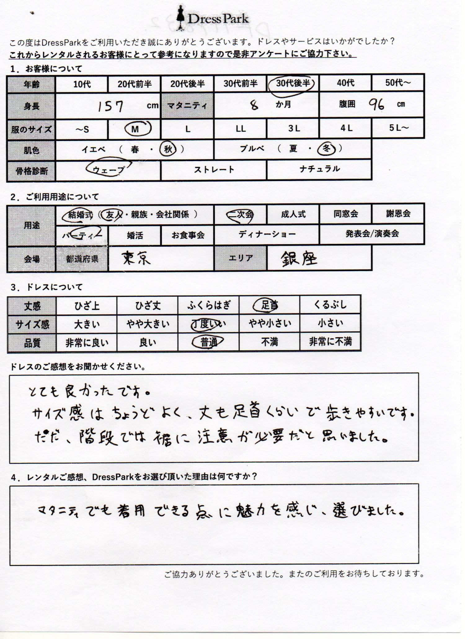 東京都 N.S様157㎝ Mサイズ銀座・丸の内 マタニティ #30代#M/L#155~159㎝#結婚式(友人)#東京都#銀座・丸の内 ◆レンタルしたドレスはこちら ◆レンタルしたサイズは:M ◆レンタルした日付:2025/12/13 ドレスの着用感 ◆点数: (4点) ◆丈感:足首 ◆サイズ感:丁度いい ◆品質:普通 ◆マタニティ:8ヶ月 腹囲96cm ◆肌色:イエベ ◆骨格診断:ウェーブ ドレスの感想 とても良かったです。サイズ感はちょうど良く、丈も足首位で歩きやすいです。ただ、階段では裾に注意が必要だと思いました。 レンタルのご感想、DressParkをお選び頂いた理由 マタニティーでも着用できる点に魅力を感じ選びました。 CUSTOMER REVIEWS お客様の声 気になるカテゴリー別にご利用の感想をチェック! ◆AGE 年代で見る 10代 20代 30代 40代 50代~ ◆SIZE サイズで見る SS/S M/L 大きいサイズLL~ ◆HIGHT 身長で見る 140~149㎝ 150~154㎝ 155~159㎝ 160~164㎝ 165~169㎝ 170㎝以上 ◆マタニティ ~3か月 4~6か月 7~8か月 9~10か月 ◆肌色 イエベ ブルべ ◆骨格診断 ウェーブ ストレート ナチュラル ◆利用シーン 結婚式(友人) 結婚式(親族) 結婚式(会社関係) 二次会 成人式 謝恩会 パーティー その他 CUSTOMER REVIEWS都道府県別お客様の声 都道府県別にのお客様の声をチェック! 北海道 青森県 岩手県 宮城県 秋田県 山形県 福島県 茨城県 栃木県 群馬県 埼玉県 千葉県 東京都 神奈川県 新潟県 富山県 石川県 福井県 山梨県 長野県 岐阜県 静岡県 愛知県 三重県 滋賀県 京都府 大阪府 兵庫県 奈良県 和歌山県 鳥取県 島根県 岡山県 広島県 山口県 徳島県 香川県 愛媛県 高知県 福岡県 佐賀県 長崎県 熊本県 大分県 宮崎県 鹿児島県 沖縄県 CUSTOMER REVIEWSエリア別お客様の声 都道府県別にのお客様の声をチェック! 札幌 仙台 名古屋 軽井沢 金沢 神戸・芦屋 博多 那覇 梅田・新大阪 難波・心斎橋 鎌倉・湘南 横浜・みなとみらい 舞浜・浦安・幕張 大宮・浦和 青山・表参道 六本木・麻布 渋谷・恵比寿 新宿 池袋 銀座・丸の内 お台場・汐留 鹿児島市 郡山市 福島市 東予 甲府・石和 LINEでお問い合わせ このサイトではJavaScriptを使用しています