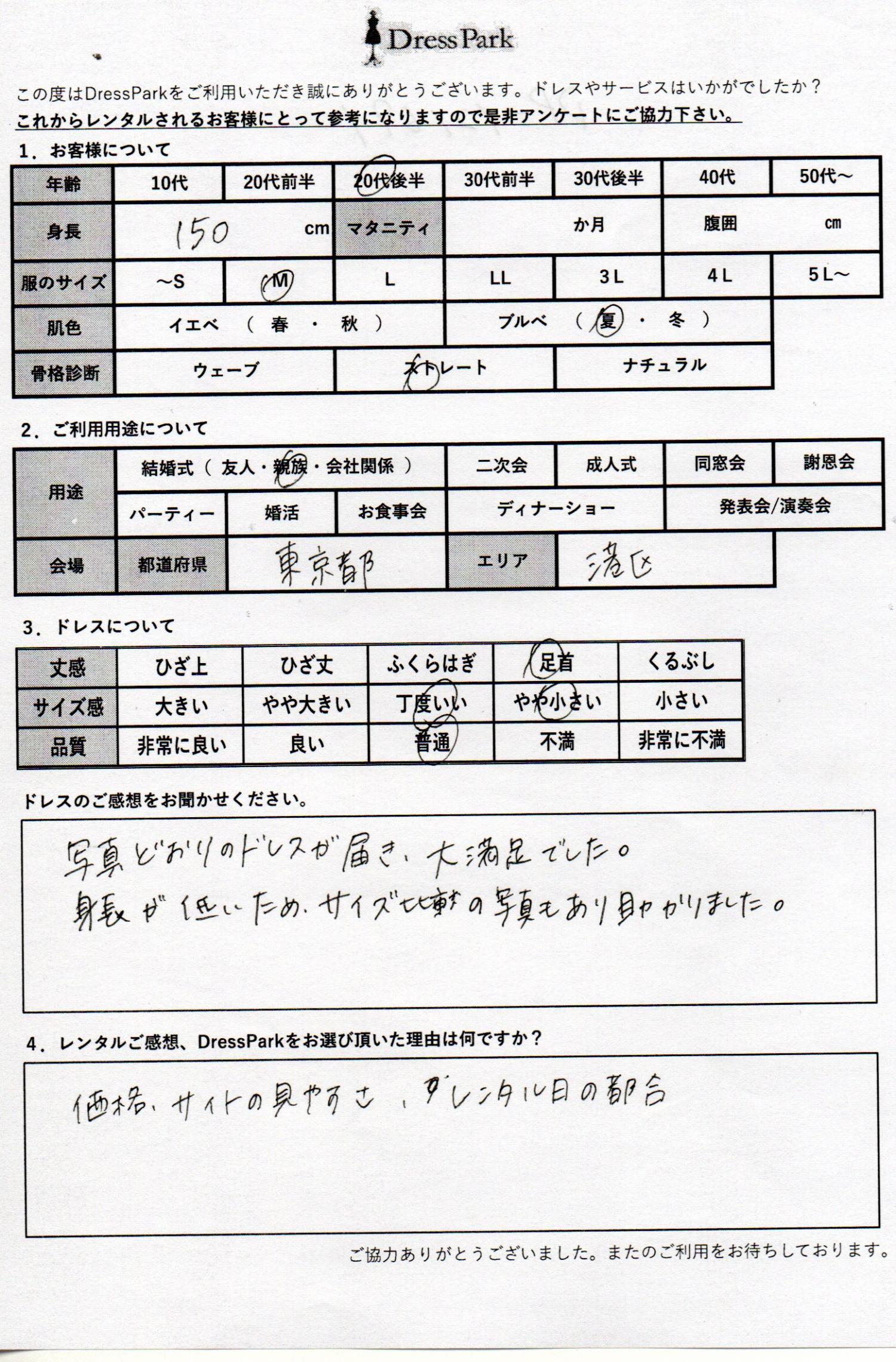 東京都 A.S様150㎝ Mサイズ六本木・麻布 #20代#M/L#150~154㎝#結婚式(親族)#東京都#六本木・麻布 ◆レンタルしたドレスはこちら ◆レンタルしたサイズは:M ◆レンタルした日付:2025/12/13 ドレスの着用感 ◆点数: (5点) ◆丈感:足首 ◆サイズ感:やや小さい ◆品質:普通 ◆肌色:ブルべ ◆骨格診断:ストレート ドレスの感想 写真通りのドレスが届き大満足でした。身長が低いため、サイズ比較の写真もあり助かりました。 レンタルのご感想、DressParkをお選び頂いた理由 価格、サイトの見やすさ、レンタル日の都合。 CUSTOMER REVIEWS お客様の声 気になるカテゴリー別にご利用の感想をチェック! ◆AGE 年代で見る 10代 20代 30代 40代 50代~ ◆SIZE サイズで見る SS/S M/L 大きいサイズLL~ ◆HIGHT 身長で見る 140~149㎝ 150~154㎝ 155~159㎝ 160~164㎝ 165~169㎝ 170㎝以上 ◆マタニティ ~3か月 4~6か月 7~8か月 9~10か月 ◆肌色 イエベ ブルべ ◆骨格診断 ウェーブ ストレート ナチュラル ◆利用シーン 結婚式(友人) 結婚式(親族) 結婚式(会社関係) 二次会 成人式 謝恩会 パーティー その他 CUSTOMER REVIEWS都道府県別お客様の声 都道府県別にのお客様の声をチェック! 北海道 青森県 岩手県 宮城県 秋田県 山形県 福島県 茨城県 栃木県 群馬県 埼玉県 千葉県 東京都 神奈川県 新潟県 富山県 石川県 福井県 山梨県 長野県 岐阜県 静岡県 愛知県 三重県 滋賀県 京都府 大阪府 兵庫県 奈良県 和歌山県 鳥取県 島根県 岡山県 広島県 山口県 徳島県 香川県 愛媛県 高知県 福岡県 佐賀県 長崎県 熊本県 大分県 宮崎県 鹿児島県 沖縄県 CUSTOMER REVIEWSエリア別お客様の声 都道府県別にのお客様の声をチェック! 札幌 仙台 名古屋 軽井沢 金沢 神戸・芦屋 博多 那覇 梅田・新大阪 難波・心斎橋 鎌倉・湘南 横浜・みなとみらい 舞浜・浦安・幕張 大宮・浦和 青山・表参道 六本木・麻布 渋谷・恵比寿 新宿 池袋 銀座・丸の内 お台場・汐留 鹿児島市 郡山市 福島市 東予 甲府・石和 LINEでお問い合わせ このサイトではJavaScriptを使用しています
